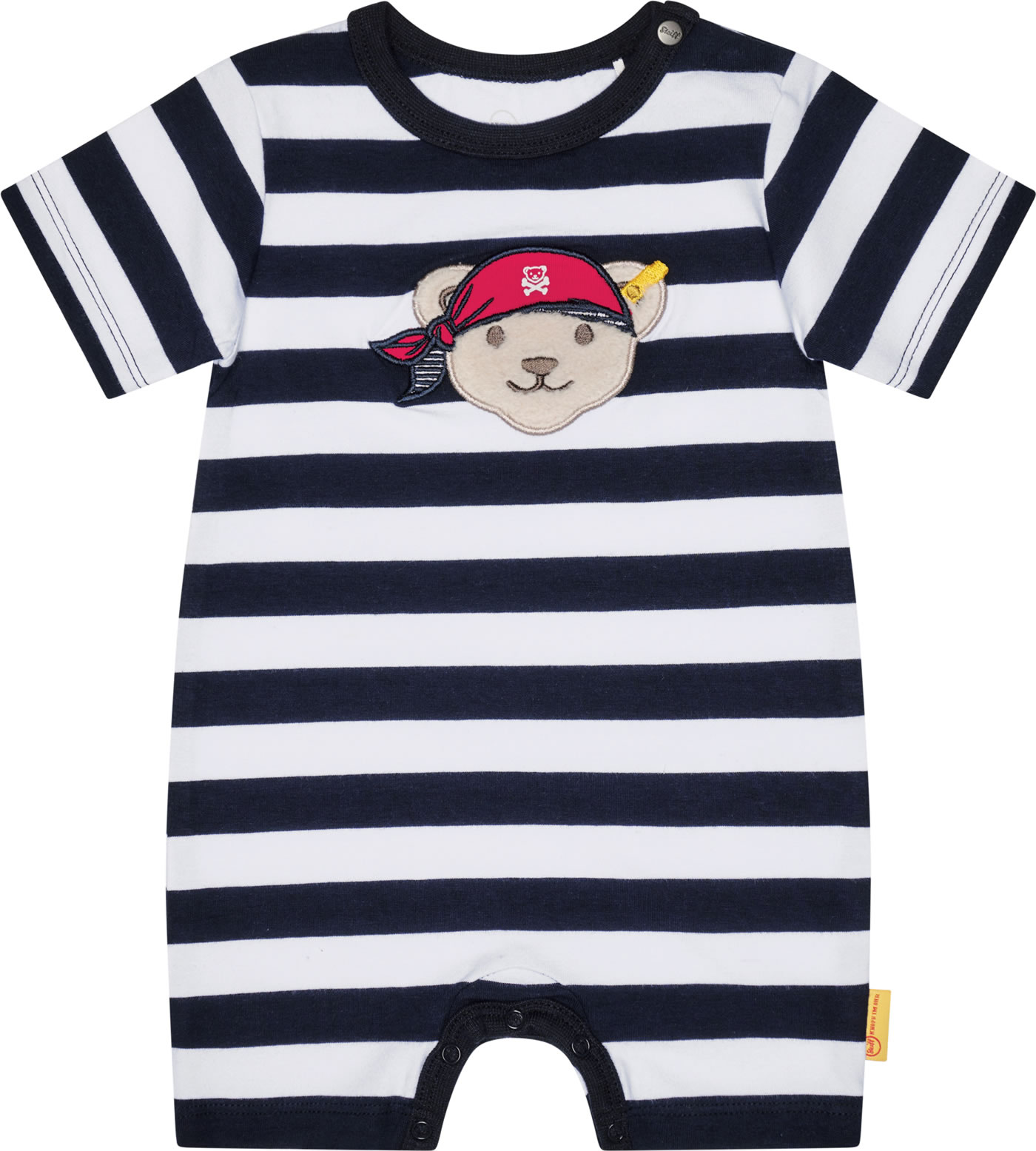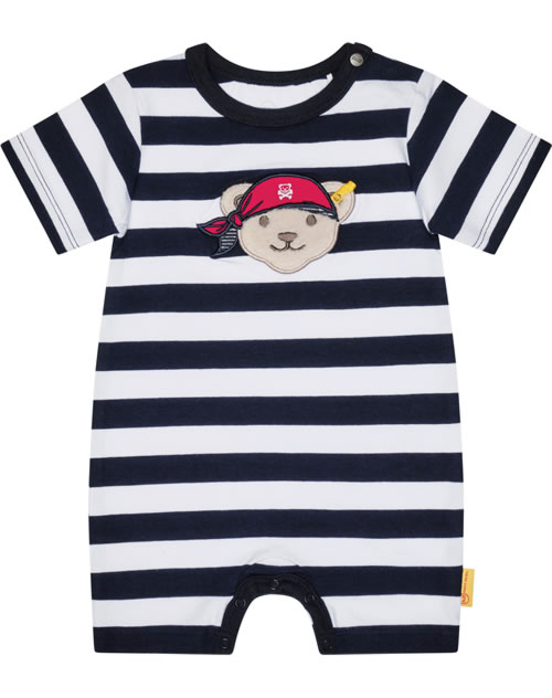 Kurzer Spielanzug für Jungen aus der Under the Surface-Kollektion von STEIFF. Der Strampler aus weichem Jersey wird mit Drucknöpfen auf der Schulter und im Schritt verschlossen. Besonders schöne Details sind das Streifenmuster und der große STEIFF Bär mit Piratenkopftuch auf der Brust.