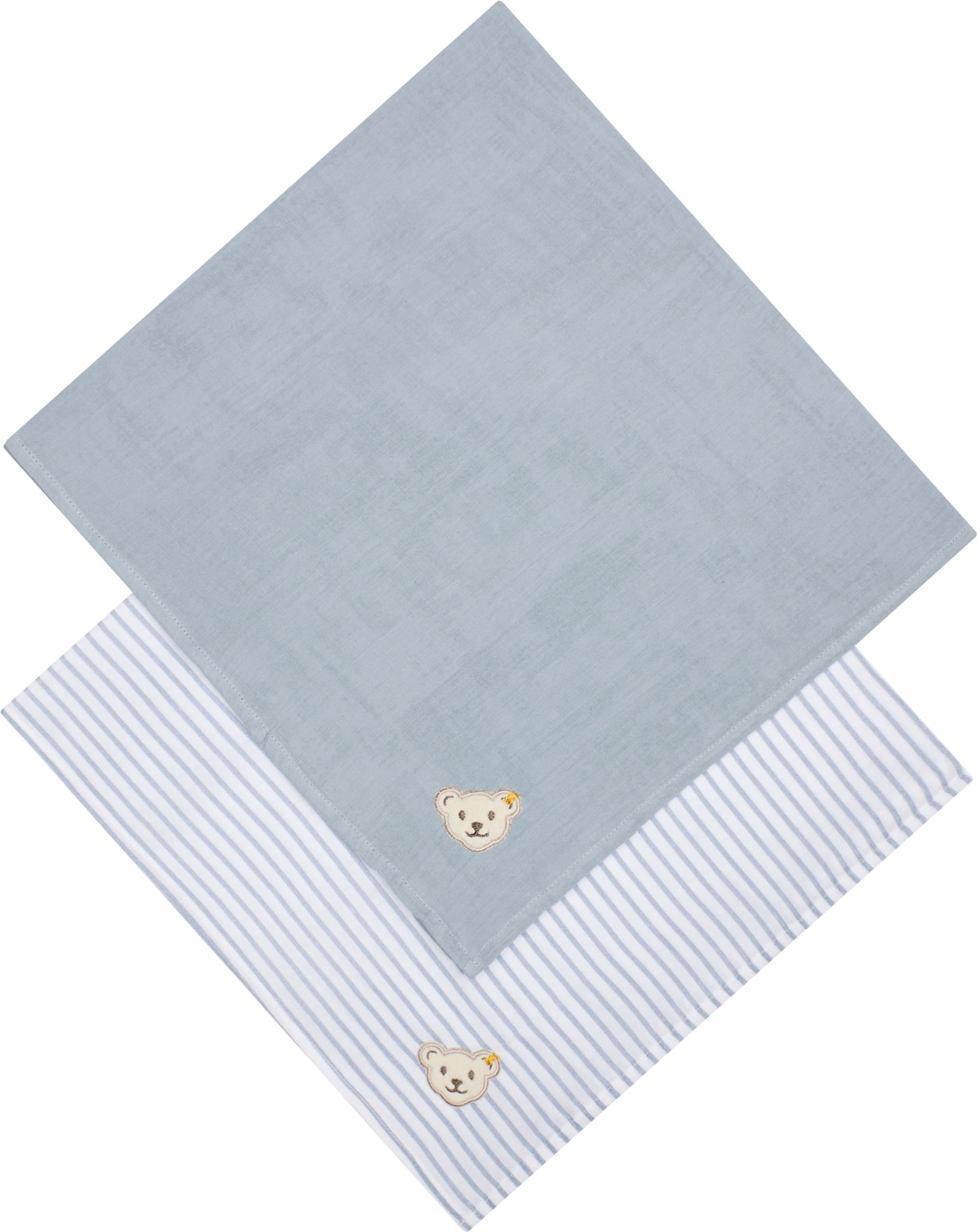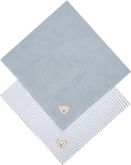 Ein schönes Geschenk zur Geburt sind diese 2 Tücher in einem hübschen Stoffbeutel von STEIFF. Die Tücher sind in uni oder mit Streifen gearbeitet und haben einen kleinen Steiff-Patch an einer Ecke. Sie eignen sich hervorragend als Spucktücher, Schmusetücher oder als Mullwindel.
