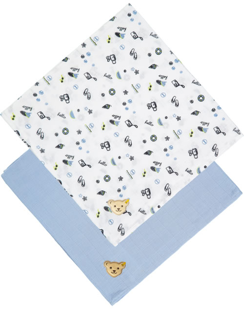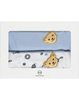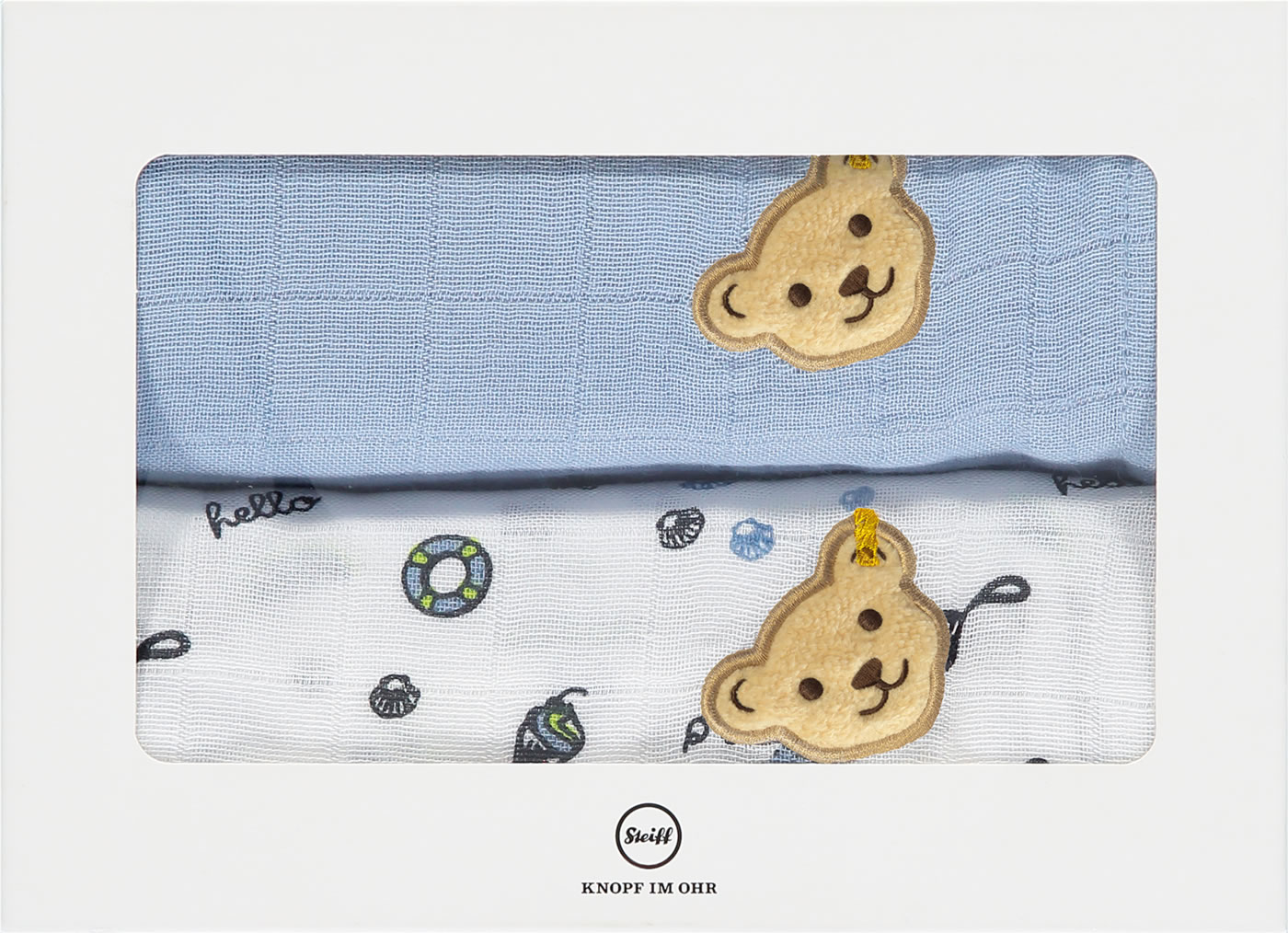 Ein schönes Geschenk zur Geburt sind diese 2 Tücher in einer hübschen Präsent-Box. Die Tücher in weiß und blau sind mit dem STEIFF Bären verziert. Sie eignen sich hervorragend als Spucktücher, Schmusetücher oder als Mullwindel.