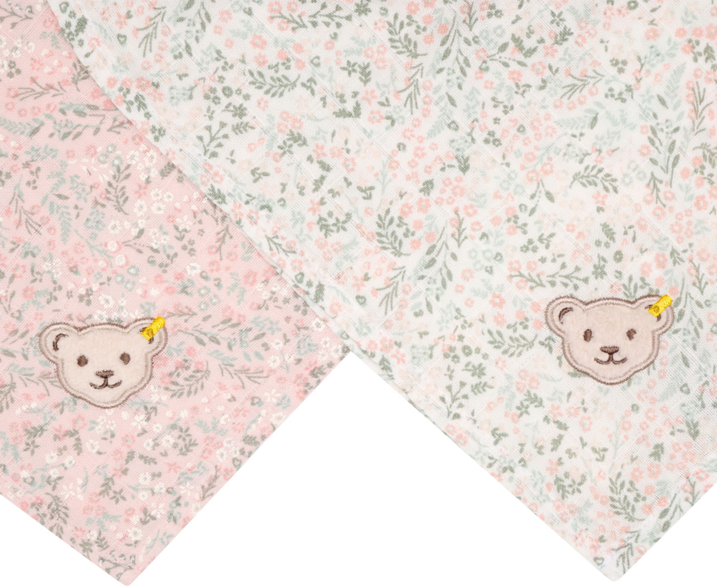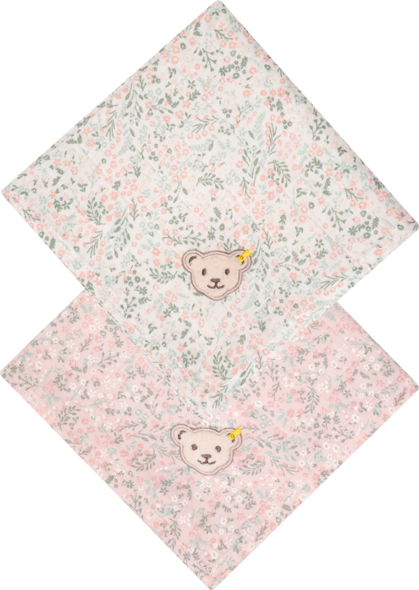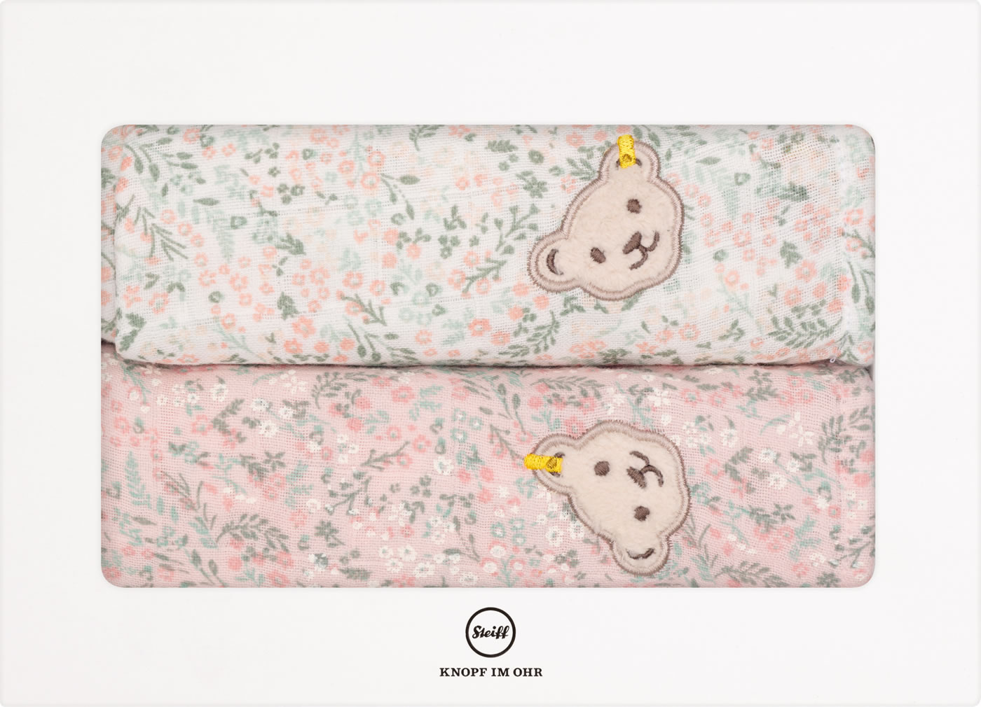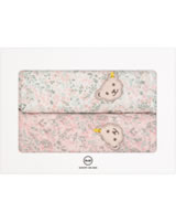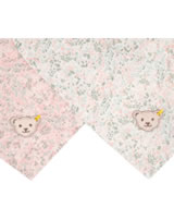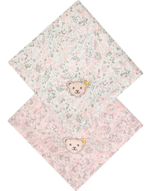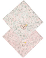 Ein schönes Geschenk zur Geburt sind diese 2 Tücher in einer hübschen Präsent-Box. Die geblümten Tücher sind mit dem STEIFF Bären verziert. Sie eignen sich hervorragend als Spucktücher, Schmusetücher oder als Mullwindel.