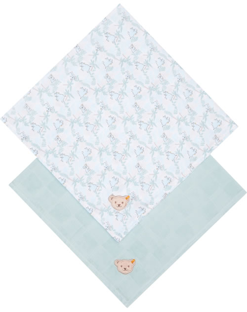 Ein schönes Geschenk zur Geburt sind diese 2 Tücher. Die Tücher in uni und mit einem tollen Urwaldmuster mit Koalas und Nilpferden sind mit dem STEIFF Bären verziert. Sie eignen sich hervorragend als Spucktücher, Schmusetücher oder als Mullwindel. Die Tücher ist in einem praktischen Baumwollsäckchen verpackt.
