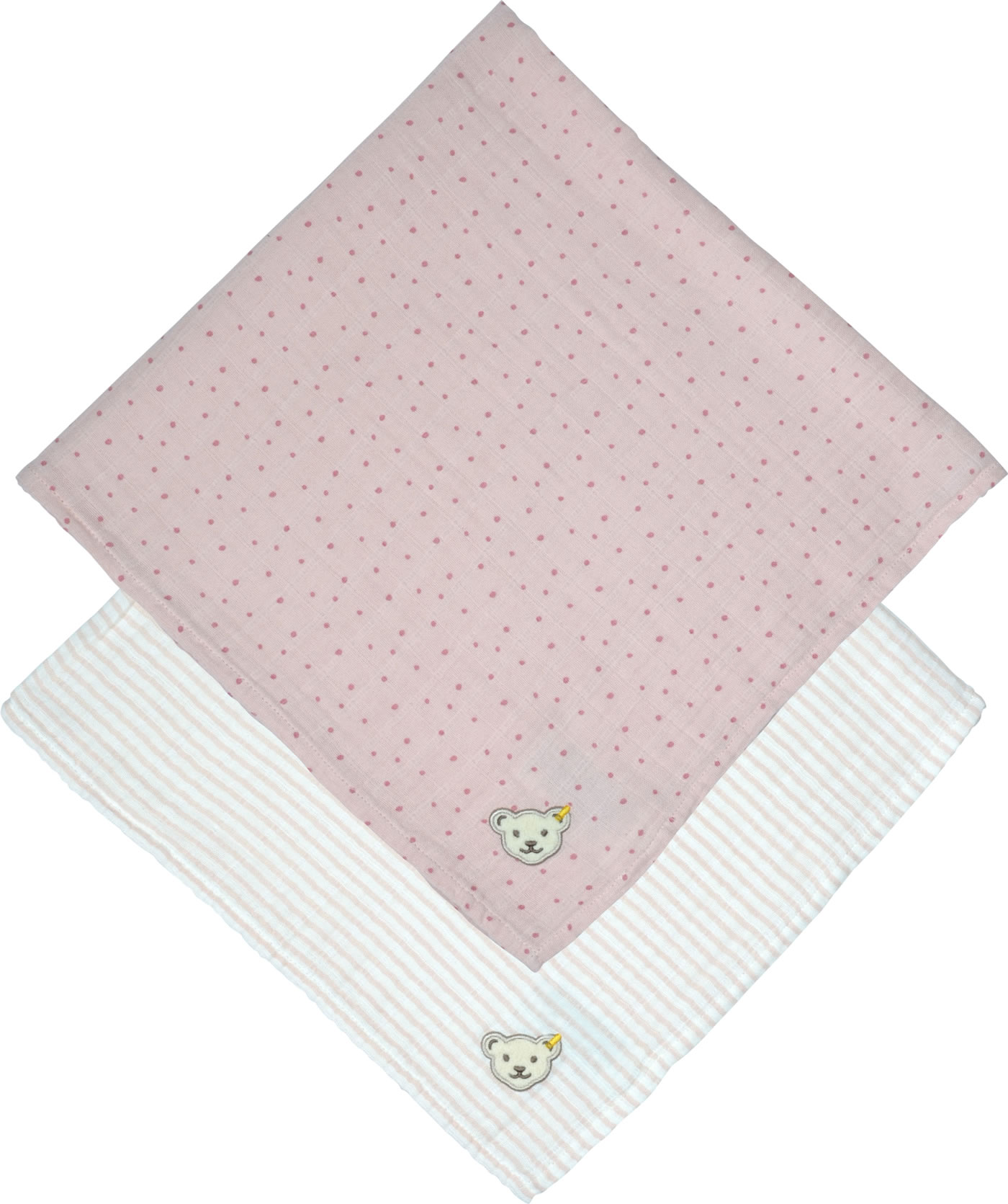 Ein schönes Geschenk zur Geburt sind diese 2 Tücher in einer hübschen Präsent-Box. Die Tücher in gepunktet und gestreift sind mit dem STEIFF Bären verziert. Sie eignen sich hervorragend als Spucktücher, Schmusetücher oder als Mullwindel.