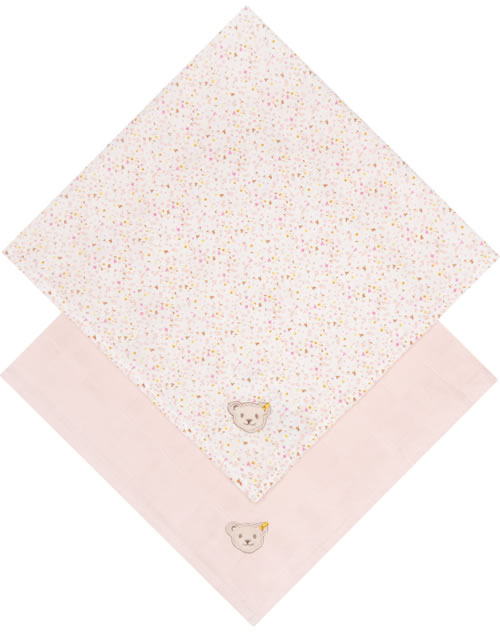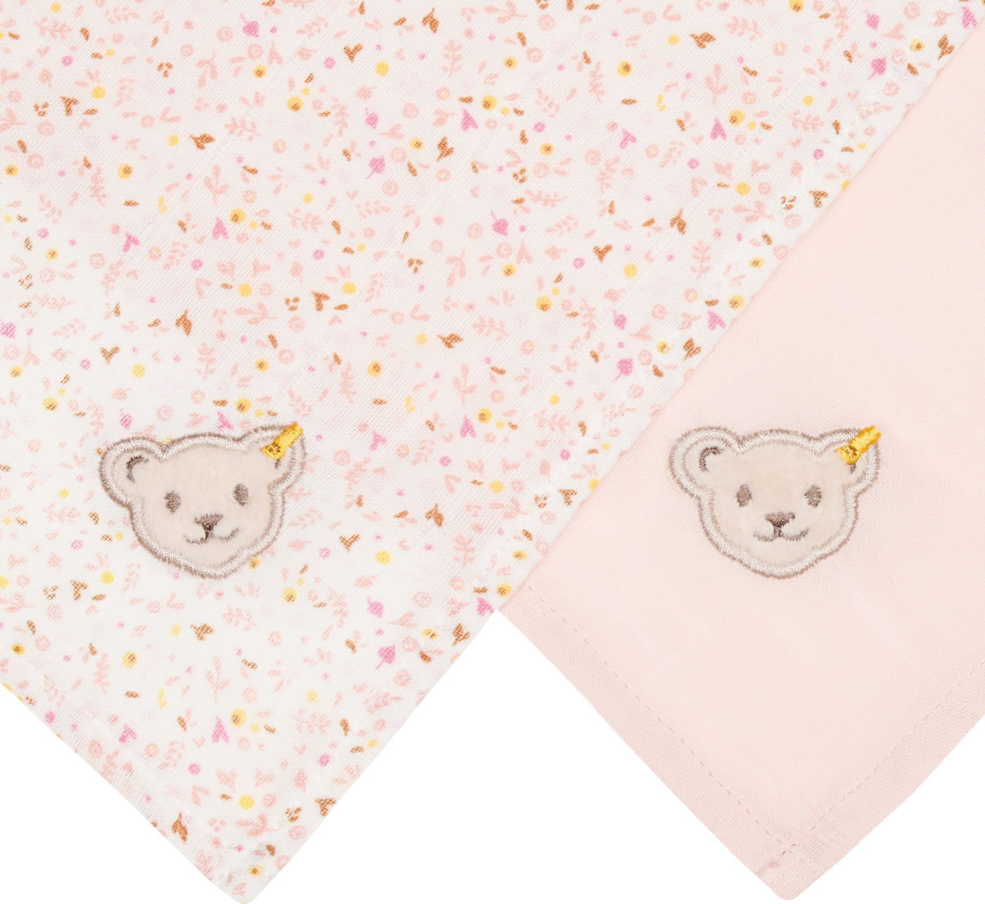 Ein schönes Geschenk zur Geburt sind diese 2 Tücher. Die Tücher in uni und mit einem zarten Blumenmuster sind mit dem STEIFF Bären verziert. Sie eignen sich hervorragend als Spucktücher, Schmusetücher oder als Mullwindel. Die Tücher ist in einem praktischen Baumwollsäckchen verpackt.