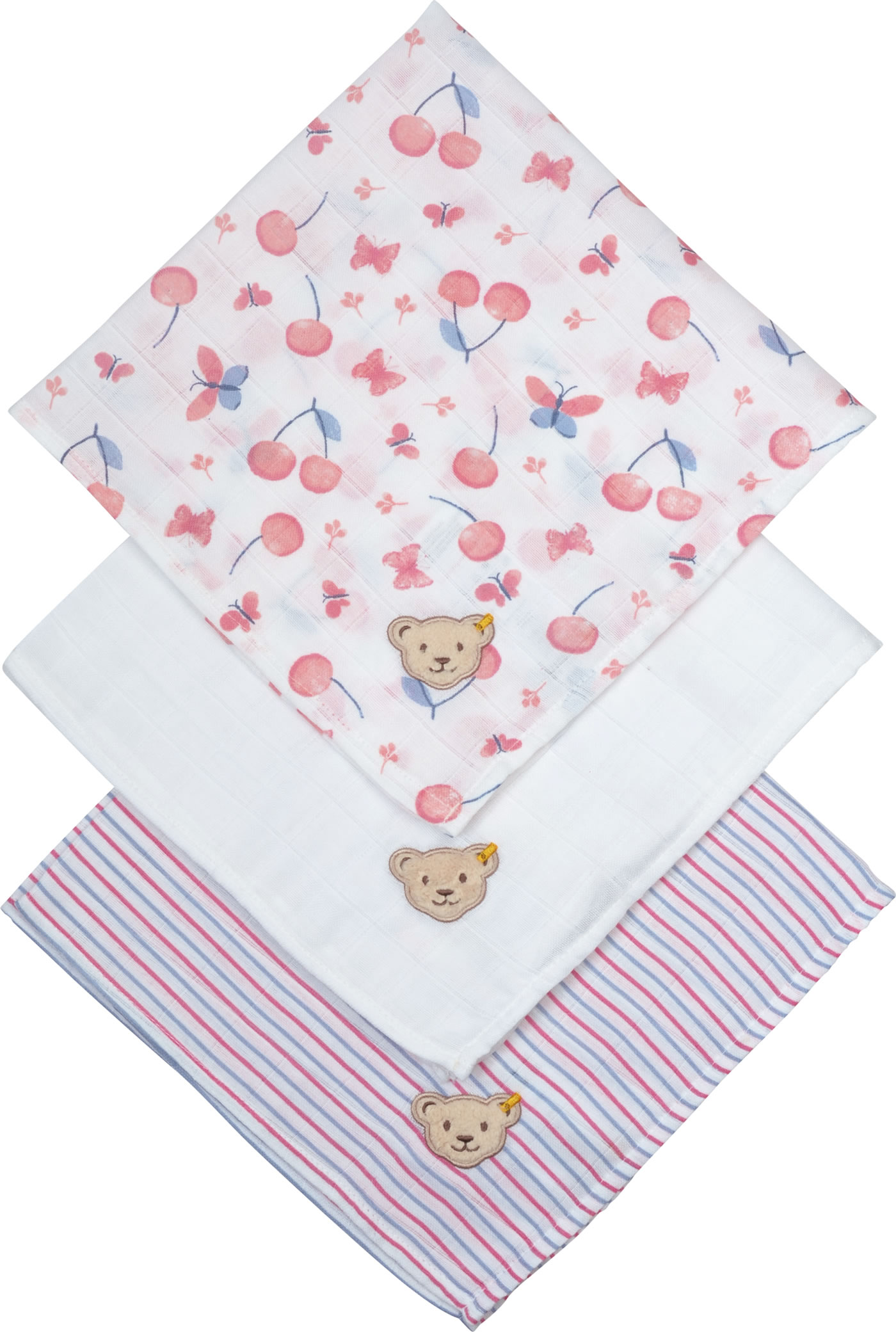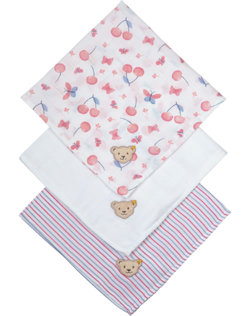 Ein schönes Geschenk zur Geburt sind diese 3 Tücher in einer hübschen Präsent-Box. Die Tücher in uni weiß, blau, rosa und weiß geringelt und weiß mit Kirschen-Motiven sind mit dem STEIFF Bären verziert. Sie eignen sich hervorragend als Spucktücher, Schmusetücher oder als Mullwindel.