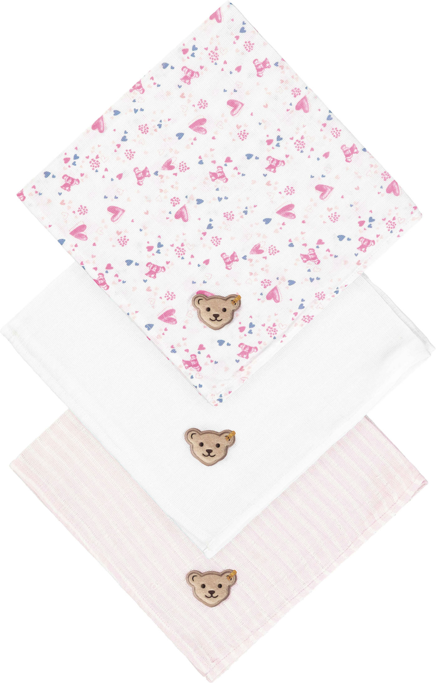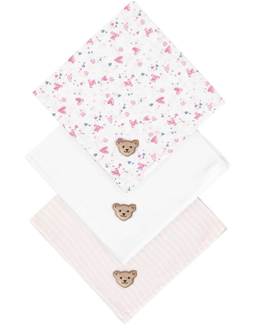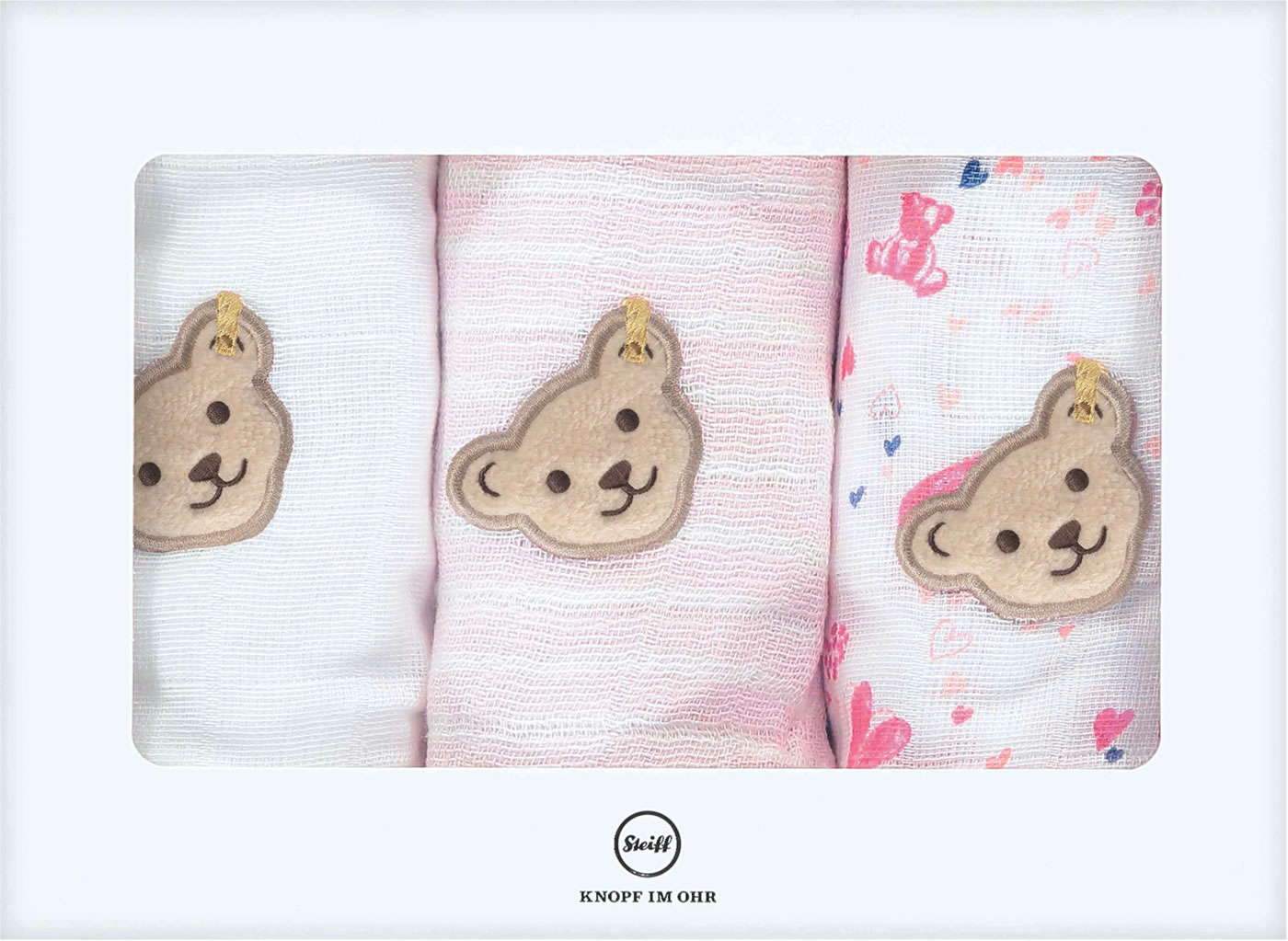 Ein schönes Geschenk zur Geburt sind diese 3 Tücher in einer hübschen Präsent-Box. Die Tücher in uni weiß, pink und weiß gestreift und mit Herz-Muster sind mit dem STEIFF Bären verziert. Sie eignen sich hervorragend als Spucktücher, Schmusetücher oder als Mullwindel.