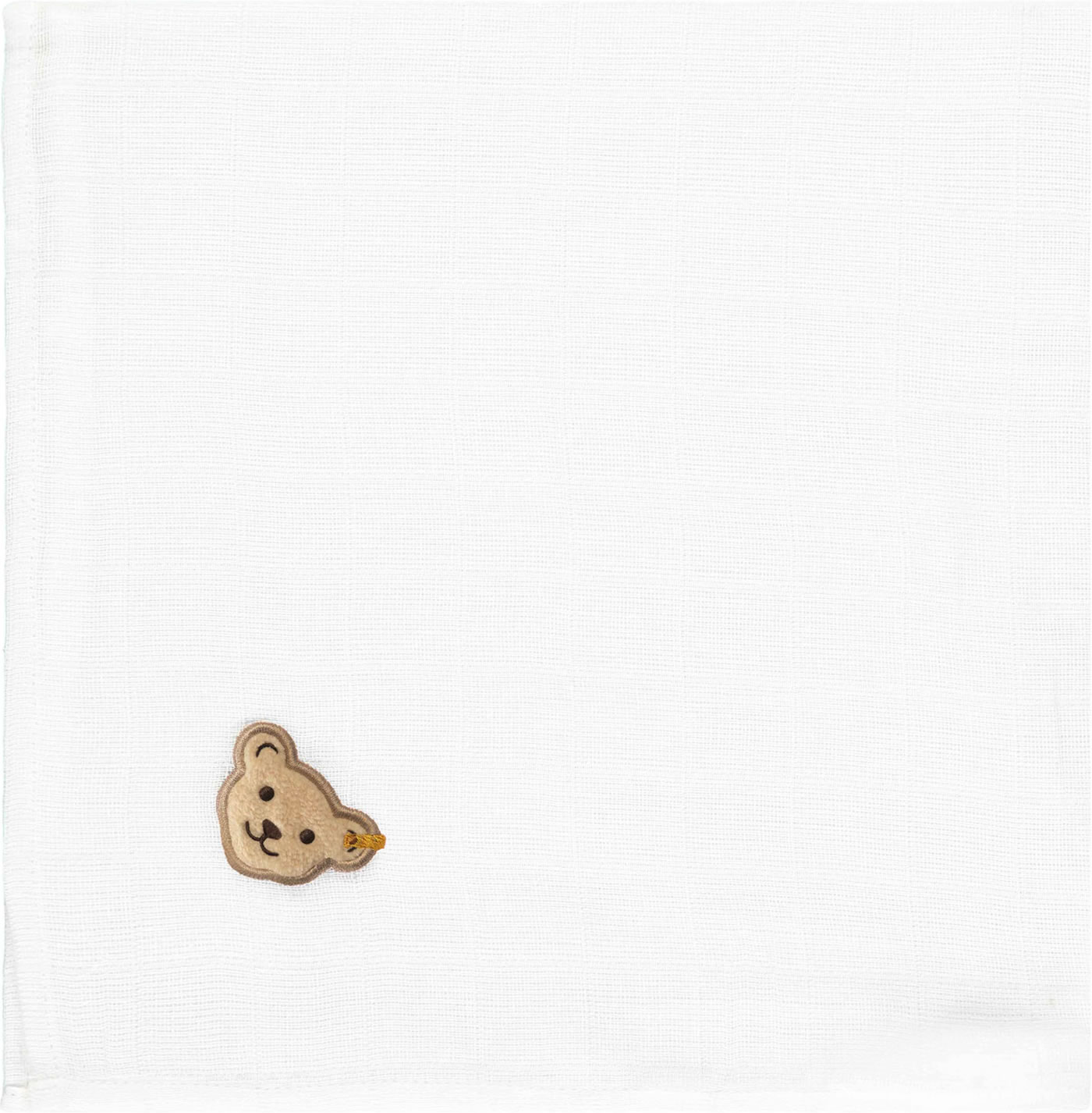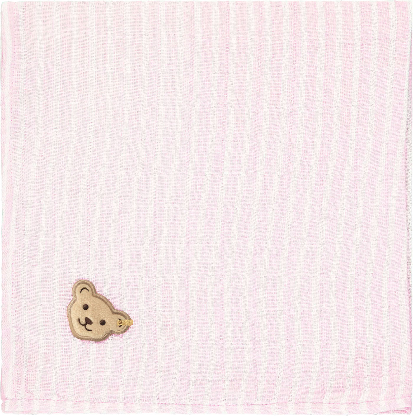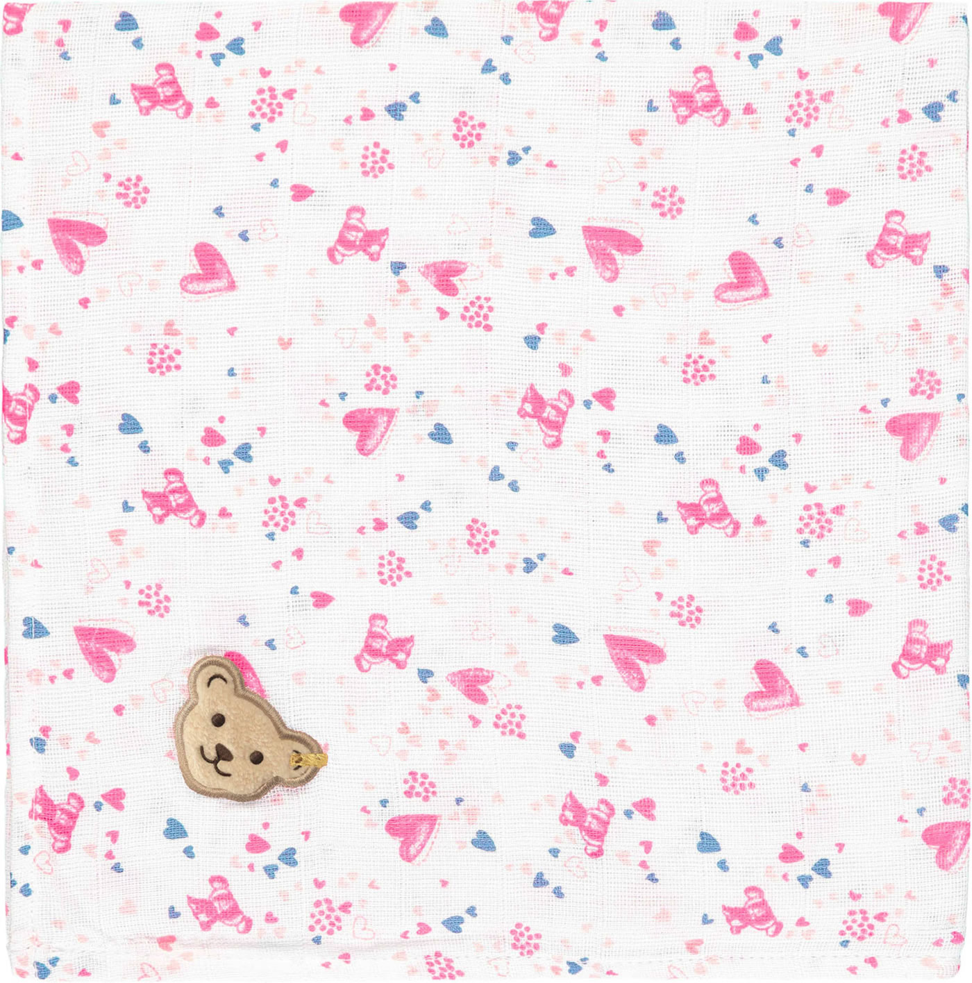Ein schönes Geschenk zur Geburt sind diese 3 Tücher in einer hübschen Präsent-Box. Die Tücher in uni weiß, pink und weiß gestreift und mit Herz-Muster sind mit dem STEIFF Bären verziert. Sie eignen sich hervorragend als Spucktücher, Schmusetücher oder als Mullwindel.