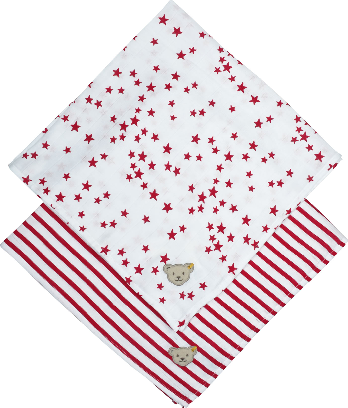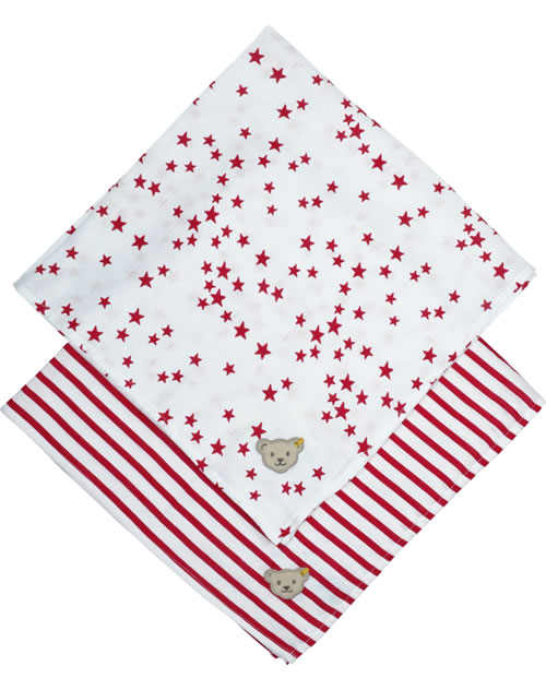 Ein schönes Geschenk zur Geburt sind diese 2 Tücher in einer hübschen Präsent-Box. Die Tücher sind mit dem STEIFF Bären verziert. Sie eignen sich hervorragend als Spucktücher, Schmusetücher oder als Mullwindel.