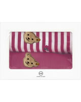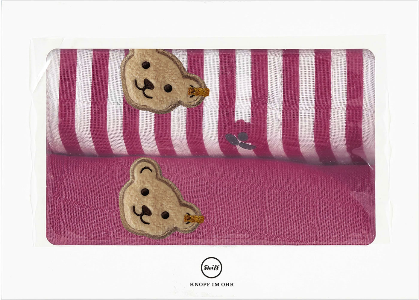 Ein schönes Geschenk zur Geburt sind diese 2 Tücher in einer hübschen Präsent-Box. Die Tücher in uni pink und geringelt mit Blumenmuster sind mit dem STEIFF Bären verziert. Sie eignen sich hervorragend als Spucktücher, Schmusetücher oder als Mullwindel.