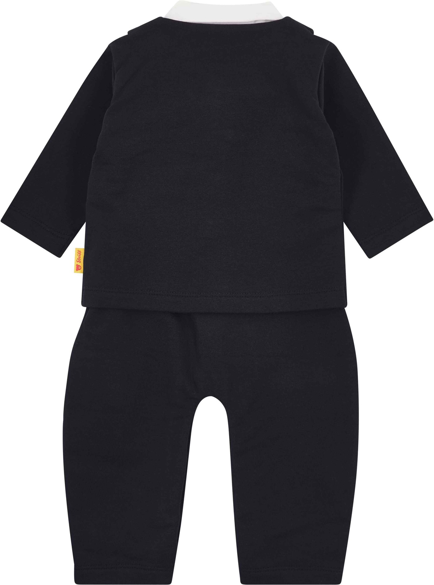 Der weiche Sweat-Stoff bietet angenehmen Tragekomfort, während die angedeutete Jacke mit Reverskragen und der eingenähte Hemdkragen samt Mini-Krawatte für einen stilvollen Auftritt sorgen. 🙂