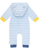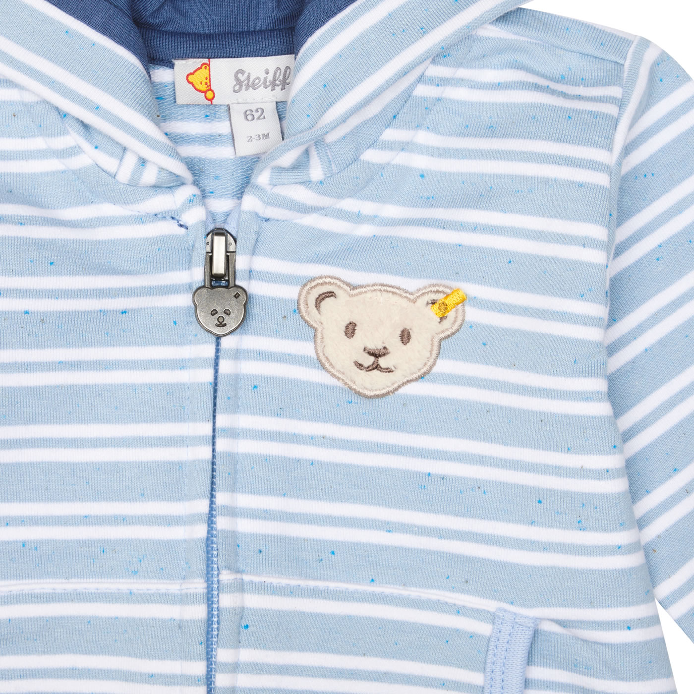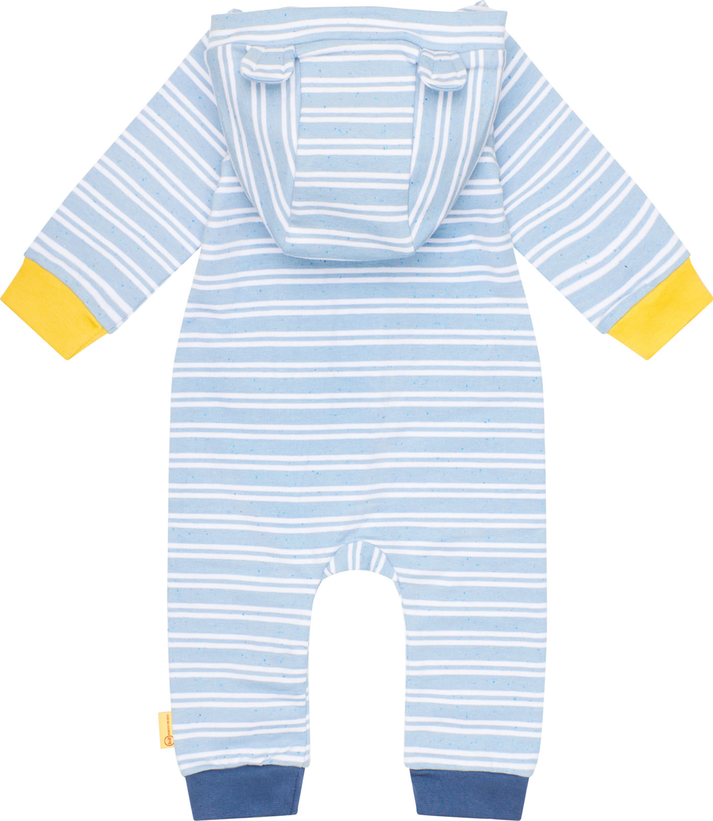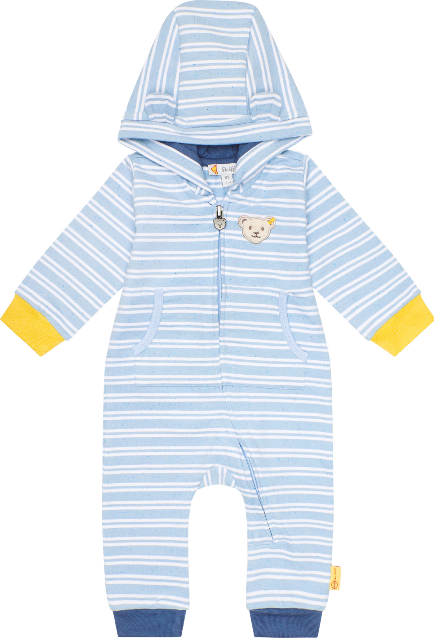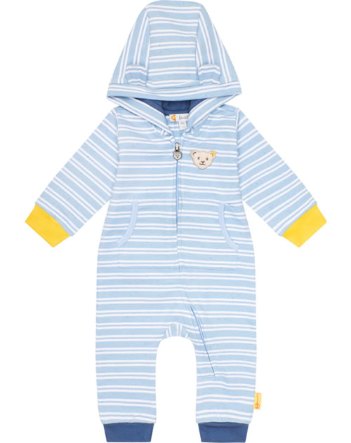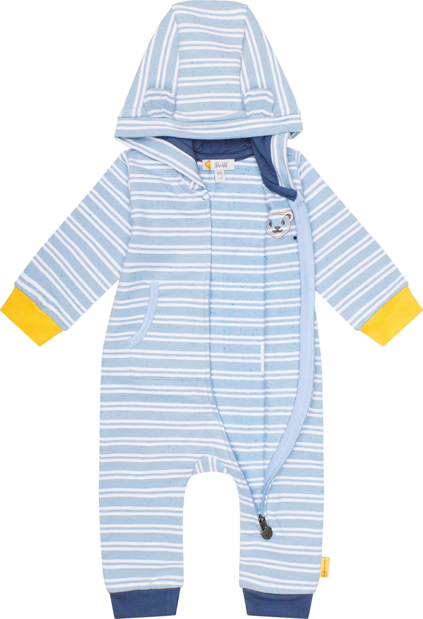 Gestreifter Langarm-Strampler für Jungen aus der Elephant Ride-Kollektion von STEIFF. Der durchgehende Reißverschluss erleichtert das An- und Ausziehen. Der Sweat-Stoff ist durchzogen von kleinen Punkten, die dem Strampler ein besonderes Design verleihen. Schöne Detaiks sind die farblich abgesetzten Bündchen an Ärmeln und Beinen und die Bären-Ohren an der gefütterten Kapuze. Die Vorderseite zeiren Bauchtaschen und der kleine STEIFF Bär.