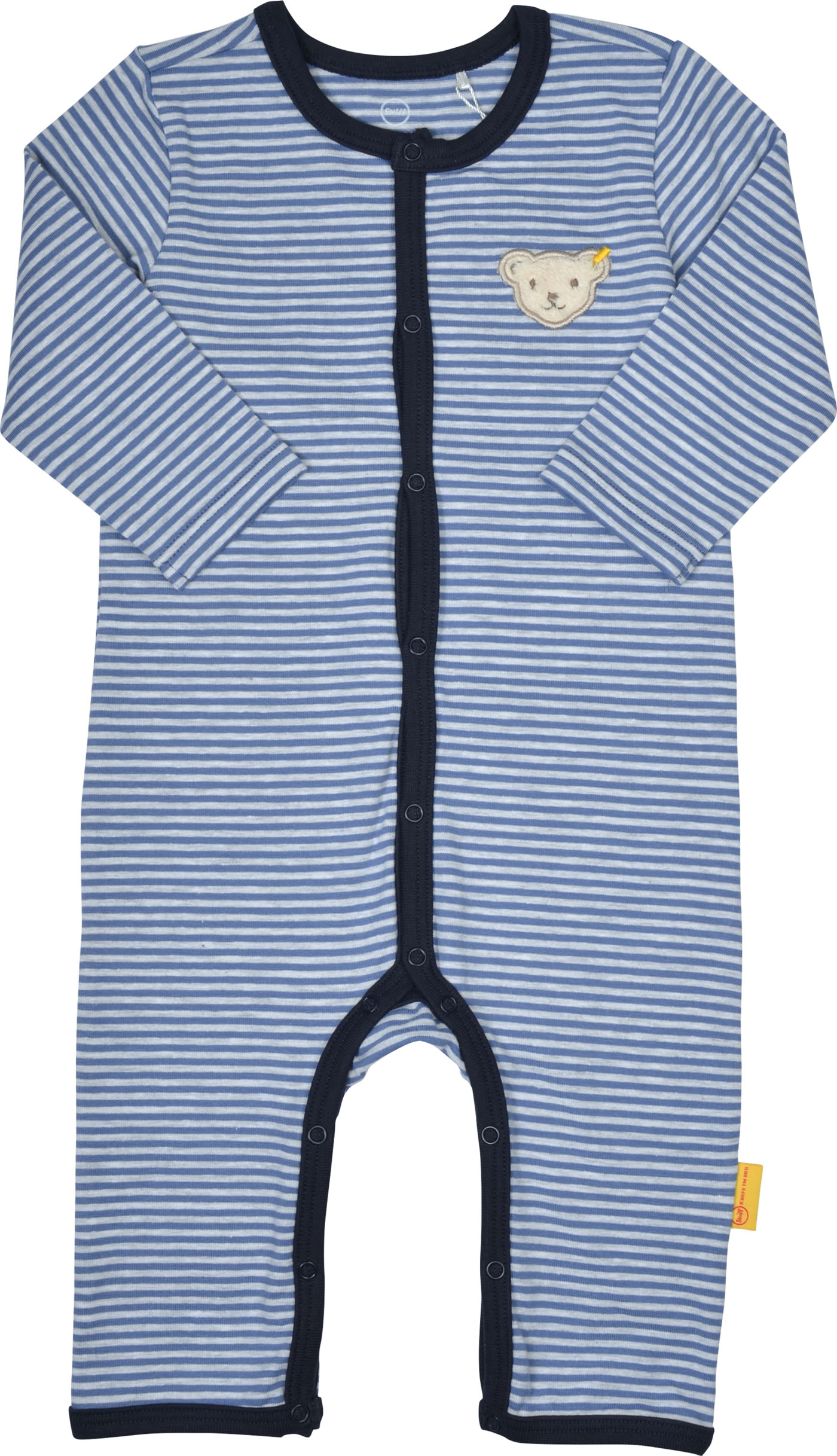 Gestreifter Langarm-Strampler für Jungen aus der Let's Play!-Kollektion von STEIFF. Der STEIFF Bär befindet sich auf der Brust. Die durchgehende Druckknopfleiste erleichtert das An- und Ausziehen.