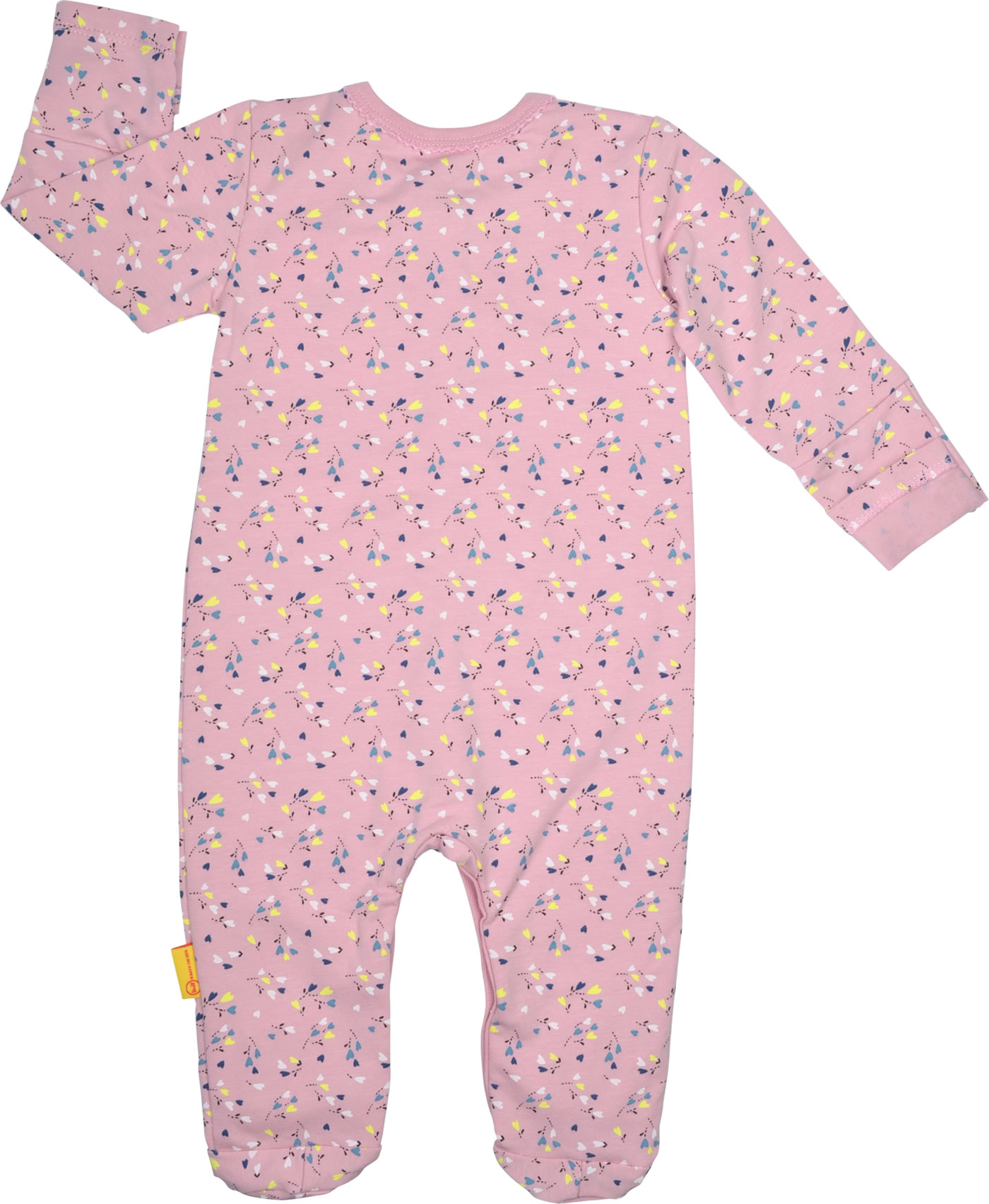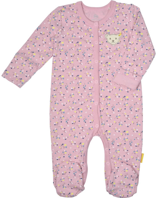 Geblümter Langarm-Strampler für Mädchen aus der Sweet Heart-Kollektion von STEIFF. Der STEIFF Bär befindet sich auf der Brust. Der Kragen und die durchgehende Druckknopfleiste sind mit Mäusezähnchenkanten verziert. Die Ärmel lassen sich umstülpen.