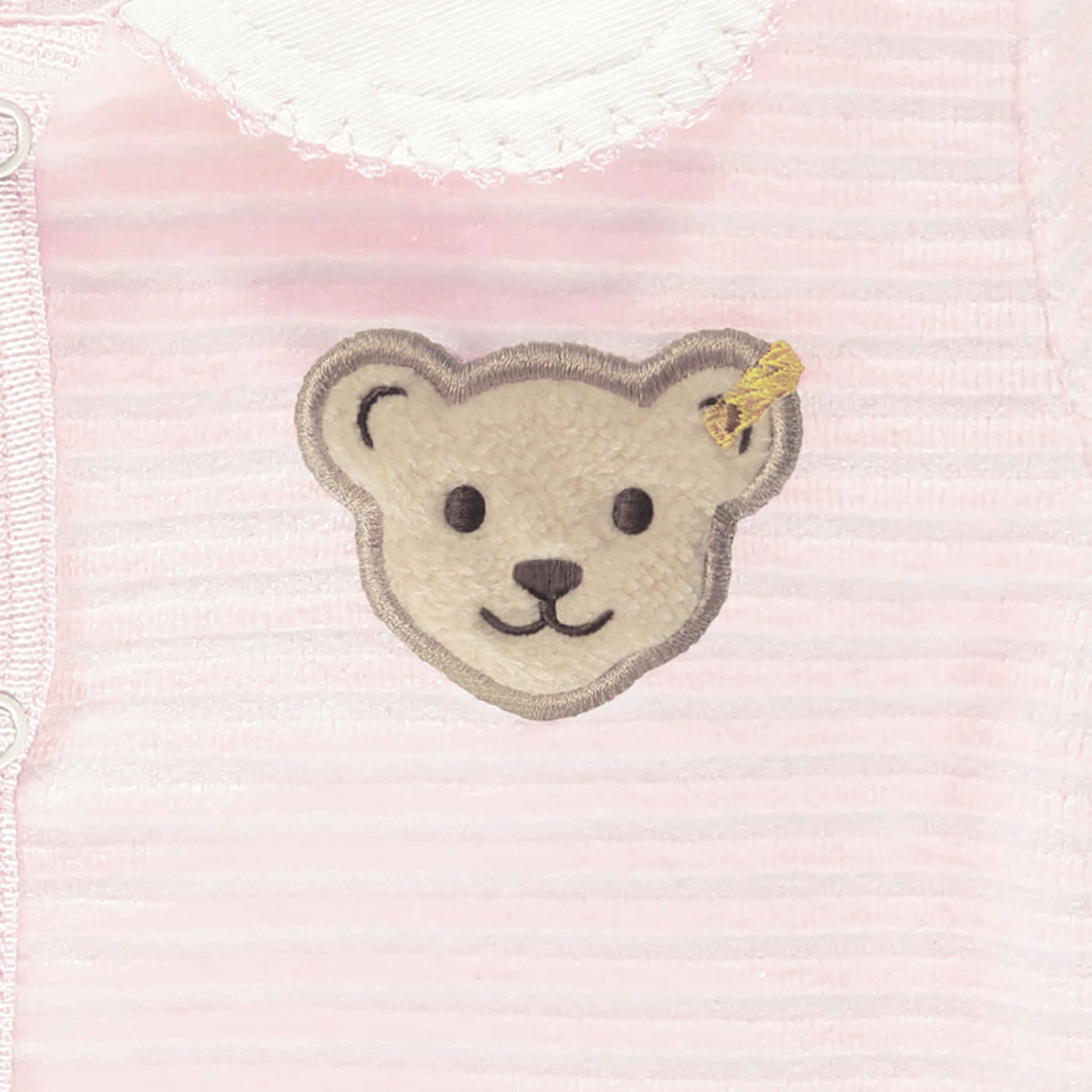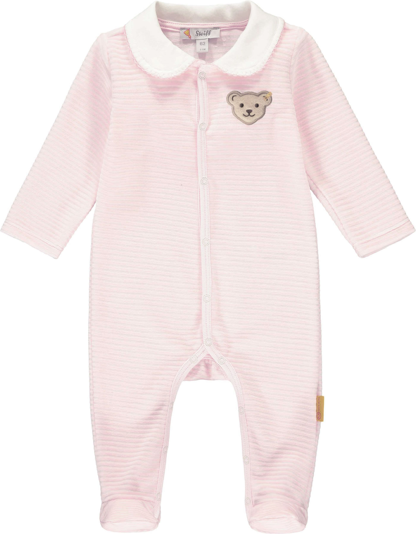 Rosa gestreifter, anschmiegsamer Langarm-Strampler mit Füßen und schönem Kragen von STEIFF für Mädchen. Die Oberfläche des Strampler ist strukturiert und auf der linken Brustseite befindet sich eine kleine Steiff Teddy-Applikation. Ein besonders schönes Detail ist die Picot-Kante in rosa am Kragen. Eine extralange Druckknopfleiste vom Halsausschnitt bis zu den Füßen erleichtert das An- und Ausziehen.
