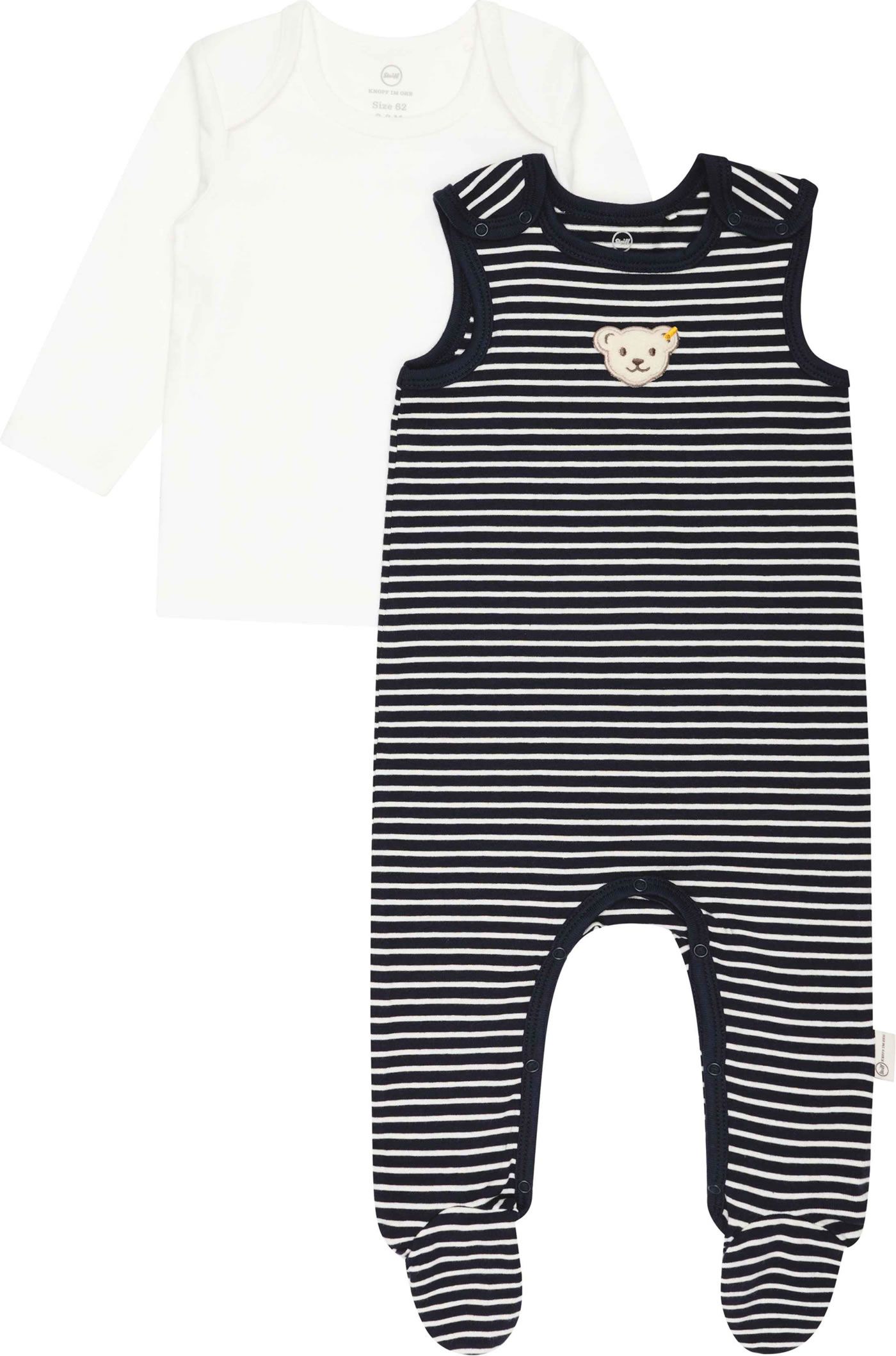Set aus Strampler mit Füßen und Langarmshirt aus der Baby Wellness-Kollektion von STEIFF. Der gestreifte Strampler und das Shirt mit Schlupfkragen sind aus weichem Jersey. Druckknöpfe auf den Schultern und im Schritt erleichtern das An- und Ausziehen. Der kleine STEIFF Bär ziert die Vorderseite und das Material aus ökologischer Baumwolle bietet einen hohen Tragekomfort.