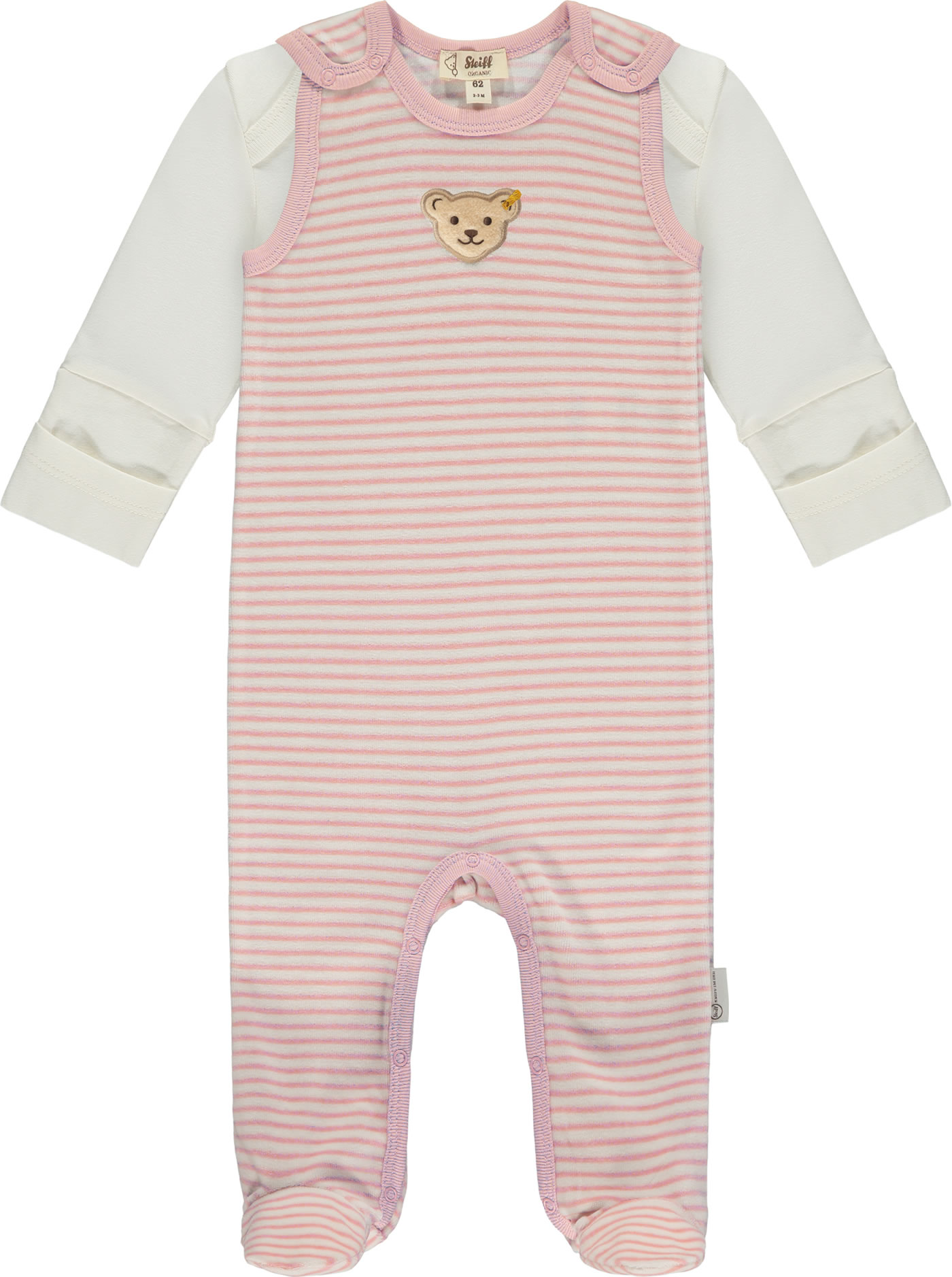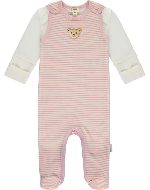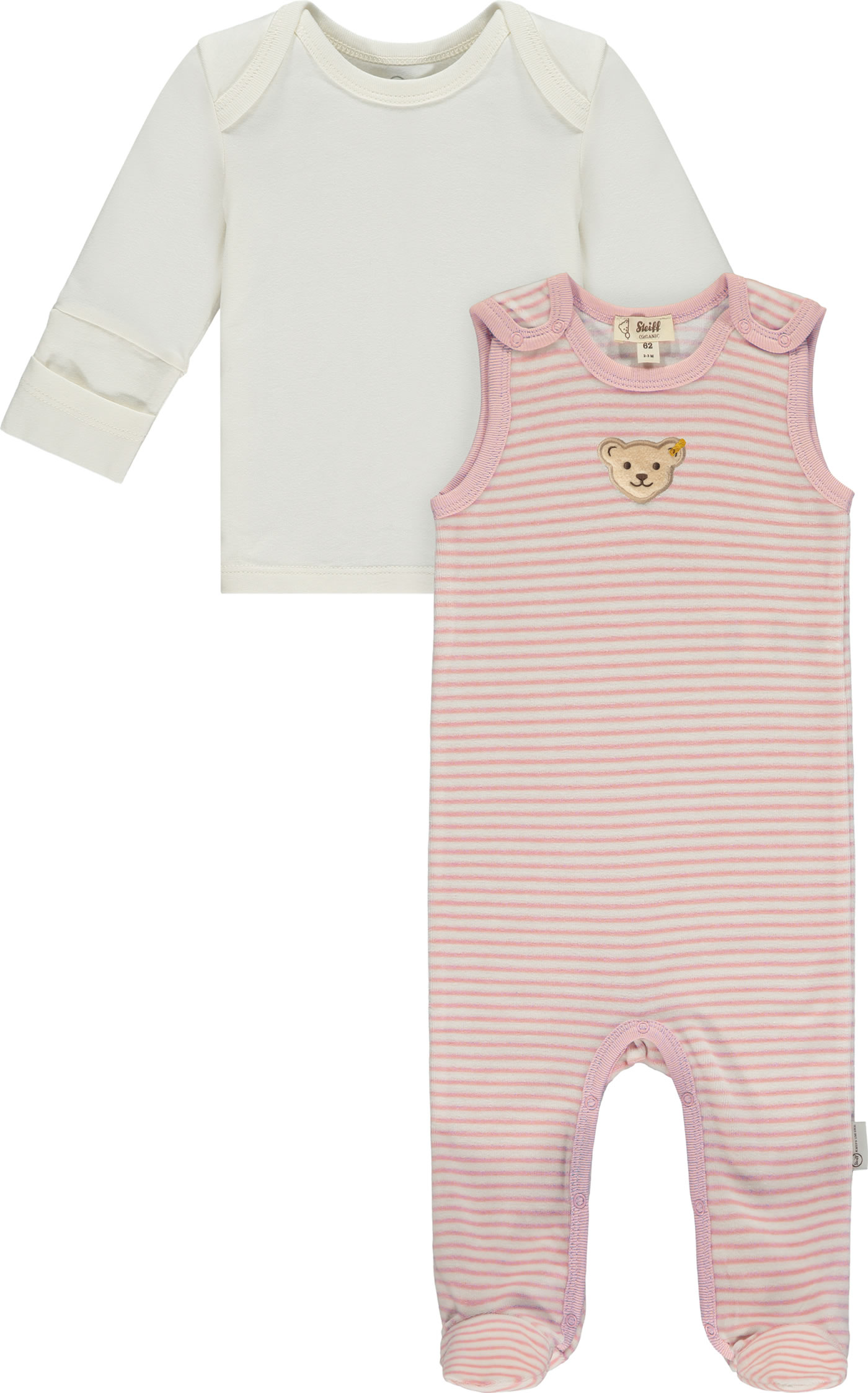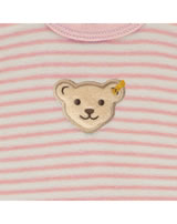 Set aus Strampler mit Füßen und Shirt aus der Baby Organic Just Dots-Kollektion von STEIFF. Das Shirt ist cremeweiß und der Strampler aus Nicki-Stoff ist gestreift. Auf der Brust befindet sich der kleine STEIFF Bär. Druckknöpfe im Schritt und auf den Schultern erleichtern das An-und Ausziehen.