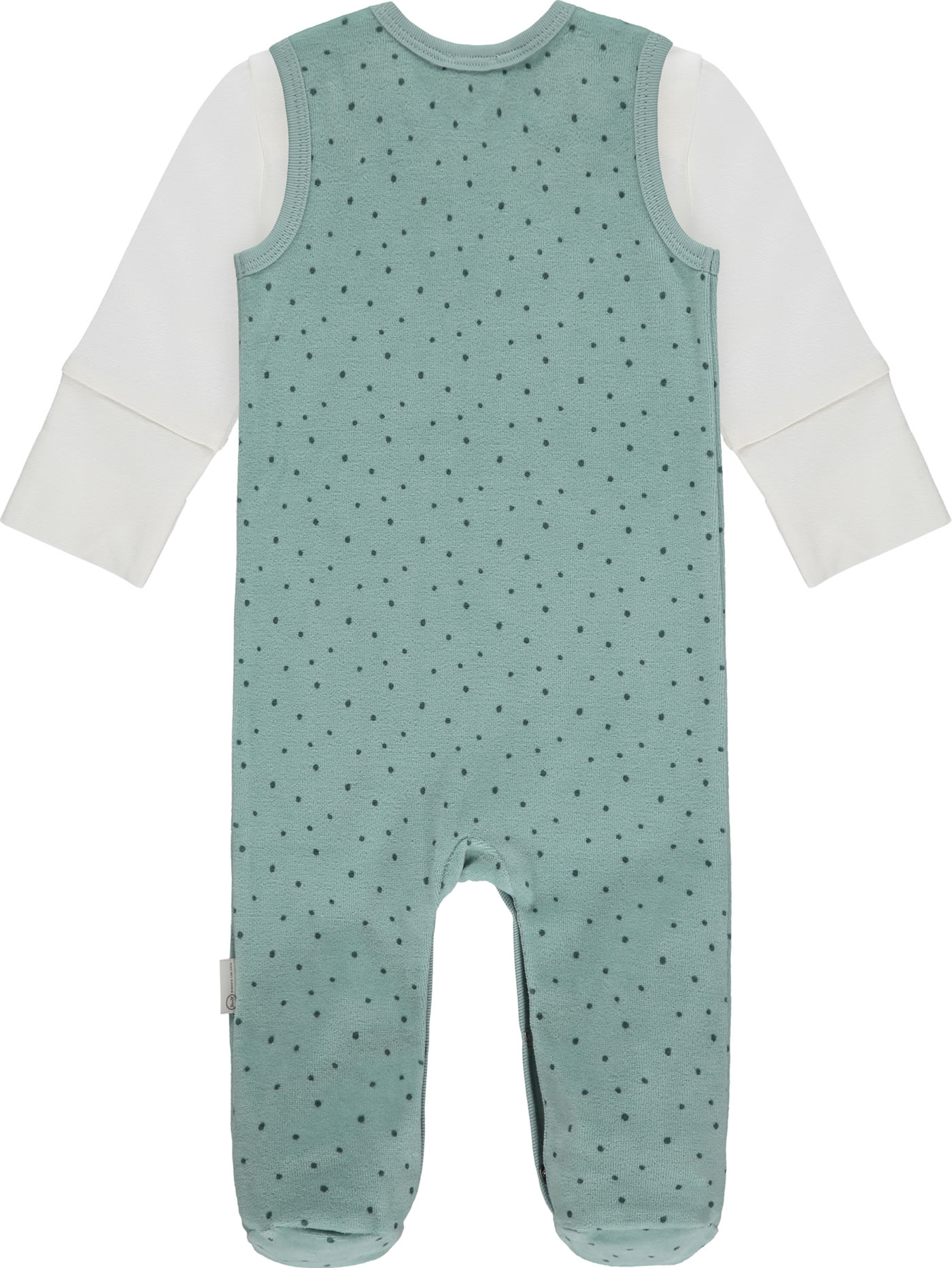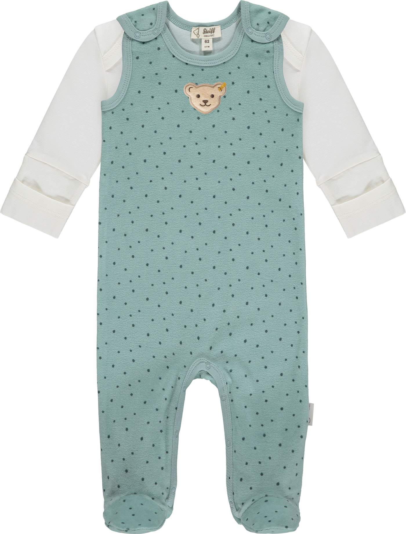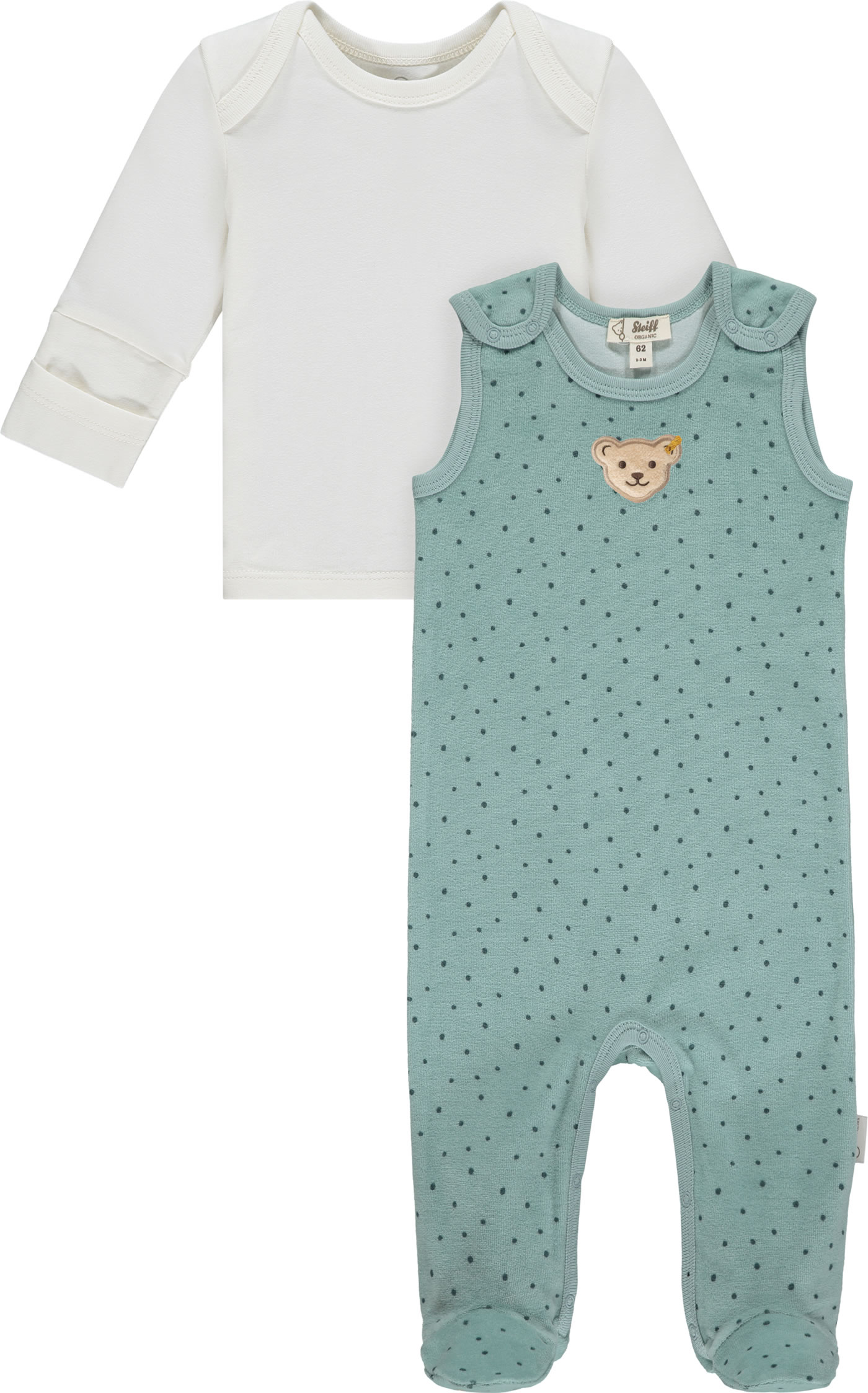 Set aus Strampler mit Füßen und Shirt aus der Baby Organic Just Dots-Kollektion von STEIFF. Das Shirt ist cremeweiß und der Strampler aus Nicki-Stoff hat lustige Punkte. Auf der Brust befindet sich der kleine STEIFF Bär. Druckknöpfe im Schritt und auf den Schultern erleichtern das An-und Ausziehen.