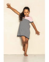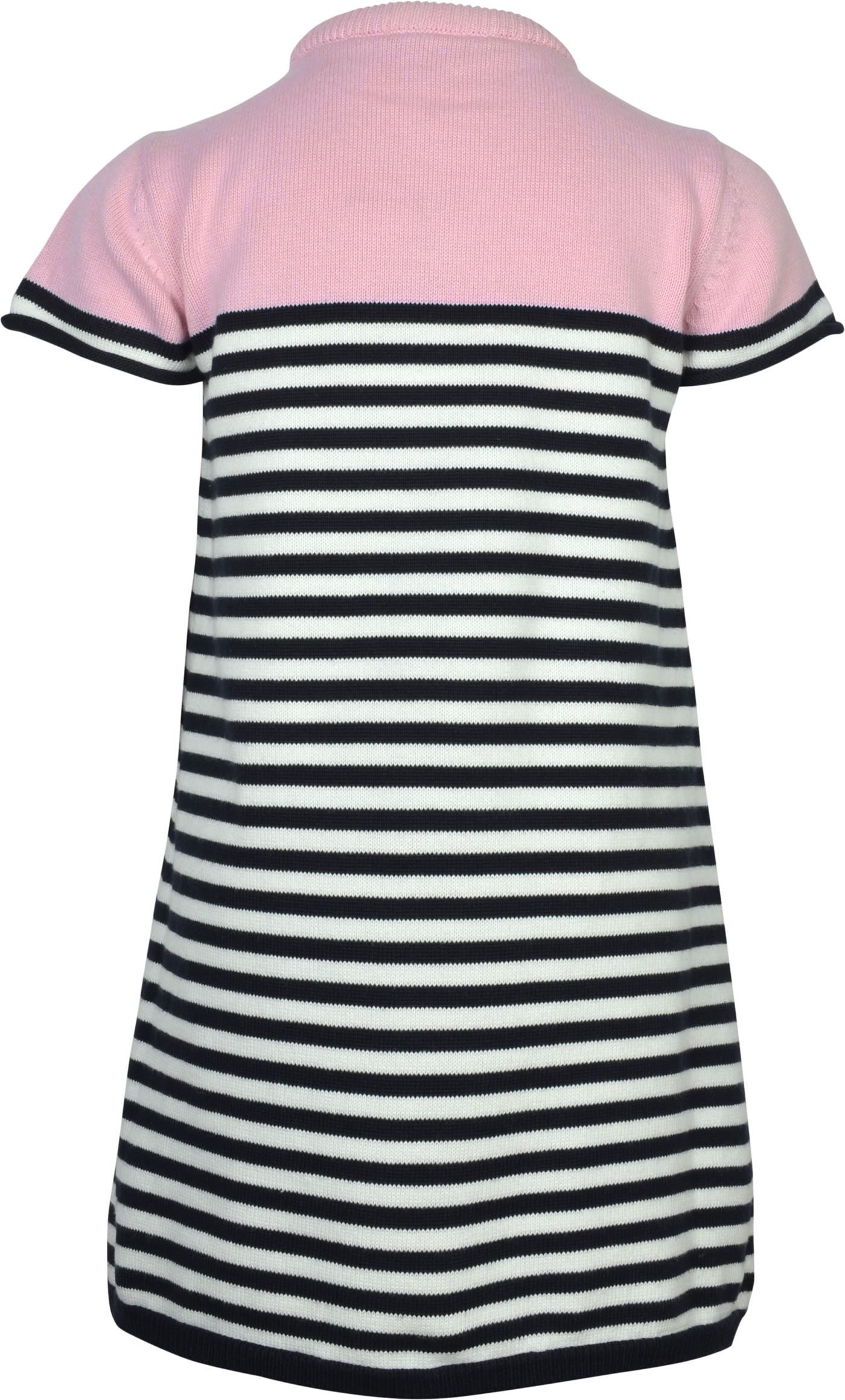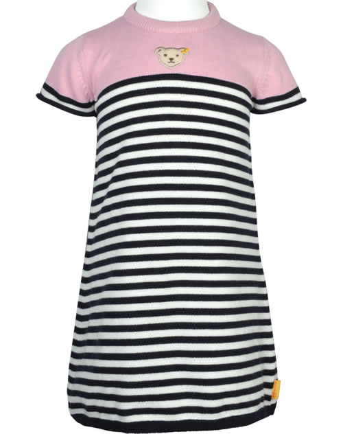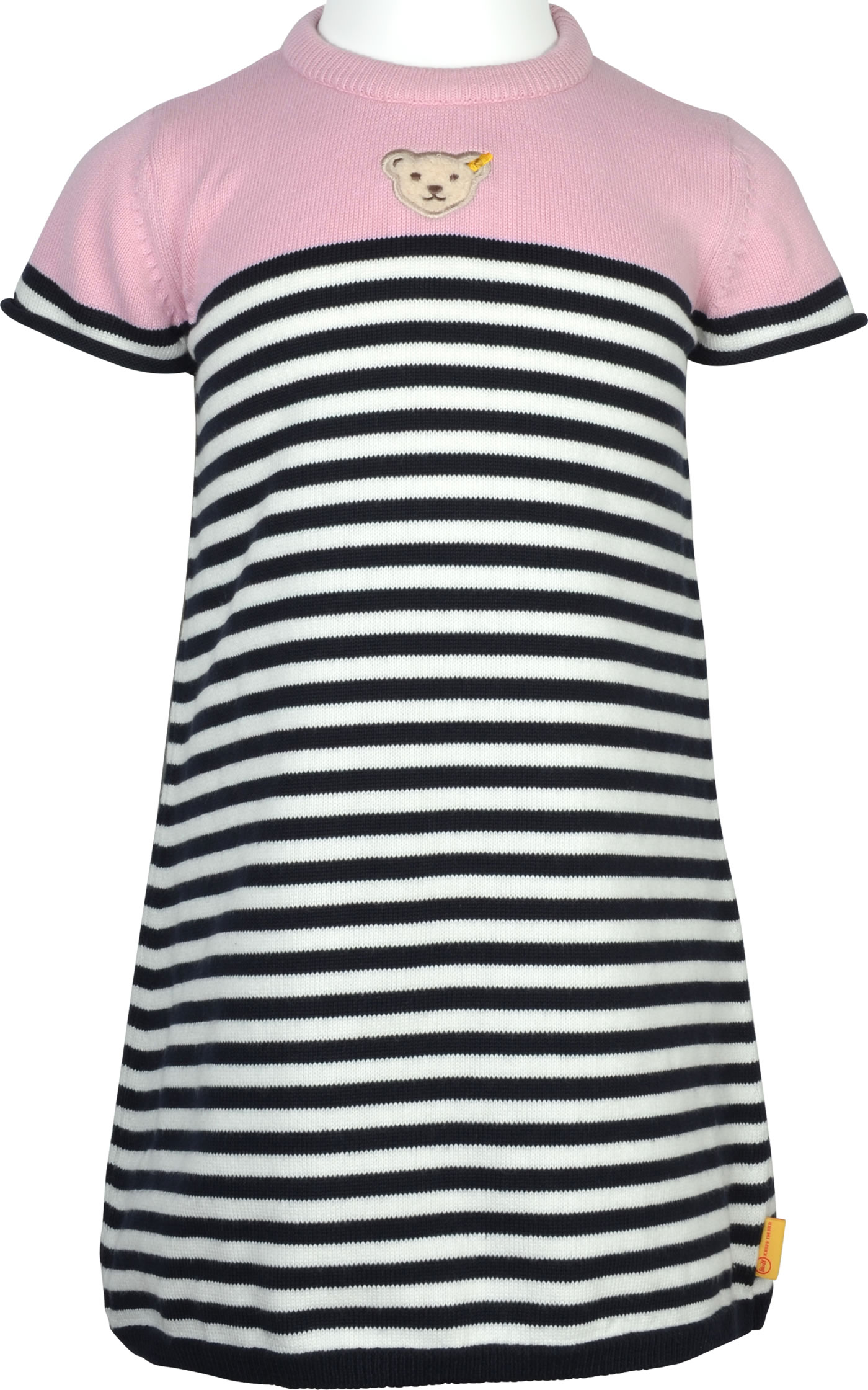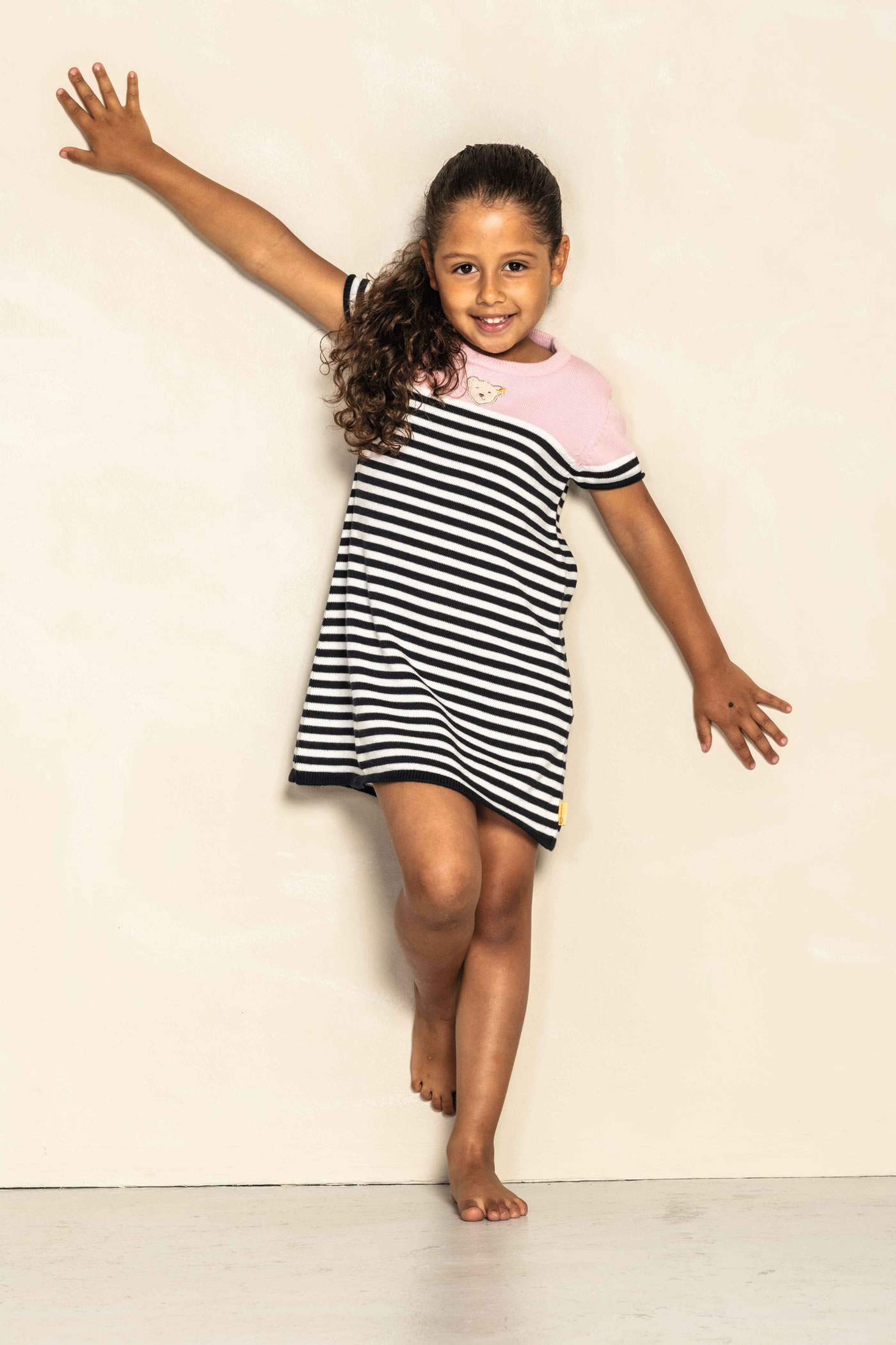 Hübsch geringeltes Kleid von STEIFF aus der Beach Please Kollektion. Das Strickkleid ist aus Baumwolle und in leichter A-Linie geschnitten. Schöne Details sind die Rollbündchen an den Ärmeln und der STEIFF Bär auf der Vorderseite. Das Kleid lässt sich prima mit Leggings oder Jeans kombinieren und kann natürlich auch solo getragen werden.