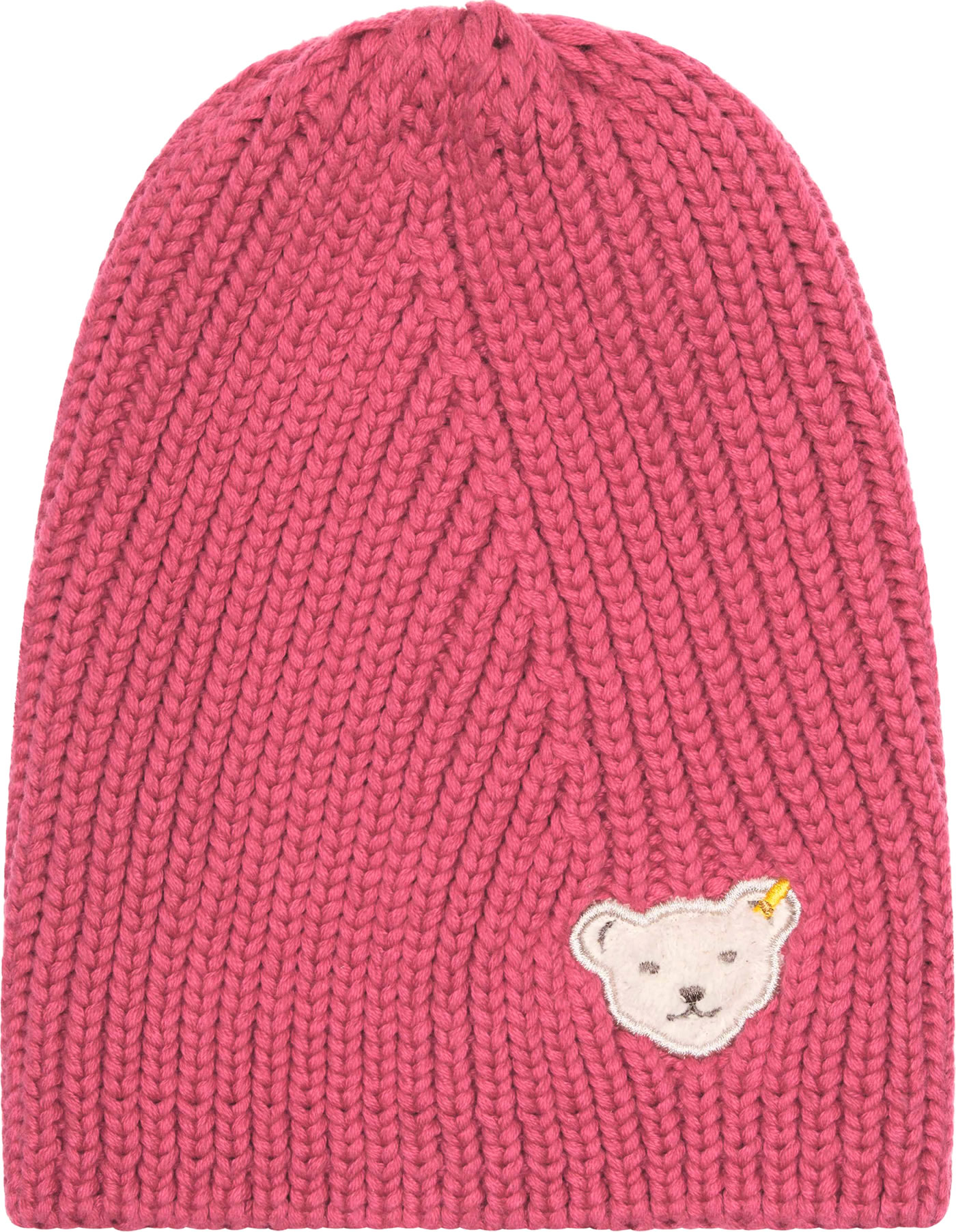 Warme Mütze in Linksstrick von STEIFF aus der Classic-Kollektion für Mädchen. Die Vorderseite der Mütze ziert der kleine STEIFF Bär.