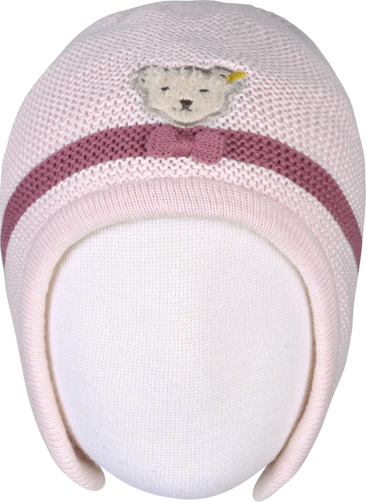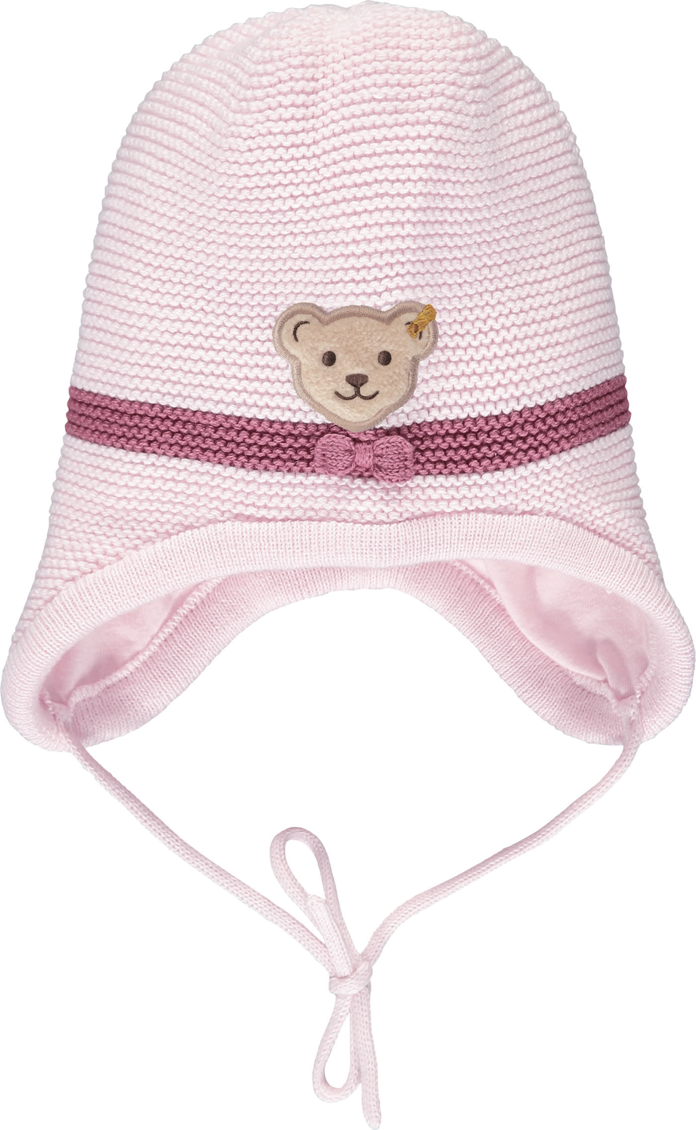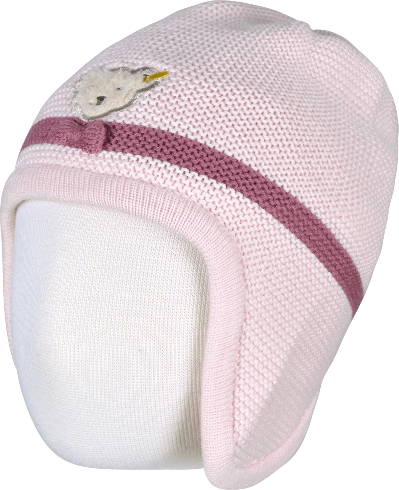 Doppellagige Strick-Mütze von STEIFF aus der Fairytale-Kollektion für Mädchen. Die Vorderseite der Mütze ziert der kleine STEIFF Bär mit Schleife. Innen ist die Mütze mit weichem Baumwoll-Jersey gefüttert.