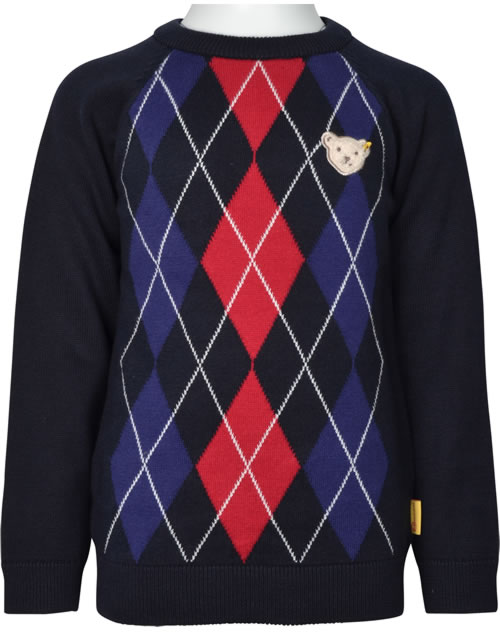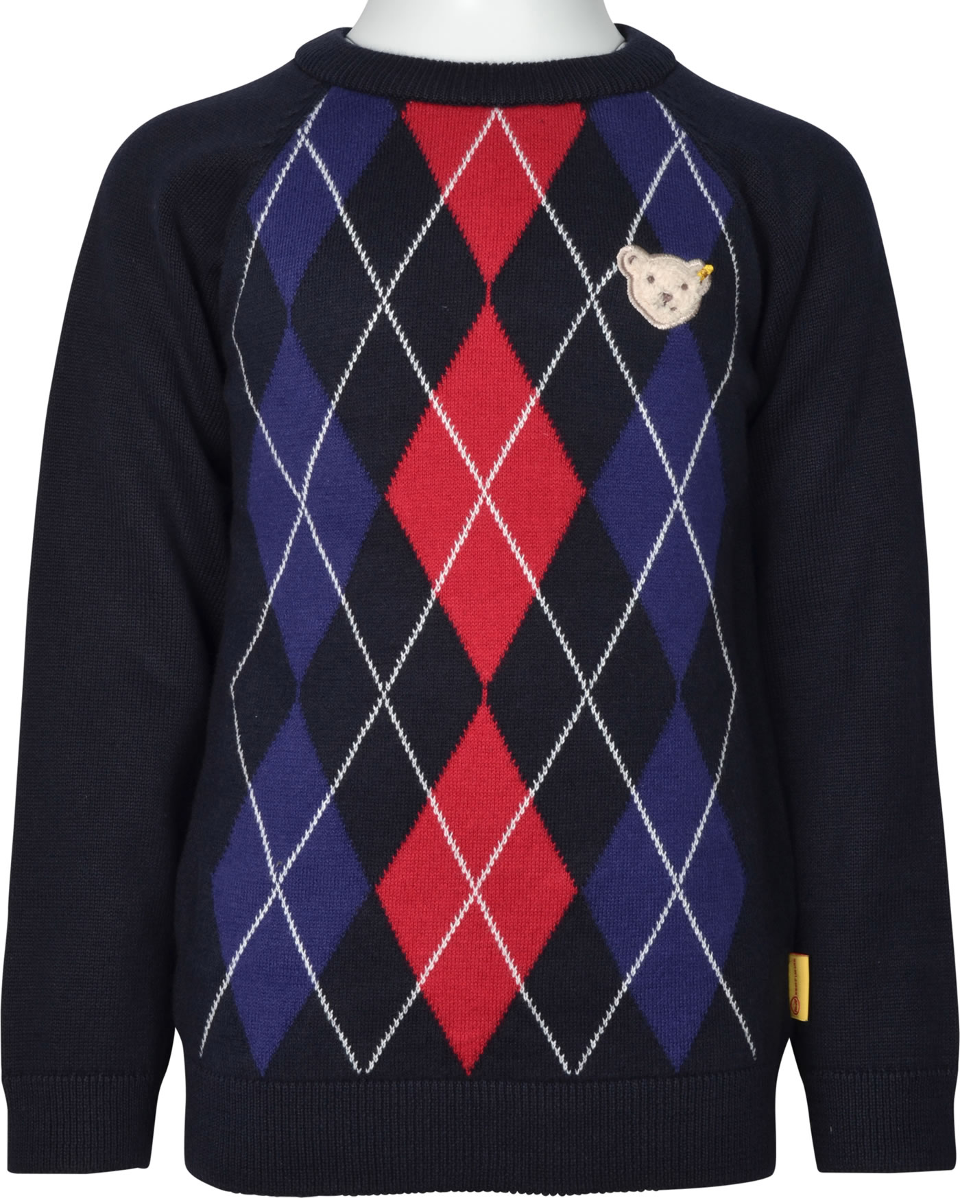 Schöner Strick-Pullover für Jungen aus der Airplane-Kollektion von STEIFF. Das weiche Material sorgt für einen hohen Tragekomfort. Schöne Details sind das Rautenmuster auf der Vorderseite und der STEIFF Bär auf der Brust.