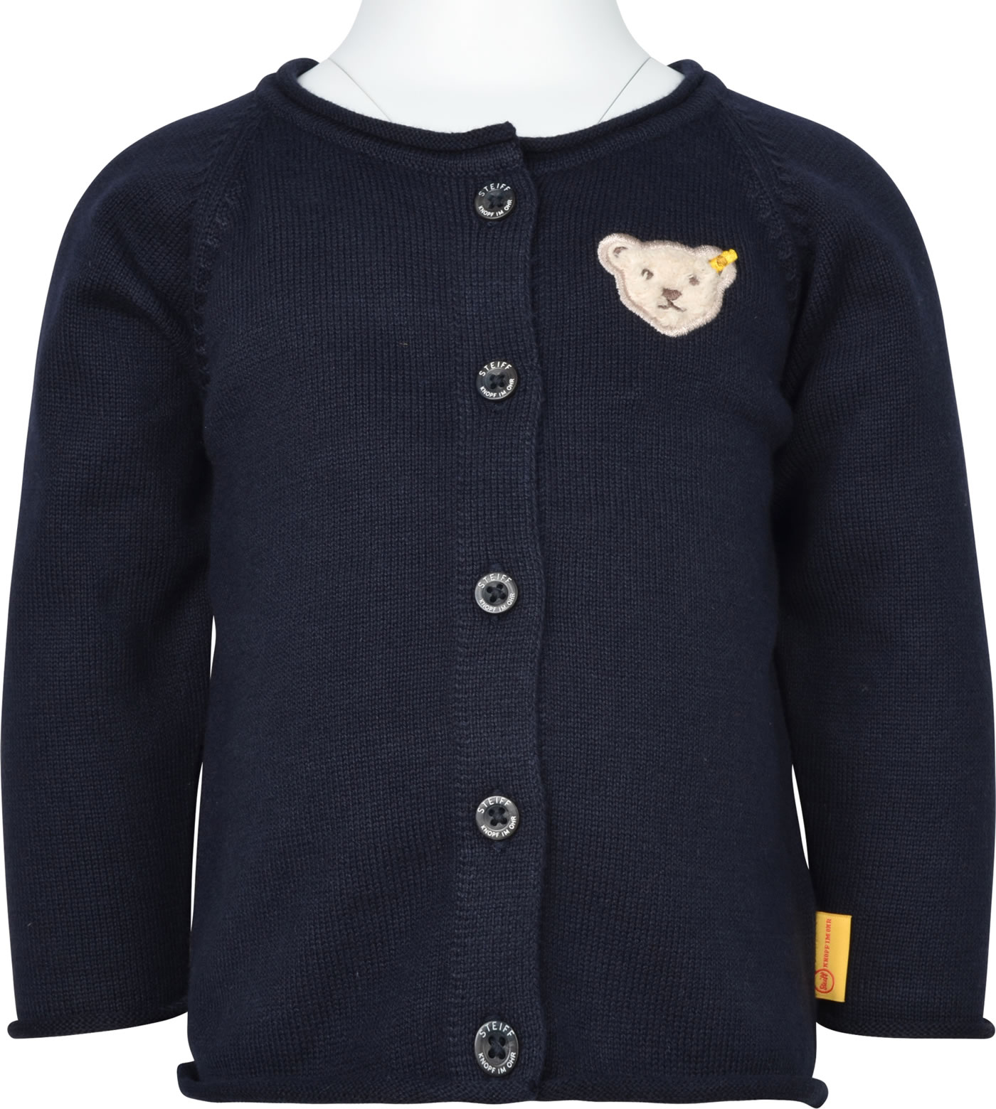 Schöne Strickjacke für Mädchen aus der Beach Please-Kollektion von STEIFF. Das weiche Material sorgt für hohen Tragekomfort. Die Strickjacke wird mit einer Knopfleiste geschlossen. Hübsche Details sind der kleine STEIFF Bär auf der Vorderseite und die Rollbündchen an Ärmeln und Saum.