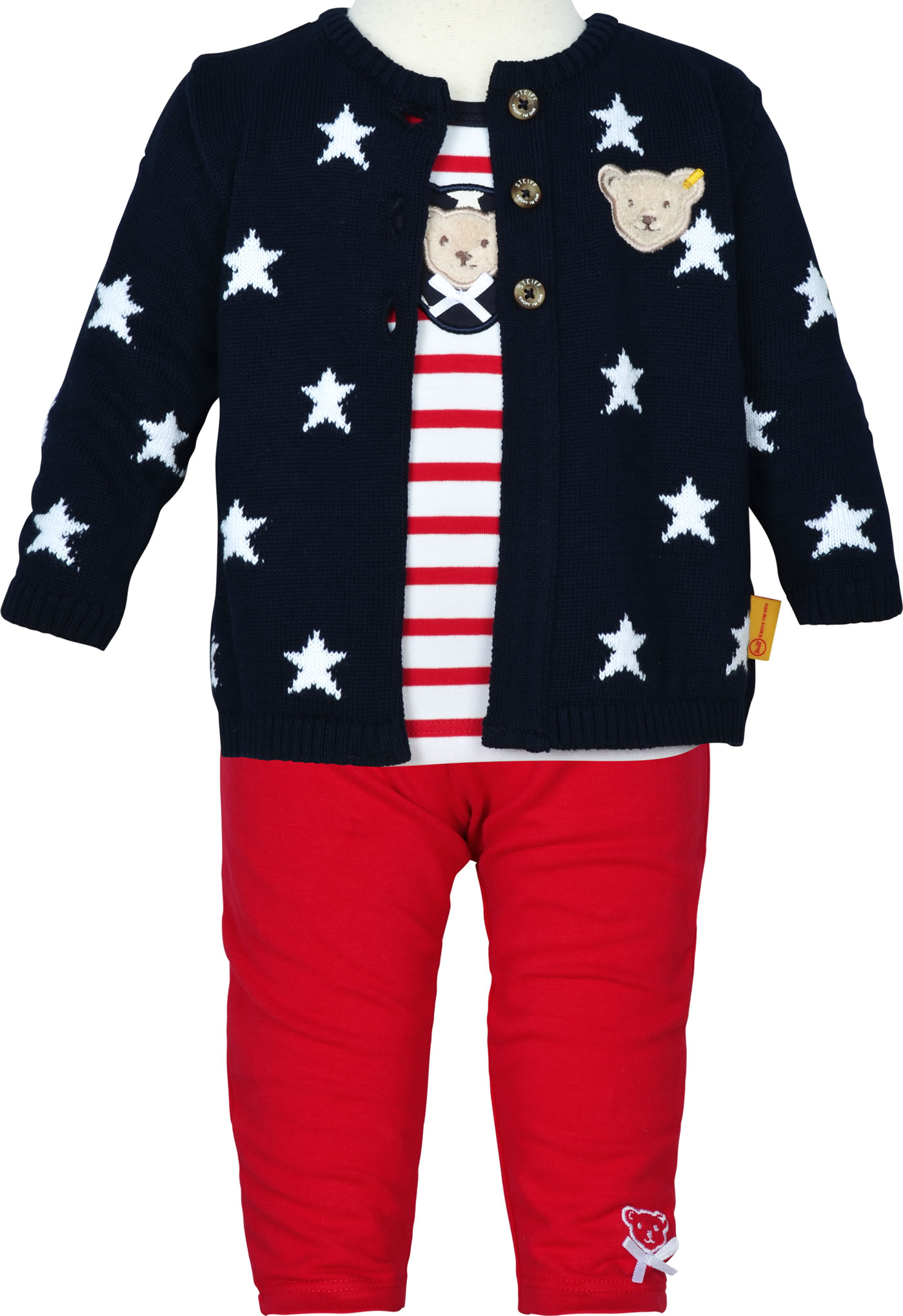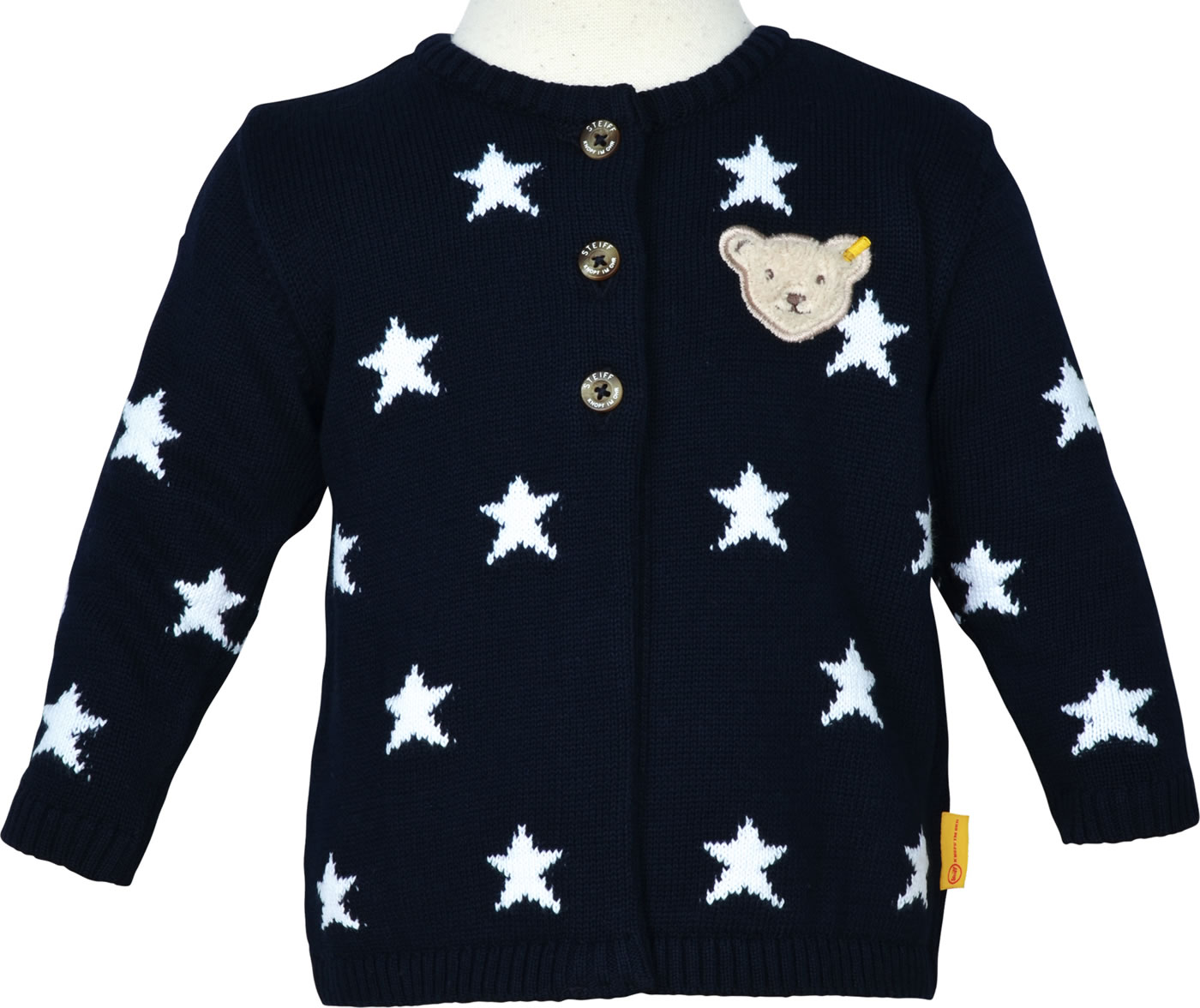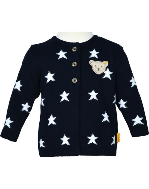 Schöne Strickjacke mit Sternen für Mädchen aus der Bear to School-Kollektion von STEIFF. Das weiche Material sorgt für einen hohen Tragekomfort. Die Strickjacke wird mit drei Knöpfen verschlossen und ist nach unten hin offen.