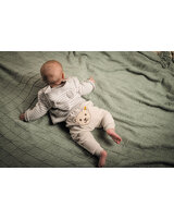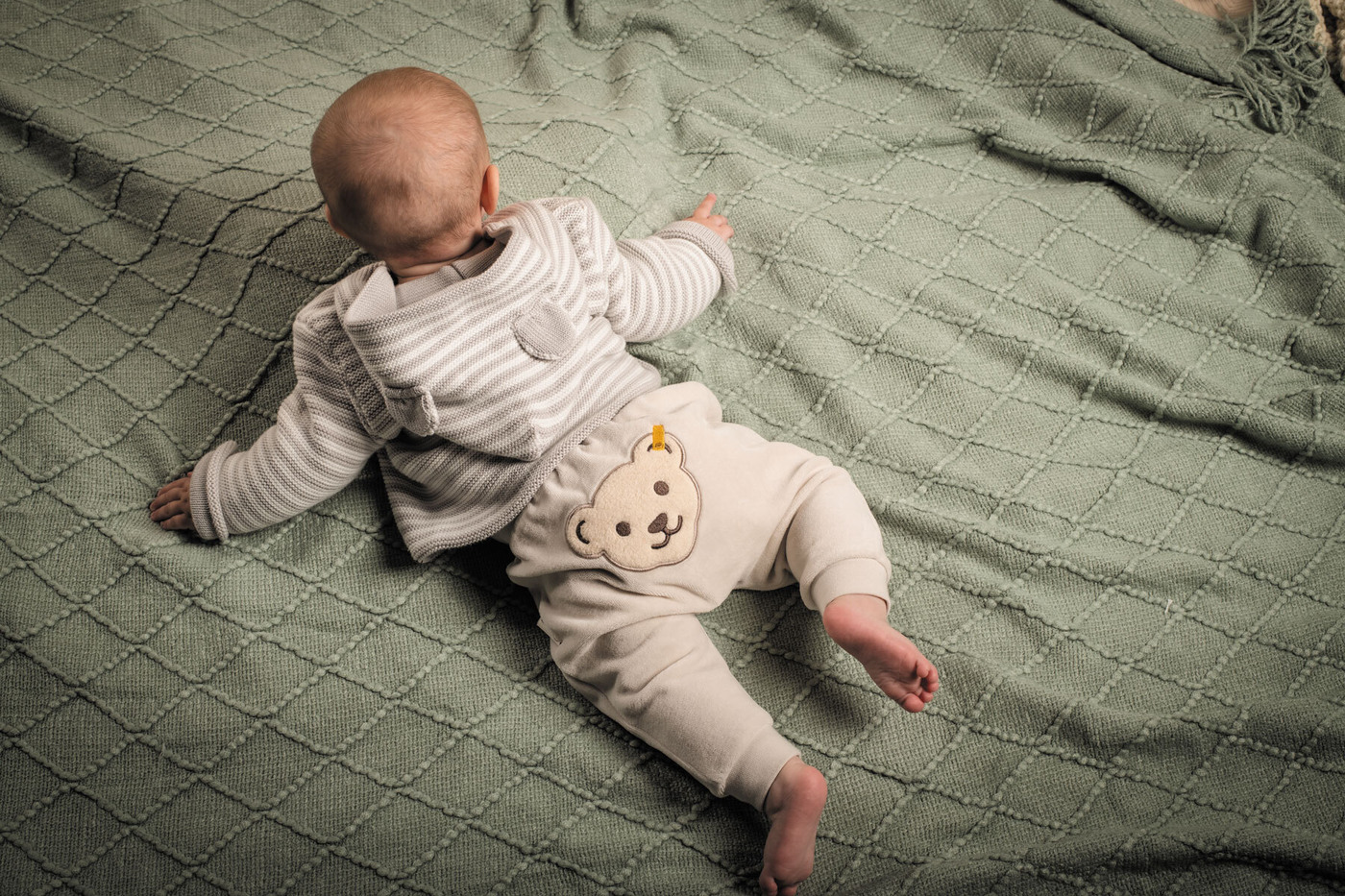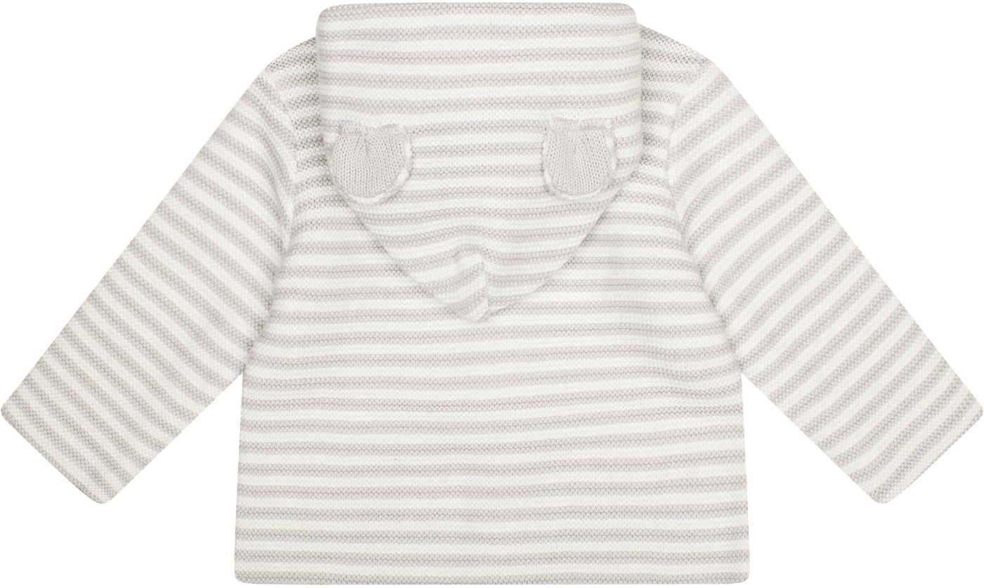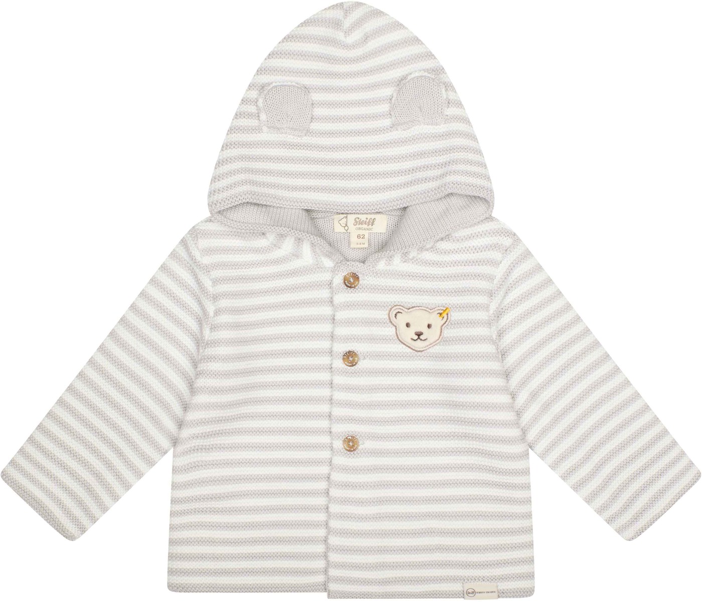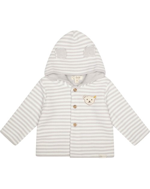Strickjacke mit Ohren-Kapuze Steiff aus der Baby Wellness-Kollektion. Die Jacke wird mit einer Knopfleiste geschlossen. An der Kapuze befinden sich niedliche Bären-Ohren und der kleine STEIFF Bär ziert die Brust.