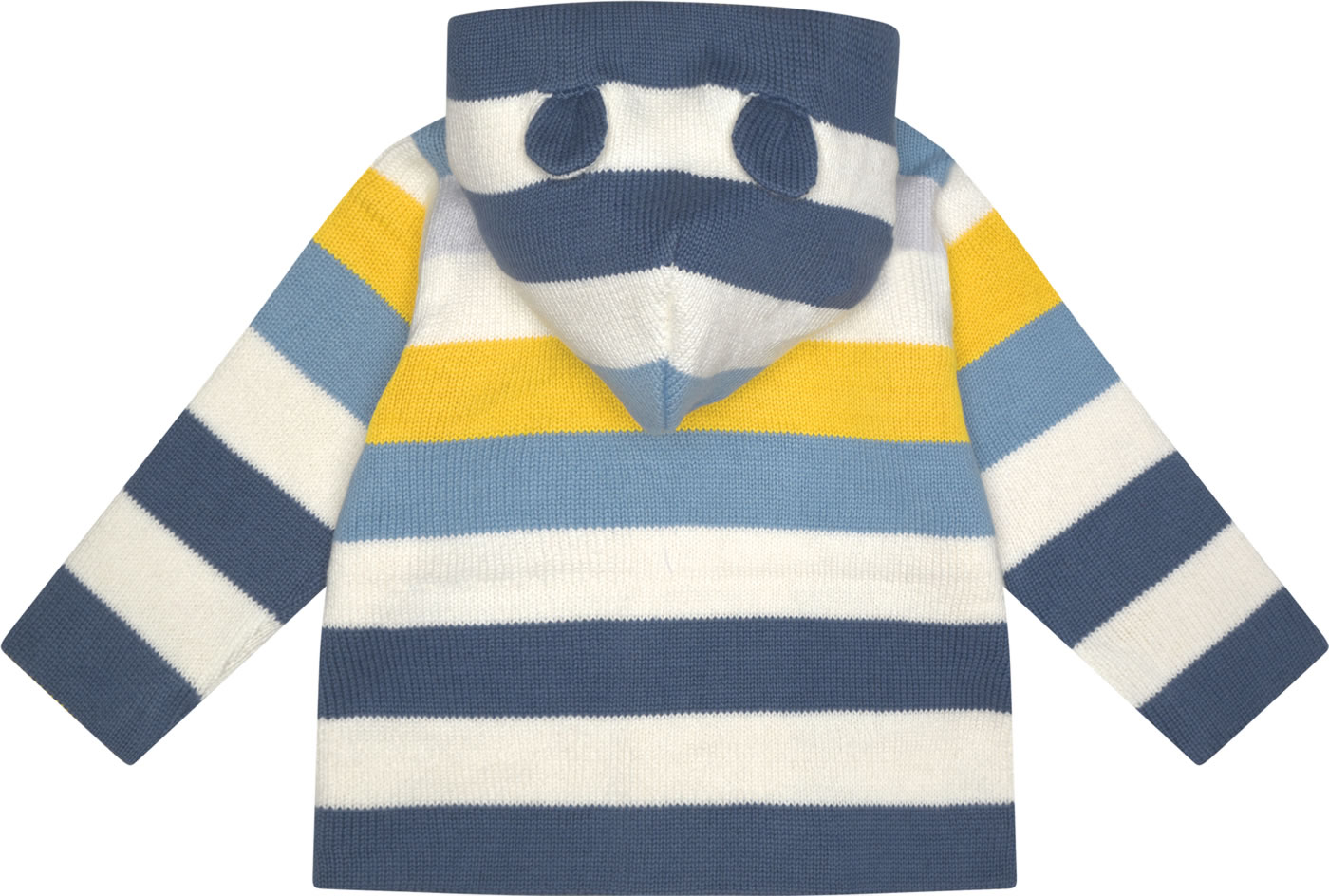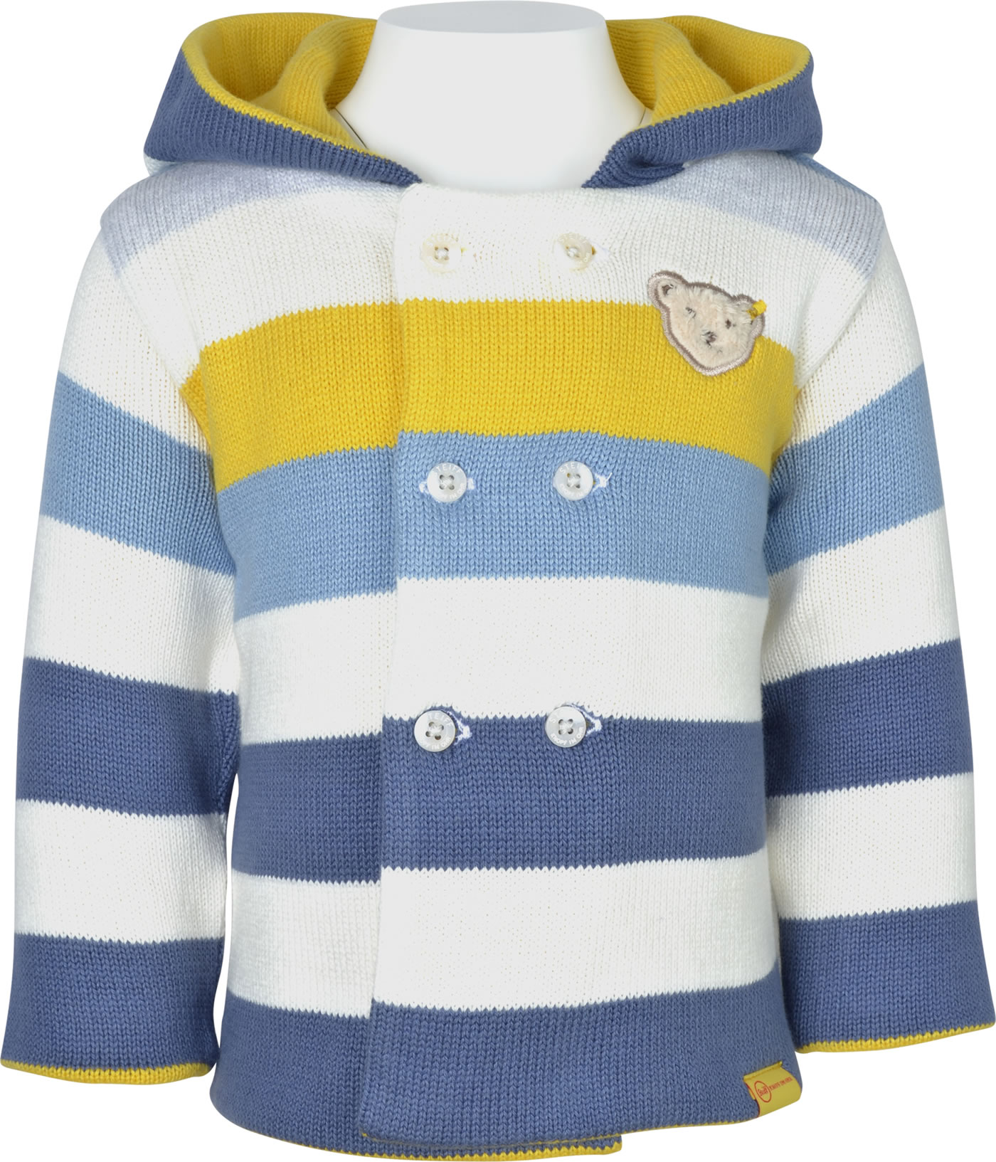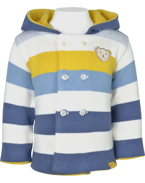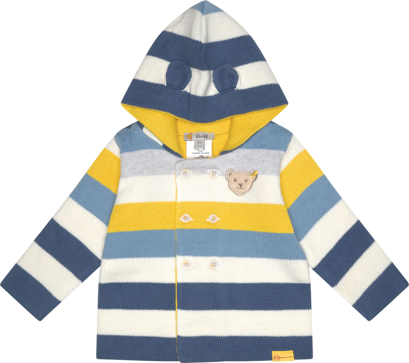 Strickjacke mit Kapuze für Jungen von STEIFF aus der Elephant Ride-Kollektion. Die Jacke wird mit einer doppelten Knopfleiste geschlossen. An der Kapuze befinden sich niedliche Bären-Ohren und der kleine STEIFF Bär ziert die Brust. Die Jacke ist doppellagig und dadurch schön warm.