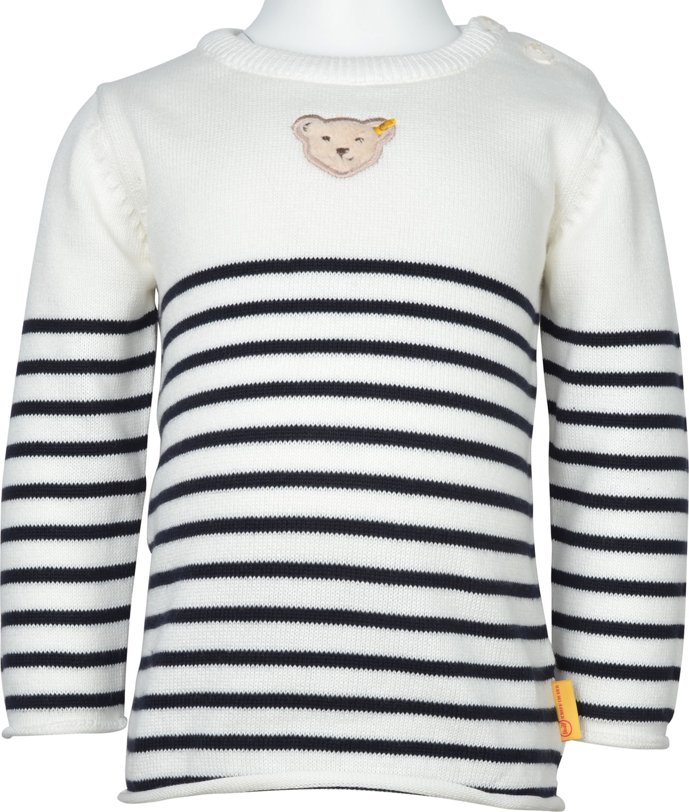 Schöner Strick-Pullover für Mädchen aus der Beach Please-Kollektion von STEIFF. Das weiche Material sorgt für einen hohen Tragekomfort und hält an kühleren Tagen schön warm. Schöne Details sind die Rollbündchen an Ärmeln und Saum und der kleine STEIFF Bär auf der Vorderseite.