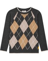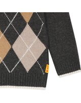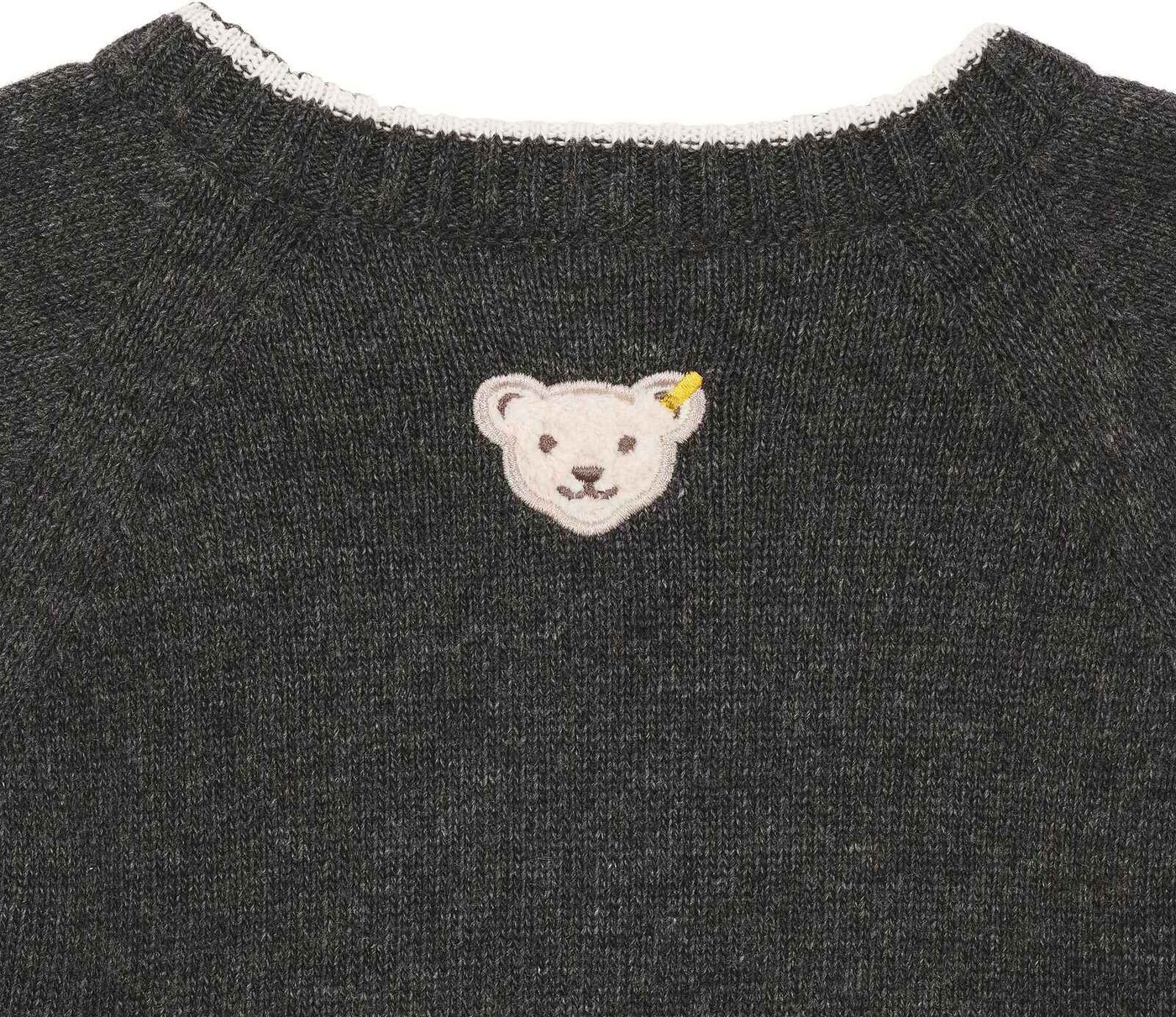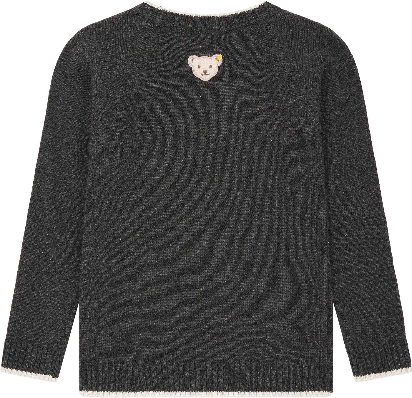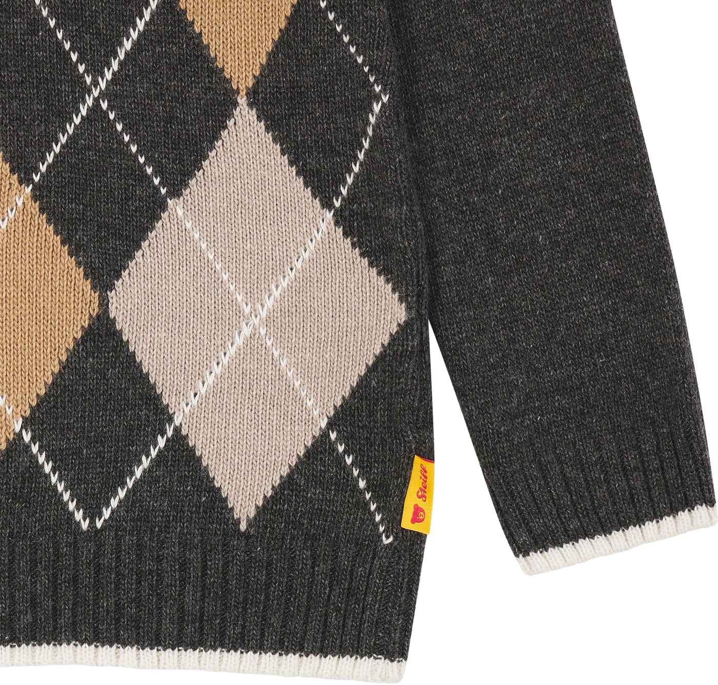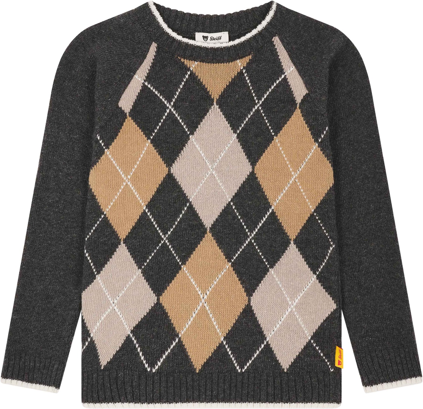Dieser hübsche Pullover mit eingestricktem Rautenmotiv ist der perfekte Begleiter im Alltag. Die klassische Farbkombination ist vielfältig kombinierbar, weshalb das Oberteil zu allen Gelegenheiten getragen werden kann. Dank der hochwertigen Strickqualität ist ein angenehmes Tragegefühl garantiert. Die Bündchen am Saum und am Hals mit ihren Kontraststreifen sind nicht nur ein Hingucker, sie helfen auch wunderbar beim An- und Ausziehen. Das Steiff Teddybärmotiv auf dem Rücken darf natürlich nicht fehlen!