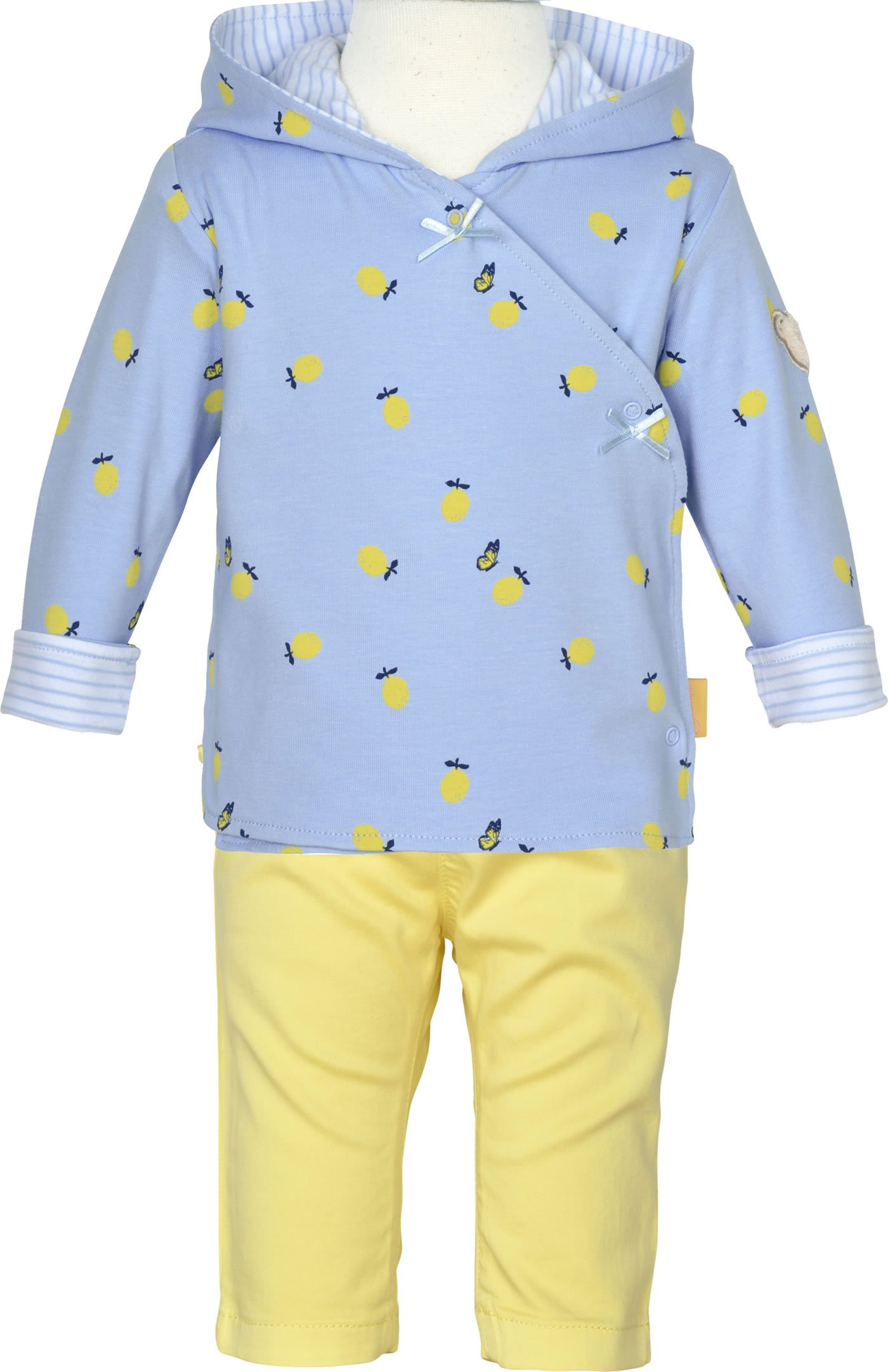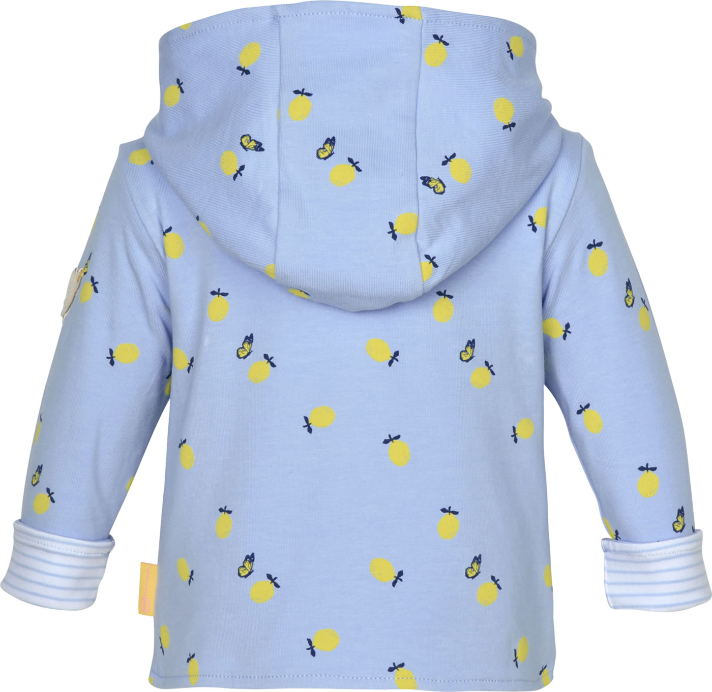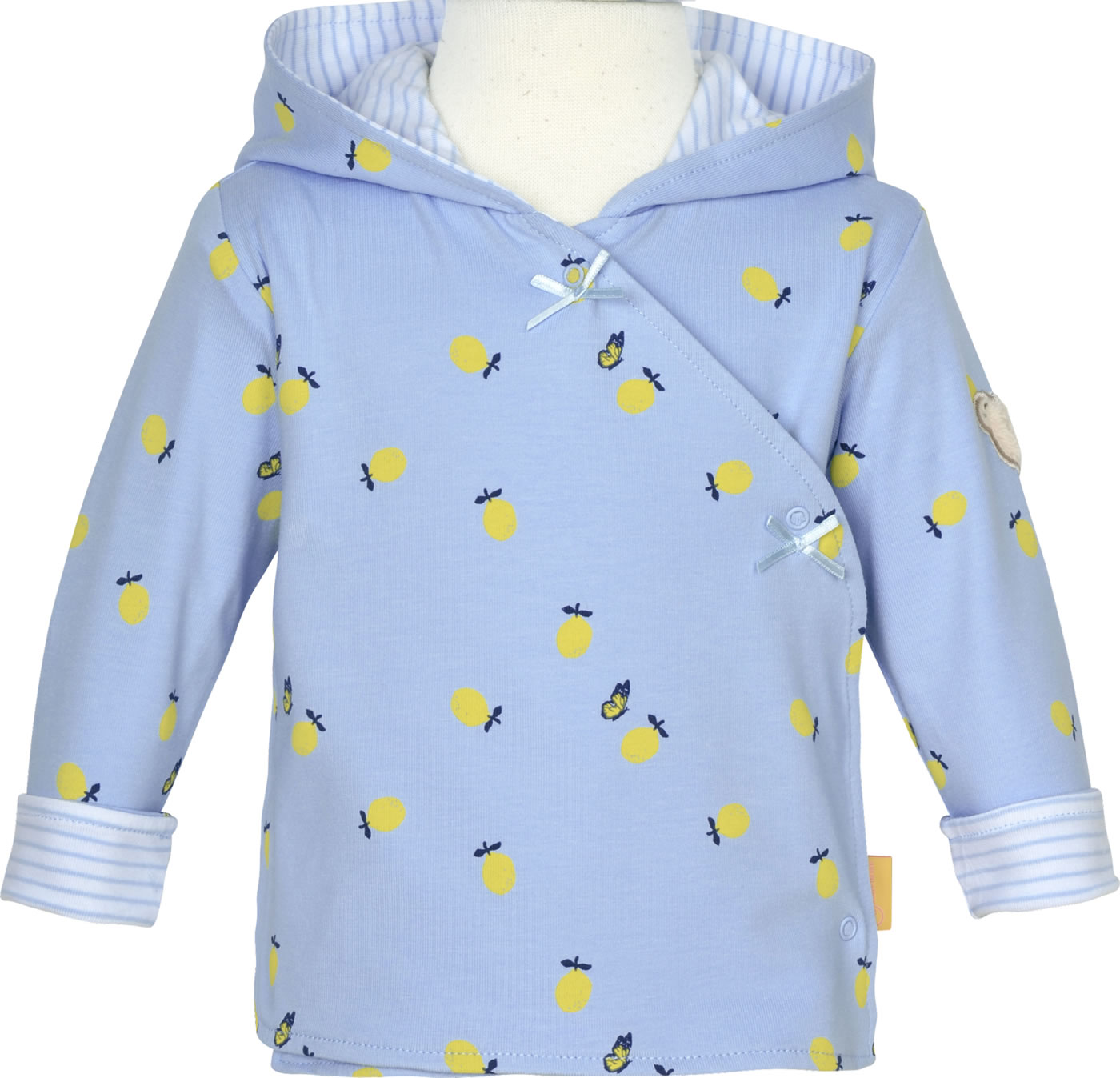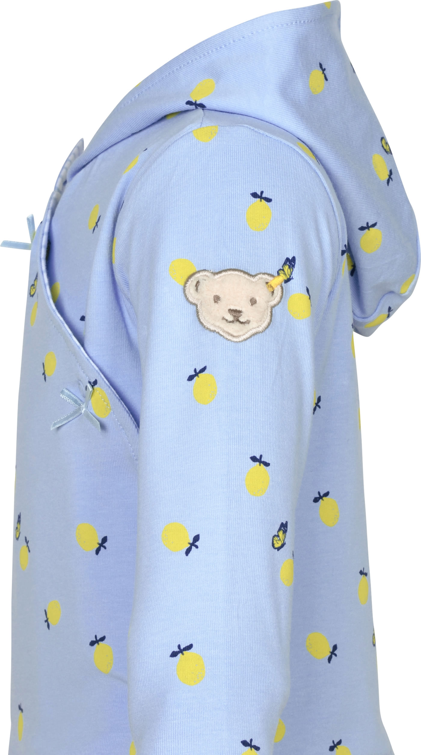 Warme Sweatjacke mit Kapuze von STEIFF für Mädchen aus der Hello Summer-Kollektion. Die Jacke wird mit Druckknöpfen verschlossen. Besonders schöne Details sind der Print mit Schmetterlingen und Zitronen und der STEIFF Bär auf dem linken Ärmel. Das Futter ist gestreift.