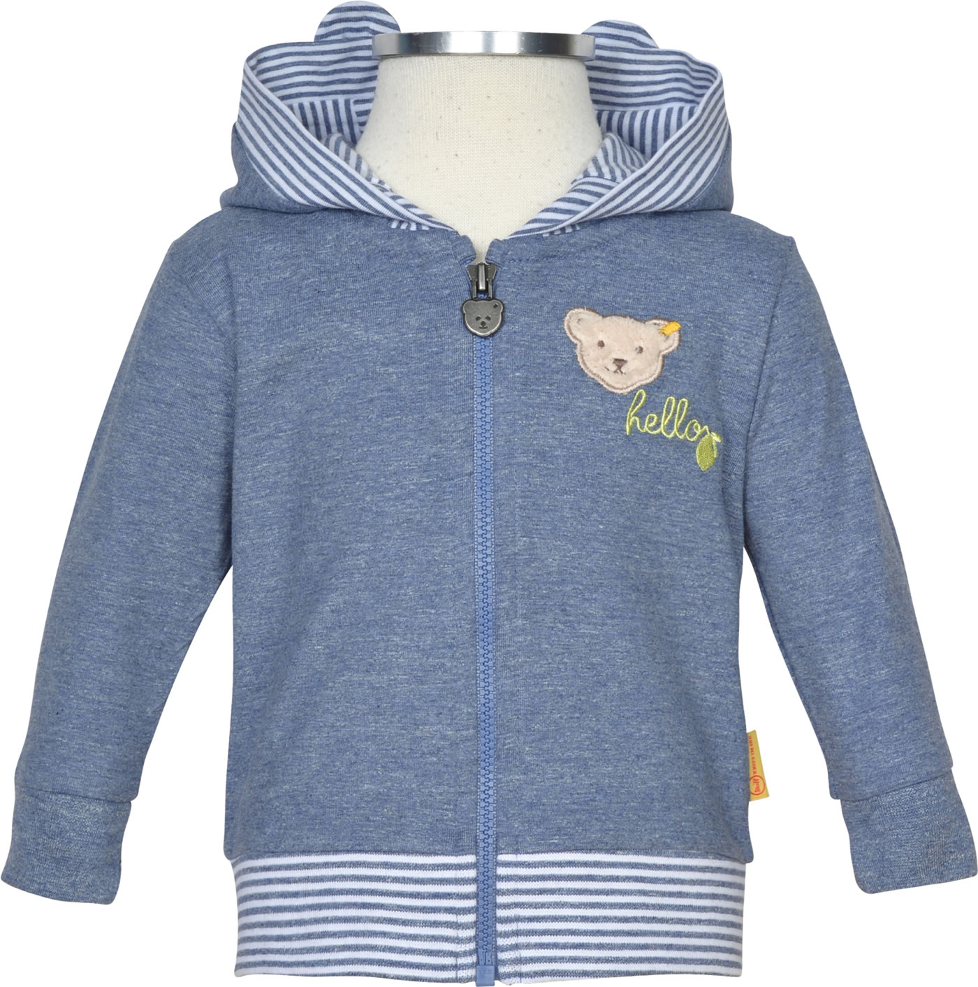 Schöne Sweatjacke aus Jersey von STEIFF aus der Hello Summer Kollektion für Jungen. Die Jacke wird mit einem Reißverschluss verschlossen. Der kleine STEIFF Bär befindet sich auf der Vorderseite. An der gefütterten Kapuze befinden sich süße Bären-Ohren.