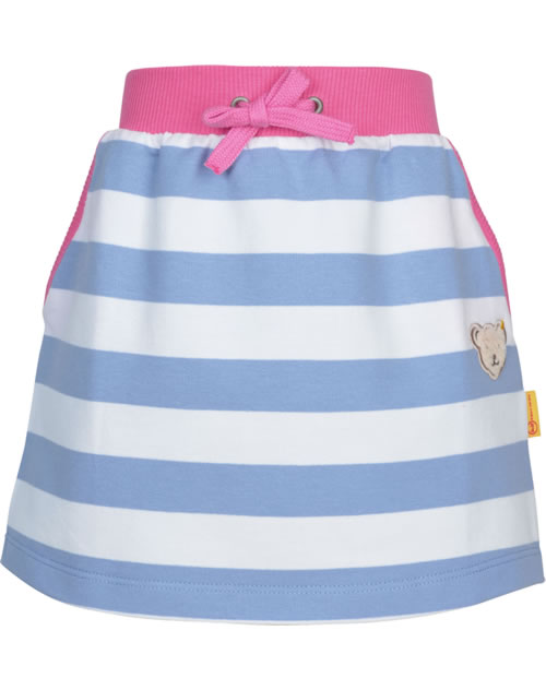 Sweat-Rock von STEIFF für Mädchen aus der Sweet Cherry-Kollektion. Der gestreifte Rock hat ein weiches Gummibündchen, das für einen guten Sitz sorgt. Vorn befinden sich zwei Taschen und der STEIFF Bär. Die Taille wird von einer Schleife verziert.