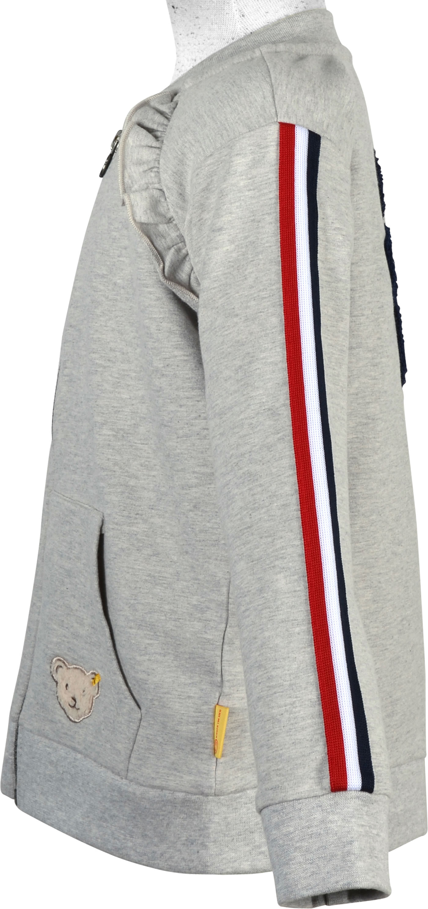 Sweatjacke für Mädchen aus der Bear to School-Kollektion von STEIFF Die Jacke wird mit einem Reißverschluss verschlossen. Der STEIFF-Bär ziert den Zipper und die linke Tasche. Schöne Details sind der erhabene Stern auf dem Rücken, die Streifen auf den Ärmeln und die Rüschen auf der Vorderseite.