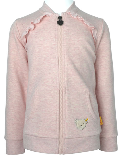 Sweatjacke für Mädchen aus der Bird's Twittering-Kollektion von STEIFF Die Jacke wird mit einem Reißverschluss verschlossen. Der STEIFF-Bär ziert die linke Bauchtasche. Schöne Details sind die Rüschen an den Schultern und das Glitzer, das sich durch den Stoff zieht. Die Innenseite der Jacke ist weich angeraut.