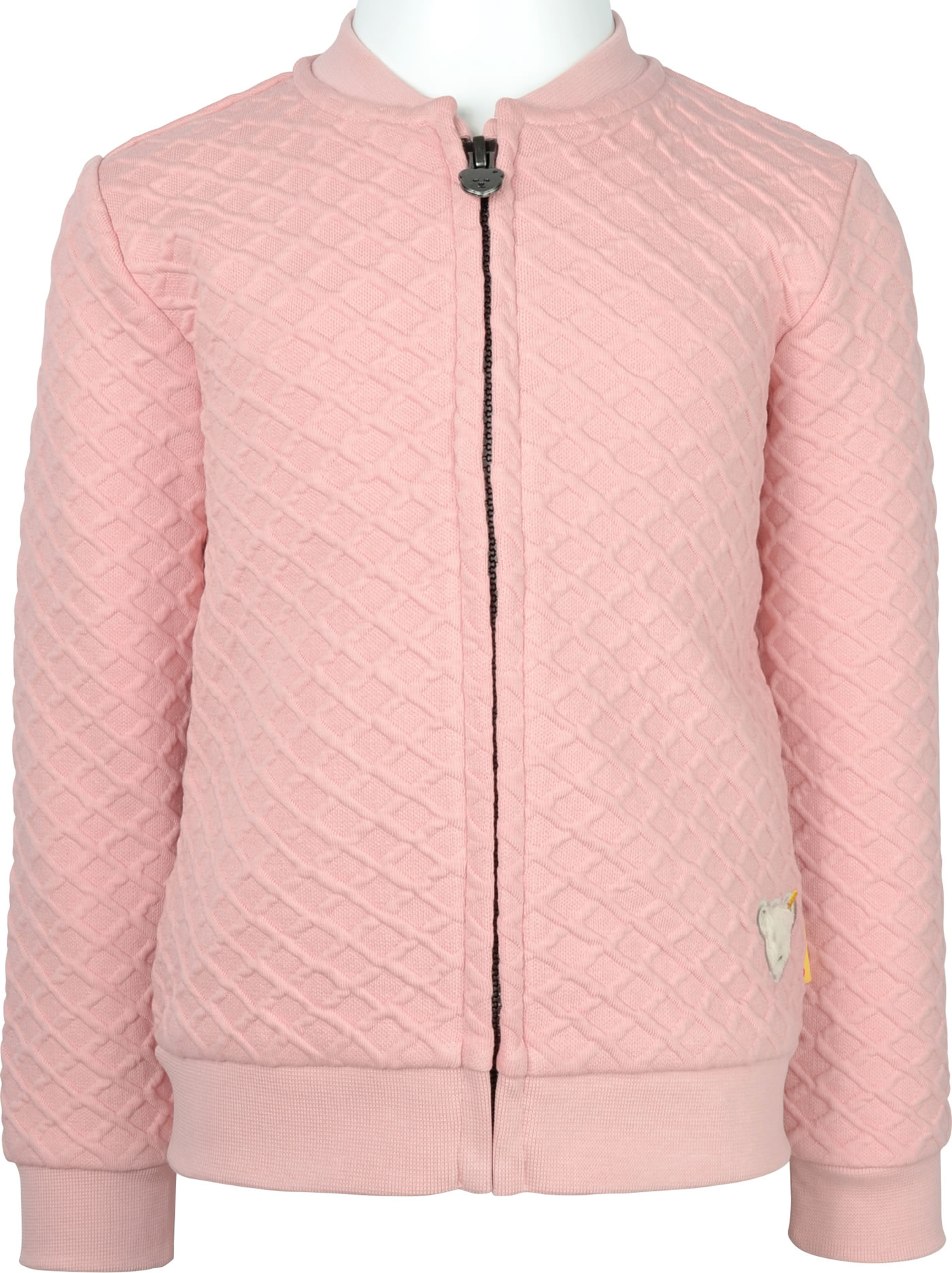 Sweatjacke im College-Stil für Mädchen aus der Wild City-Kollektion von STEIFF Die Jacke wird mit einem Reißverschluss verschlossen. Die Wabenoptik lässt die Jacke schnell zu einem Lieblingsstück werden. Der STEIFF Bär ziert die Vorderseite.