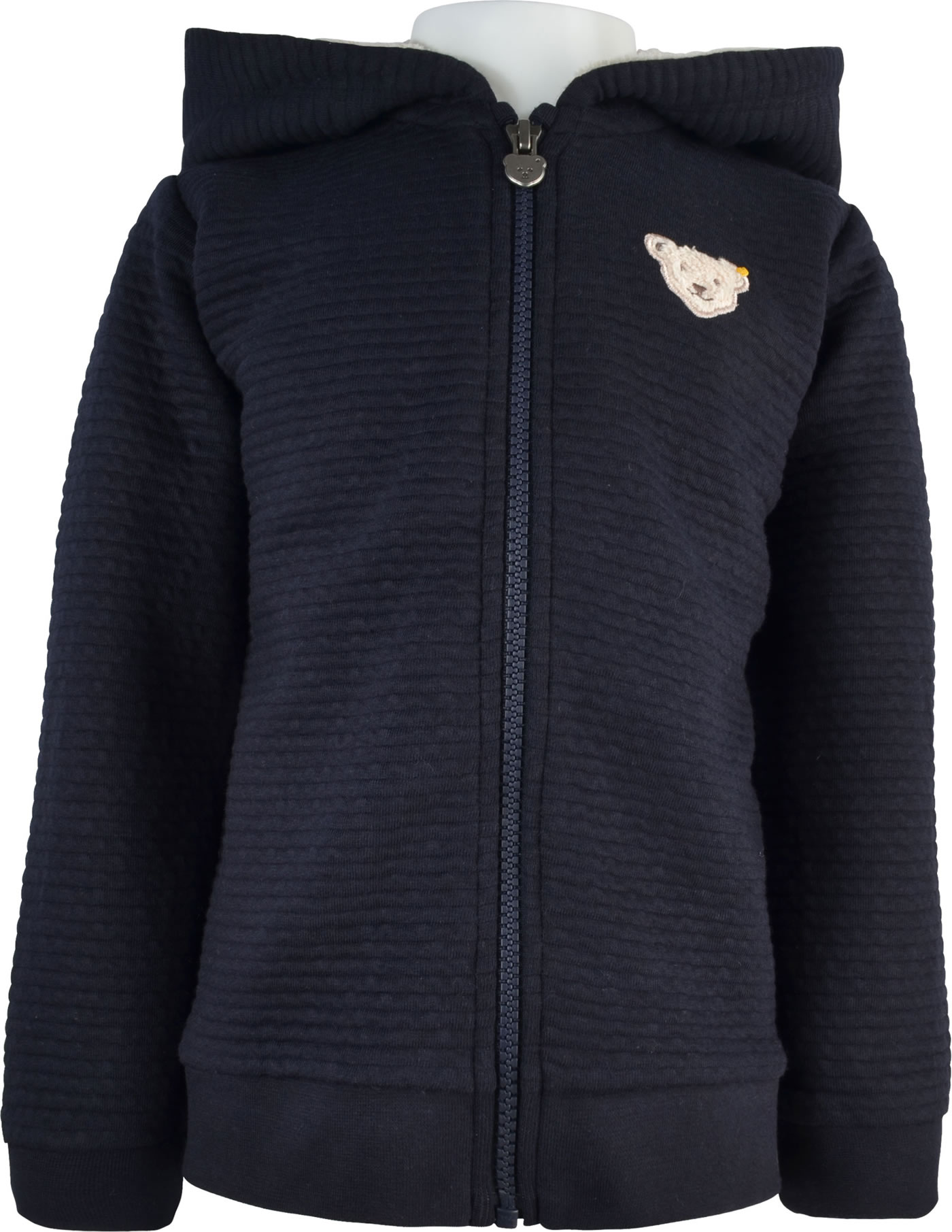 Sweatjacke mit Kapuze für Jungen aus der Year of the Teddy Bear-Kollektion von STEIFF Die Jacke wird mit einem Reißverschluss verschlossen. Der weiche Stoff mit Wellenmuster sorgt für einen hohen Tragekomfort. Das Kapuzenfutter aus Teddyplüsch sorgt für amgenehme Wärme und der STEIFF Bär ziert die Brust.