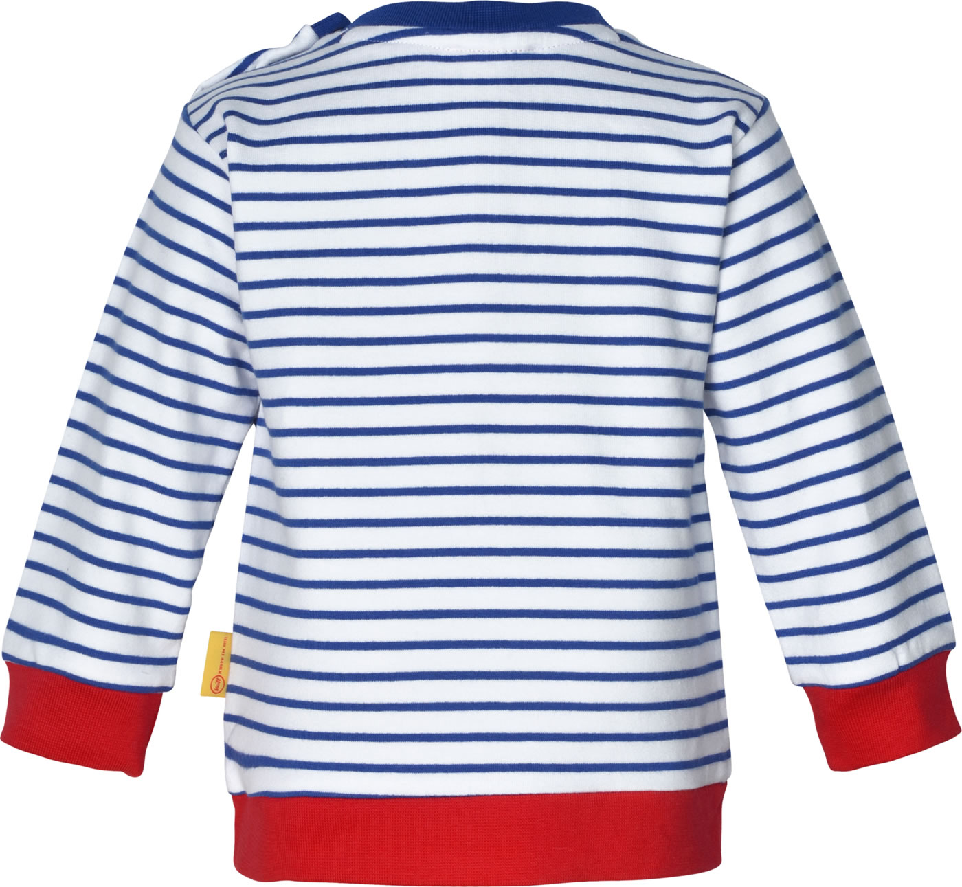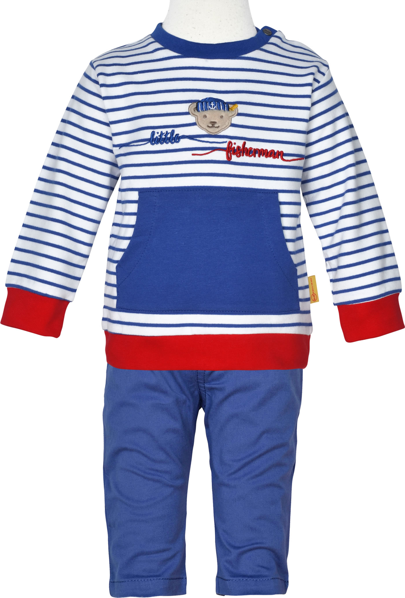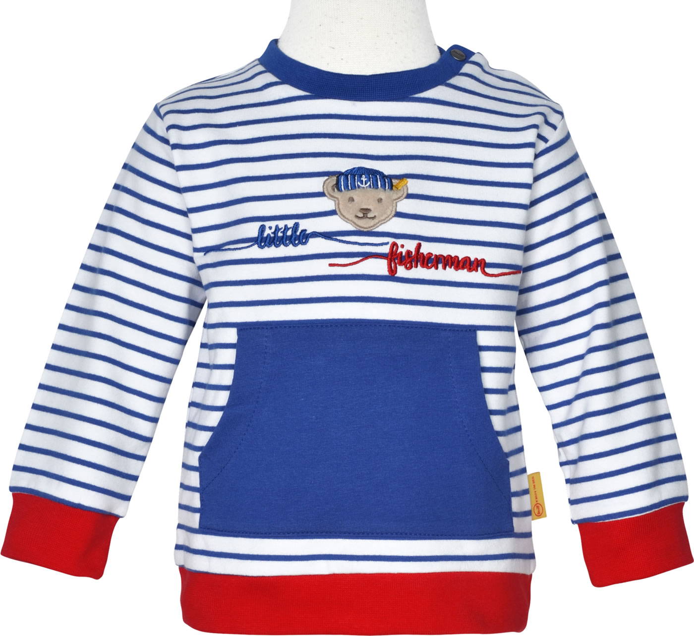 Warmes und bequemes Sweat-Shirt aus der Fish & Ship-Kollektion von STEIFF für Jungen. Der STEIFF Bär mit Matrosenmütze und Stick-Applikation ziert die Vorderseite. Schöne Details sid die farblich abgesetzten Bündchen und die Bauchtasche. Druckknöpfe auf der Schulter erleichtern das An- und Ausziehen.
