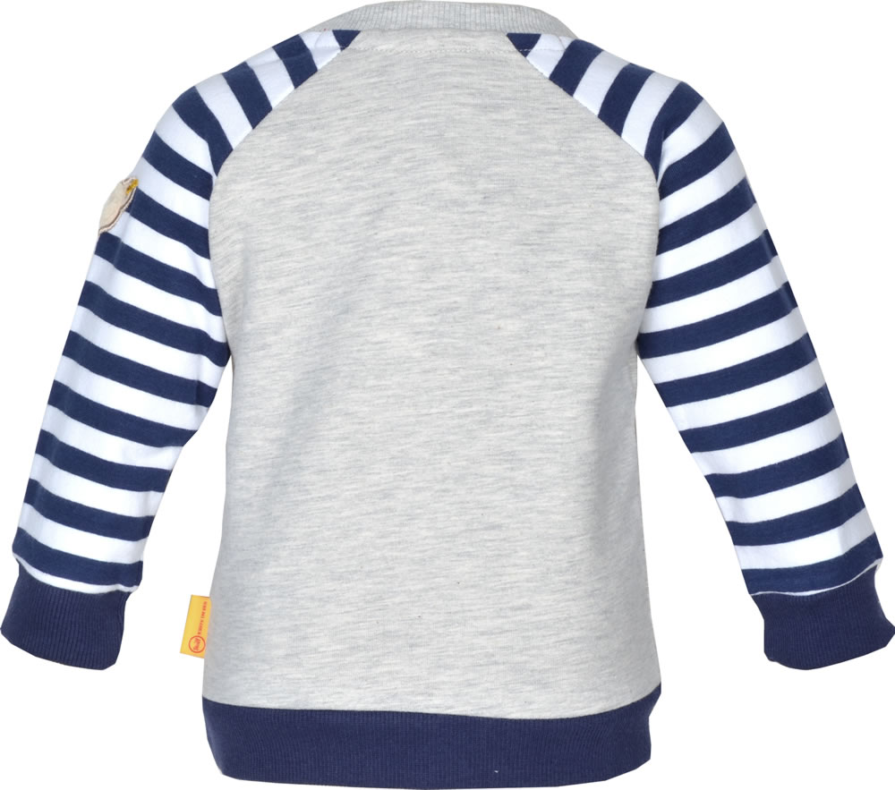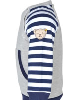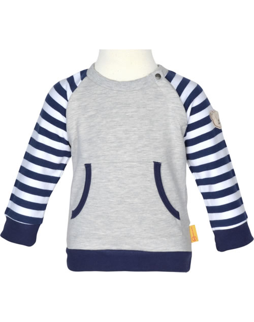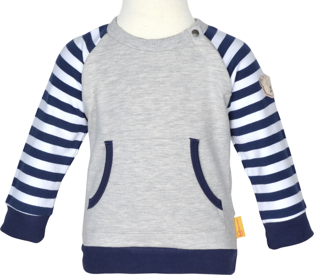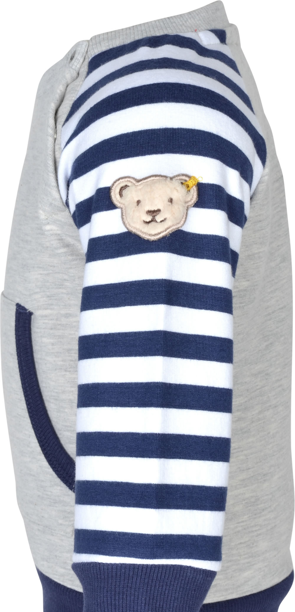 Graues Sweatshirt für Jungen von STEIFF aus der aktuellen Cosy Blue-Kollektion. Ein besonderer Hingucker ist natürlich die STEIFF Bären-Applikation auf dem linken Ärmel und das Streifendesign der Ärmel. Eine Bauchtasche bietet Platz für kleine Schätze. Die Innenseite ist angeraut und macht das Sweat-Shirt kuschelig weich und warm.