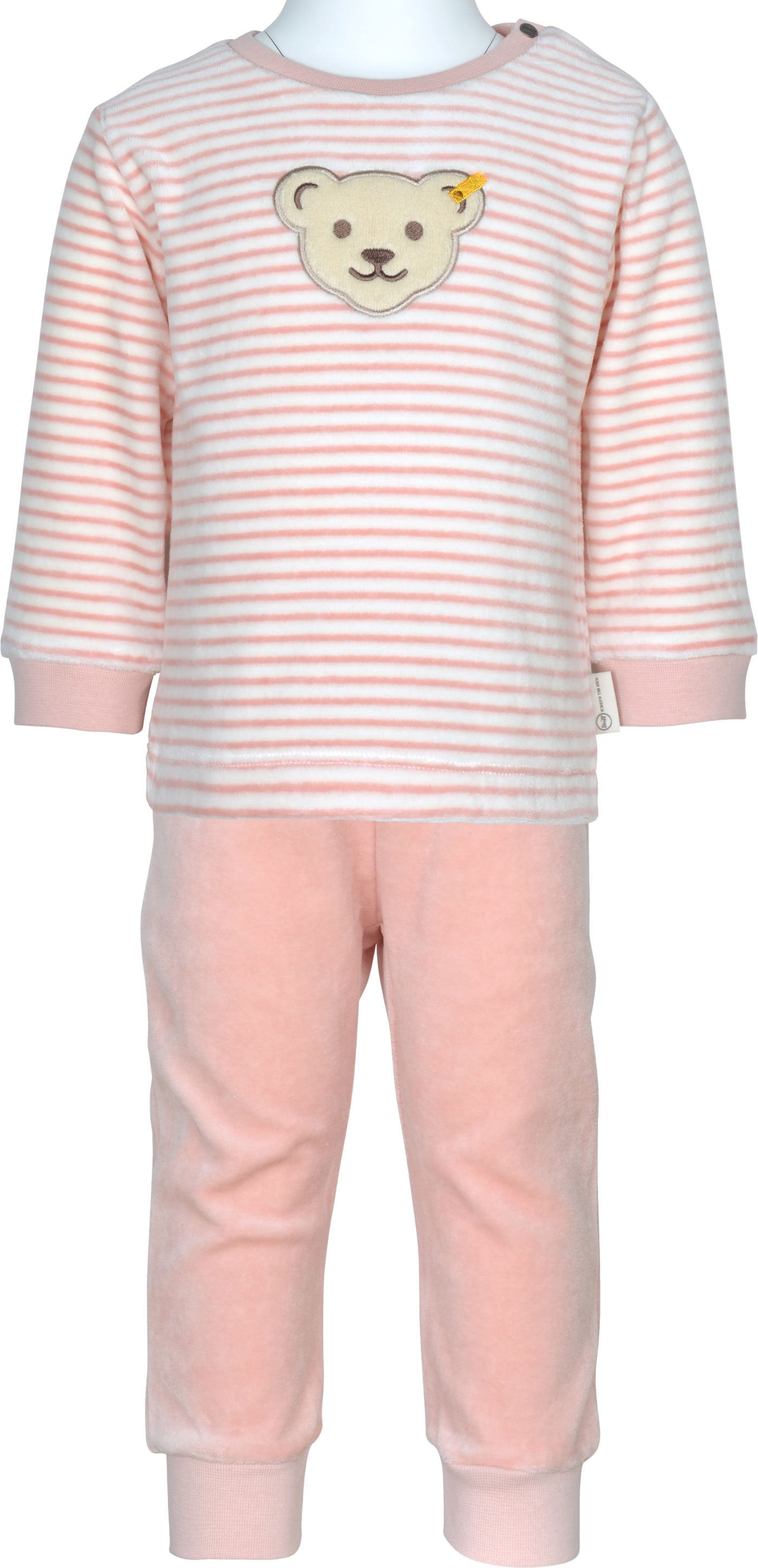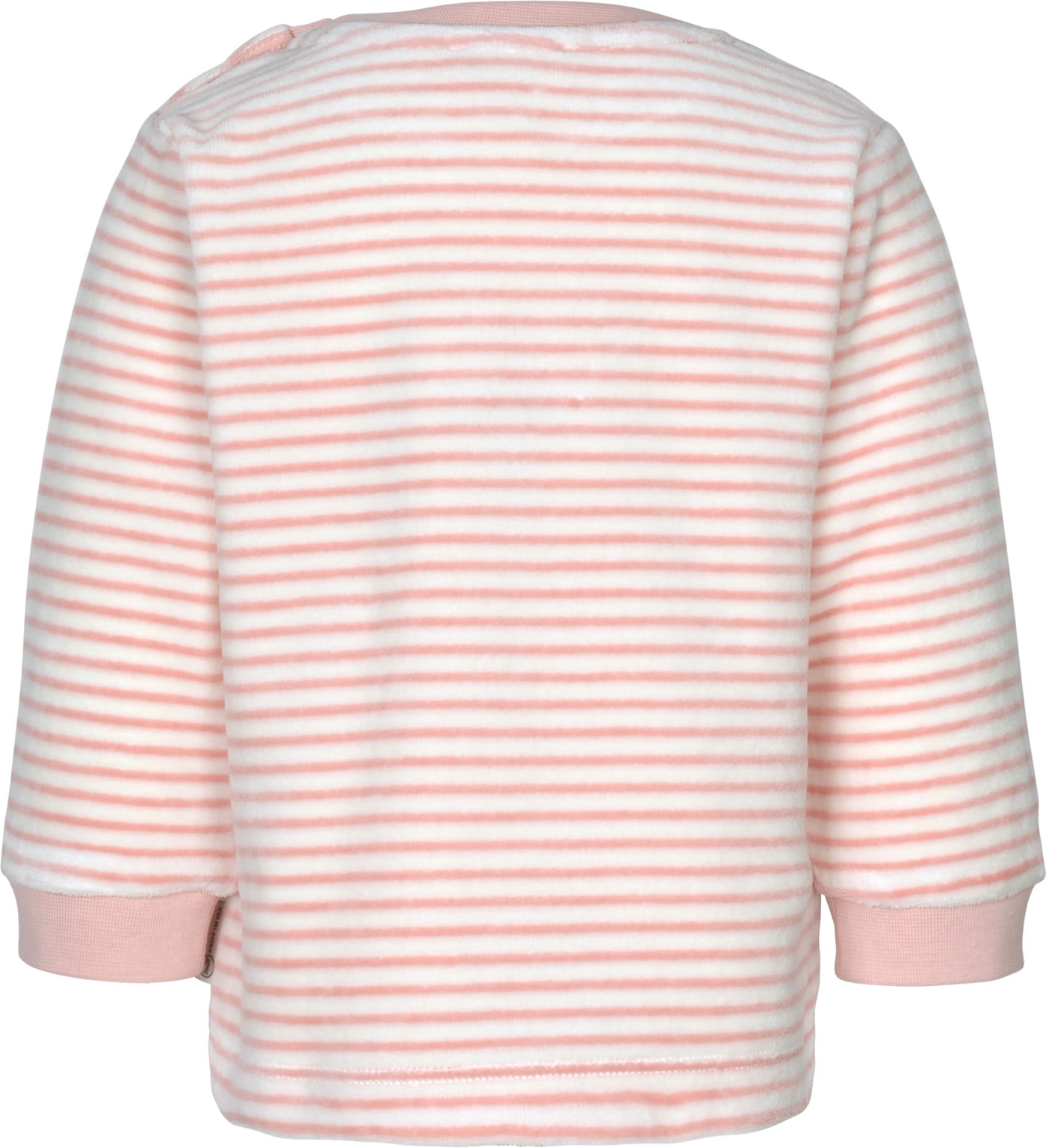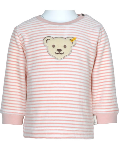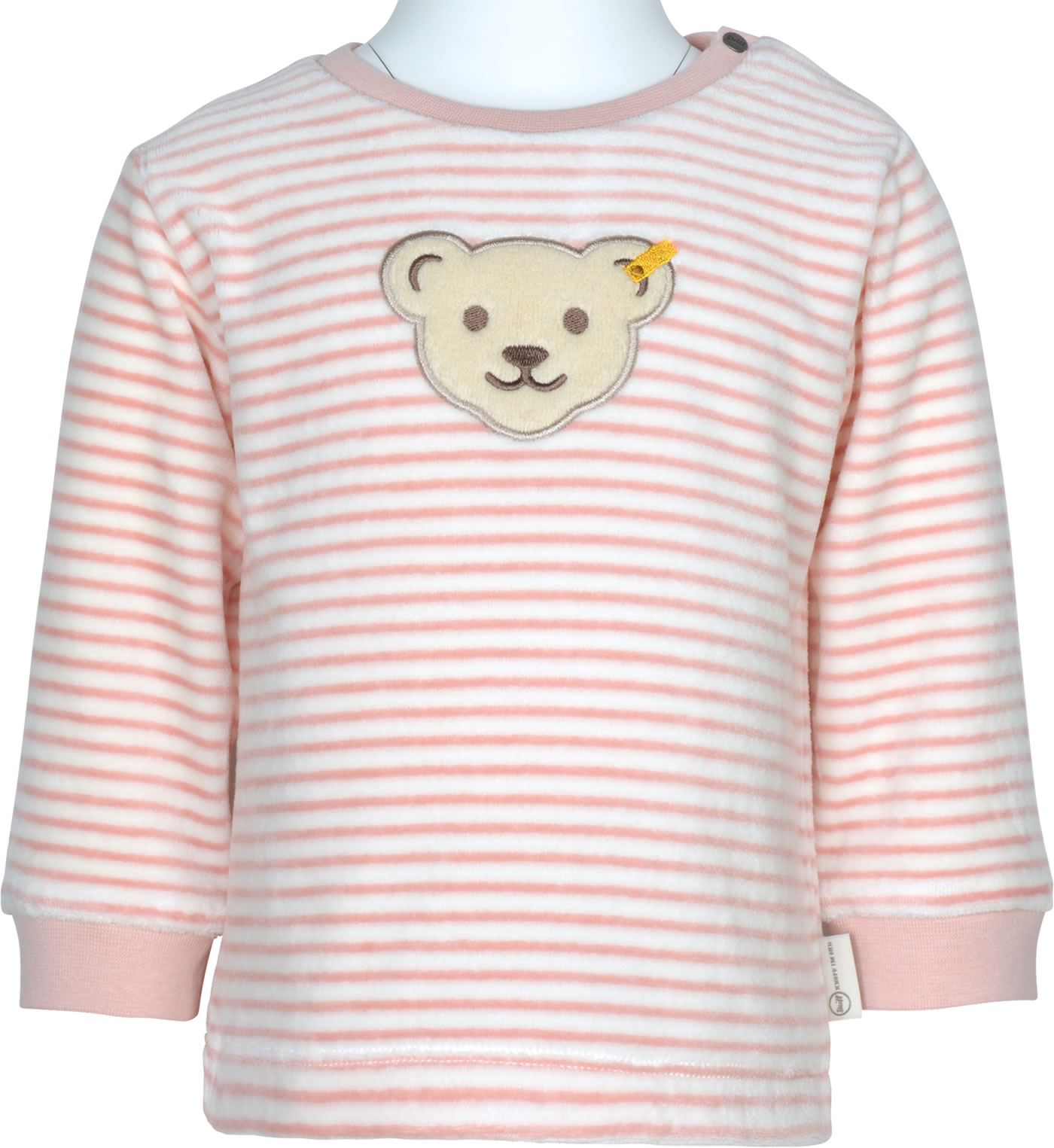 Hübsche Sweatshirt aus weichem Nicki- Material aus der Organic Dots-Kollektion von STEIFF. Der STEIFF Bär ziert die Vorderseite des geringelten Shirts. Zwei Druckknöpfe am Halsausschnitt erleichetrn das An-und Ausziehen.