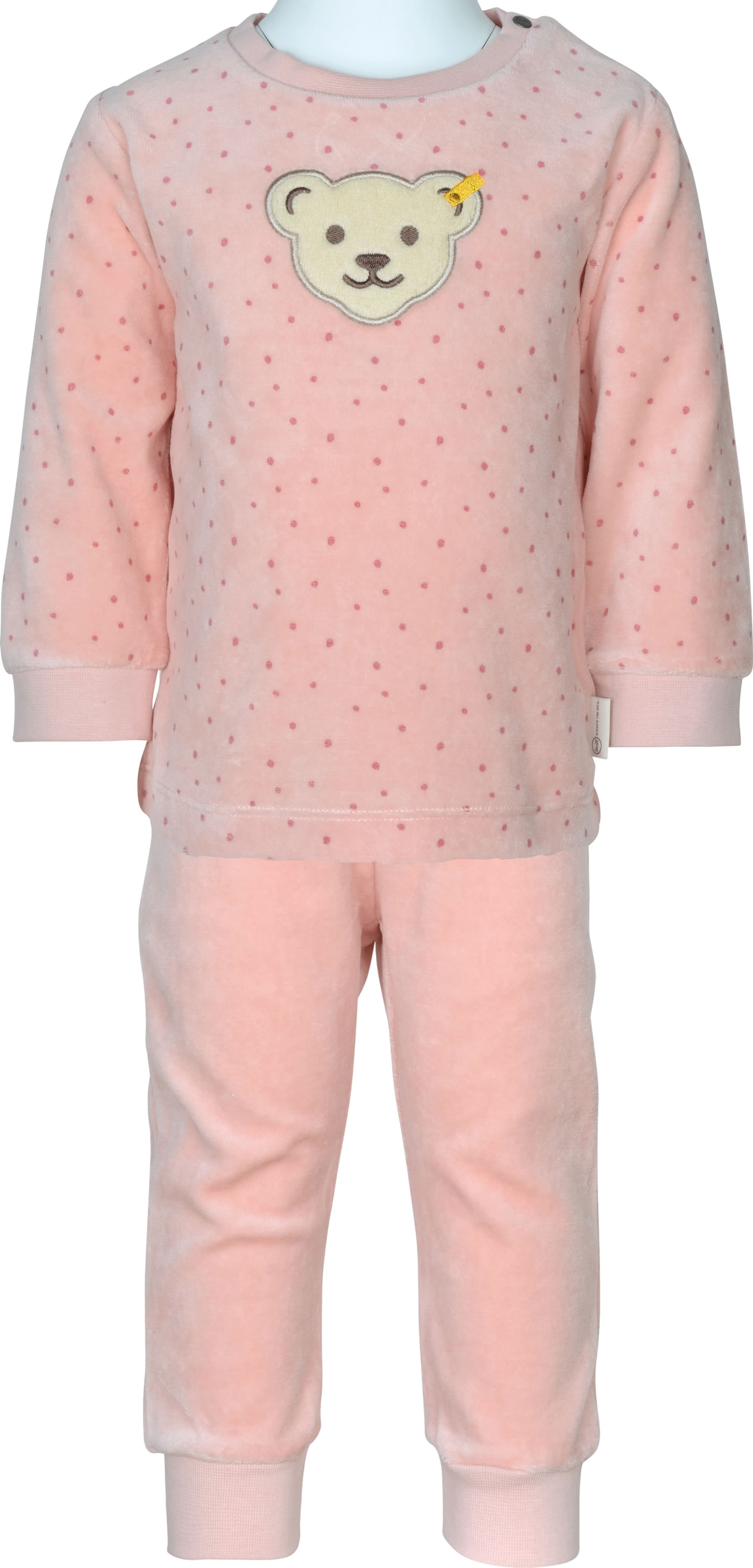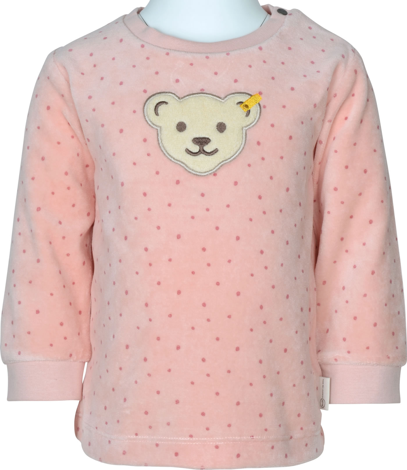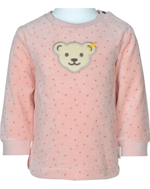 Hübsche Sweatshirt aus weichem Nicki- Material aus der Organic Dots-Kollektion von STEIFF. Der STEIFF Bär ziert die Vorderseite des gepunkteten Shirts. Zwei Druckknöpfe am Halsausschnitt erleichetrn das An-und Ausziehen.