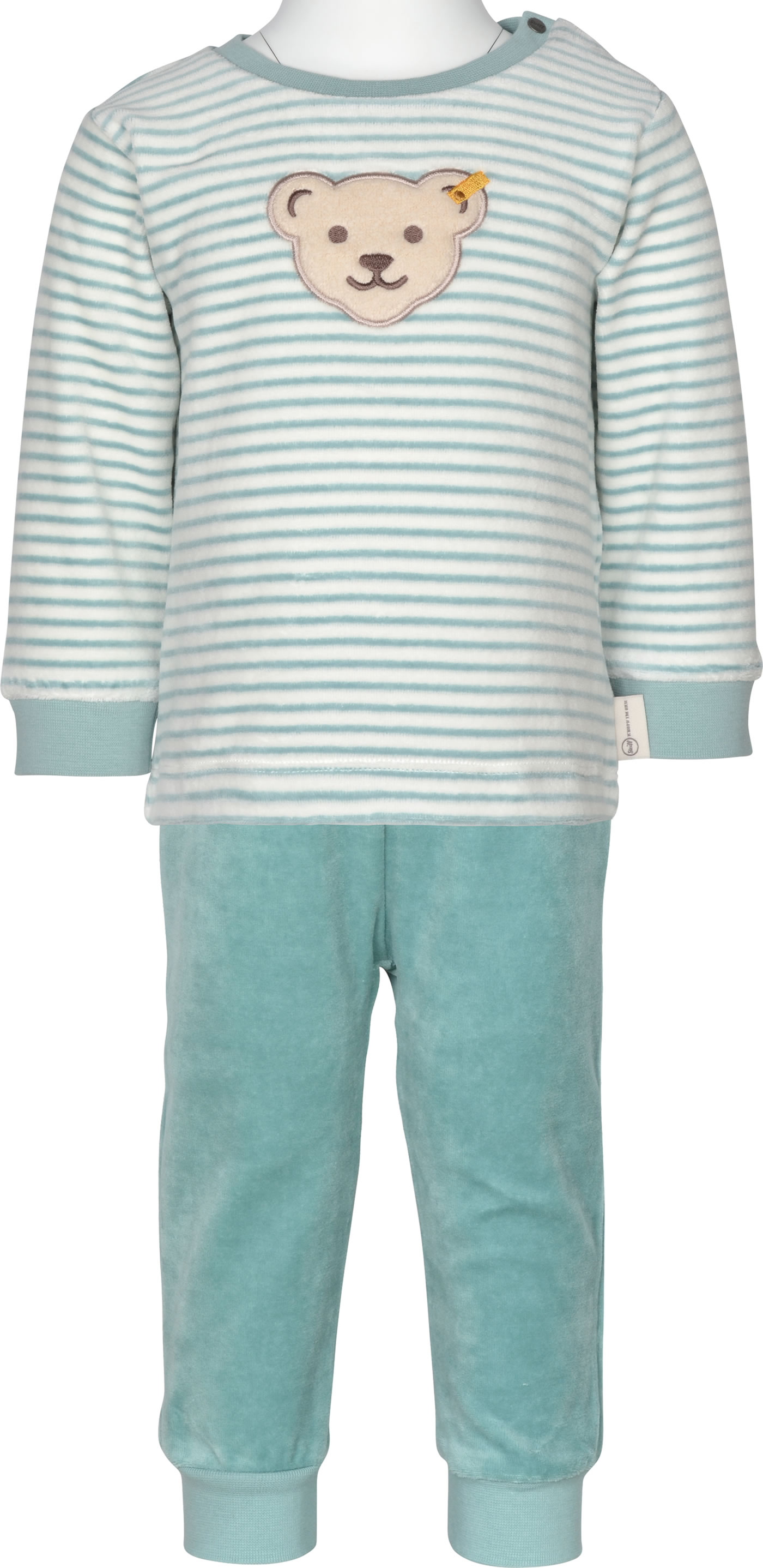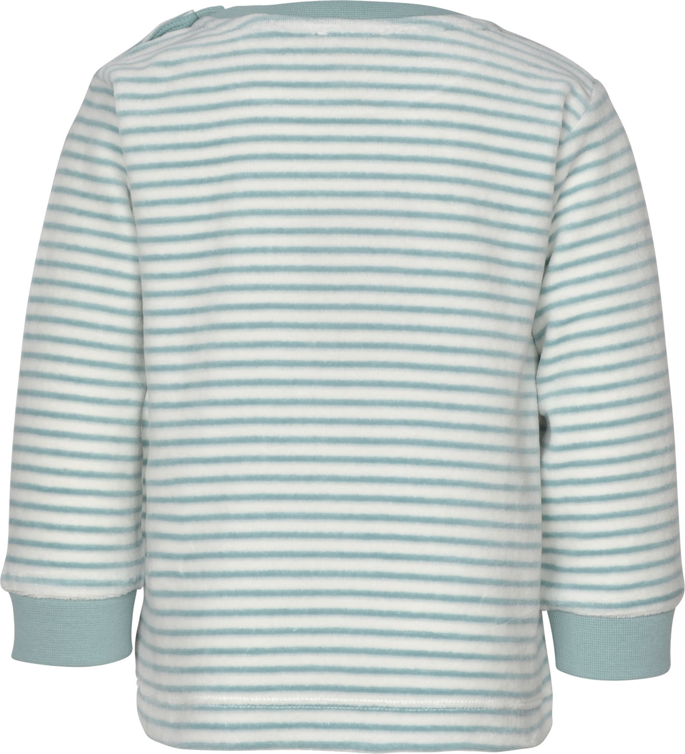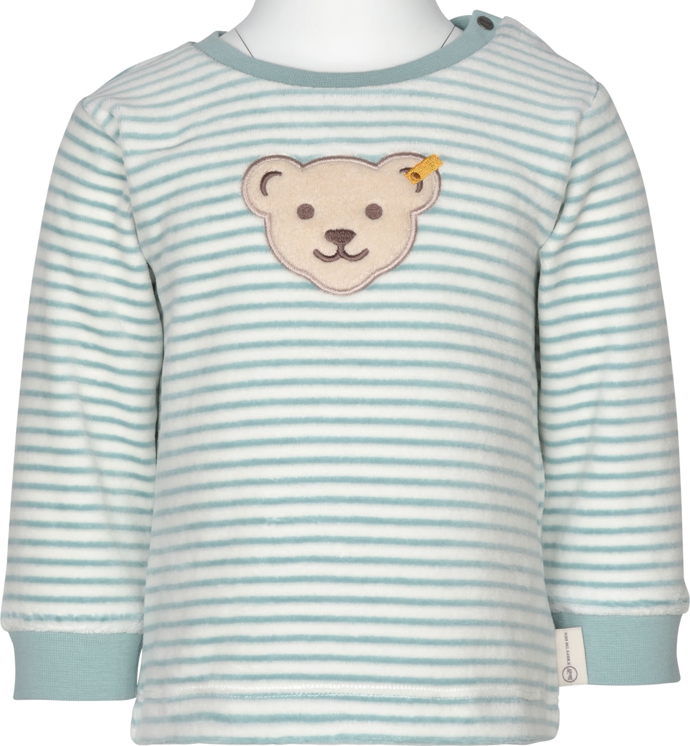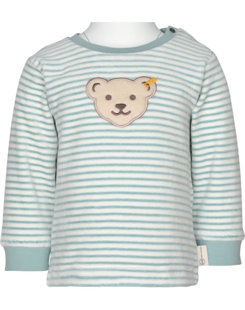Hübsche Sweatshirt aus weichem Nicki- Material aus der Organic Dots-Kollektion von STEIFF. Der STEIFF Bär ziert die Vorderseite des geringelten Shirts. Zwei Druckknöpfe am Halsausschnitt erleichetrn das An-und Ausziehen.