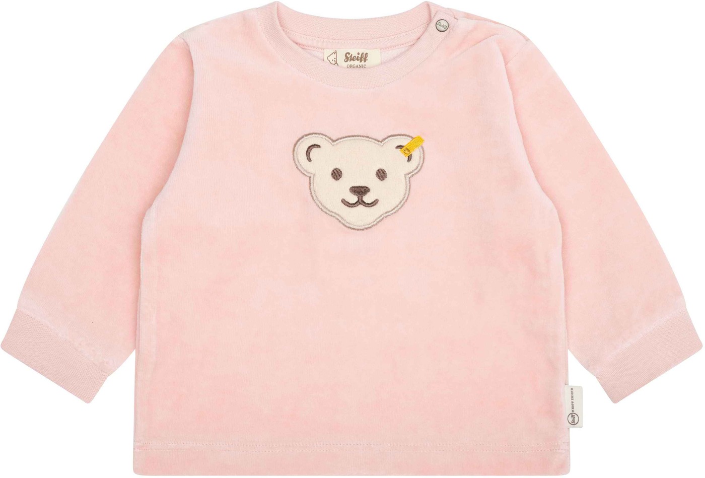 Auf der Vorderseite sorgt ein flauschiges Steiff Teddybär-Motiv für einen liebevollen Blickfang.