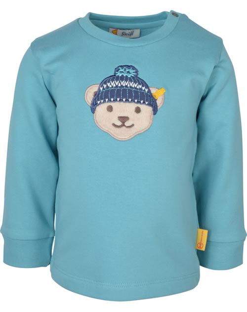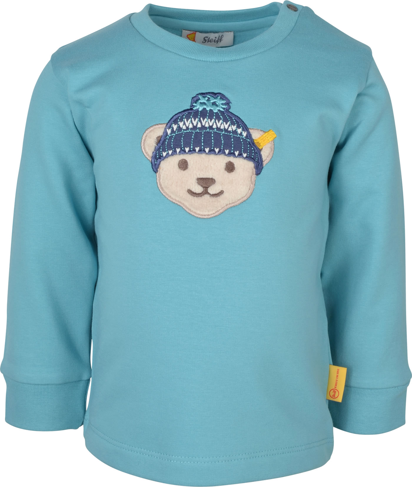 Sweatshirt für Jungen aus der Wolfls Land-Kollektion von STEIFF. Ein toller Hingucker ist der STEIFF Bär mit Mütze auf der Brust. Der Pullover ist innen weich angeraut und dadurch kuschelig warm für die kühleren Tage. Zwei Druckknöpfe auf der Schulter erleichtern das An- und Ausziehen.