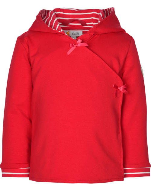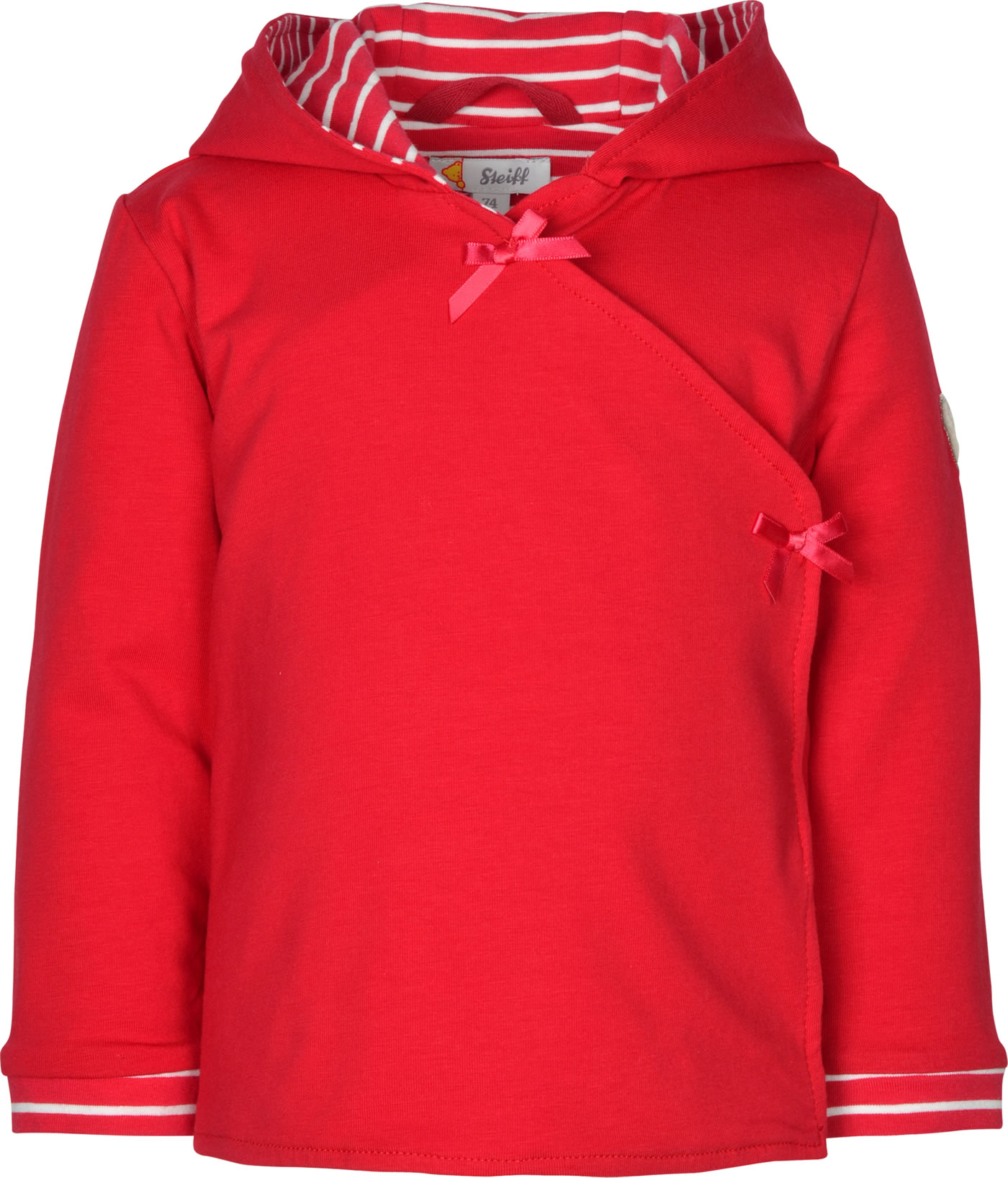 Hübsche Sweatshirt-Jacke in Wickeloptik mit Kapuze aus der Flying away-Kollektion von STEIFF für Mädchen. Von innen ist die Sweatshirtjacke mit geringeltem Jerseyfutter ausgestattet. Sie läßt sich mit Druckknöpfe verschließen, die von kleinen Schleifen geziert werden. Ein tolles Detail ist die STEIFF Bären Applikation auf dem linken Arm..