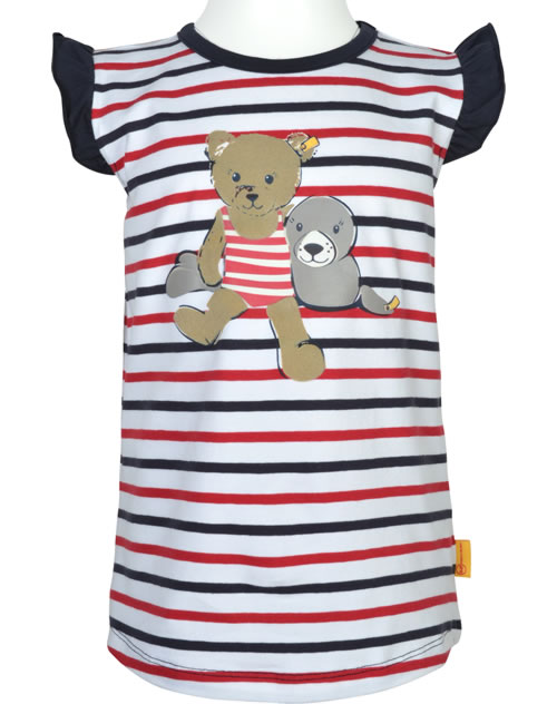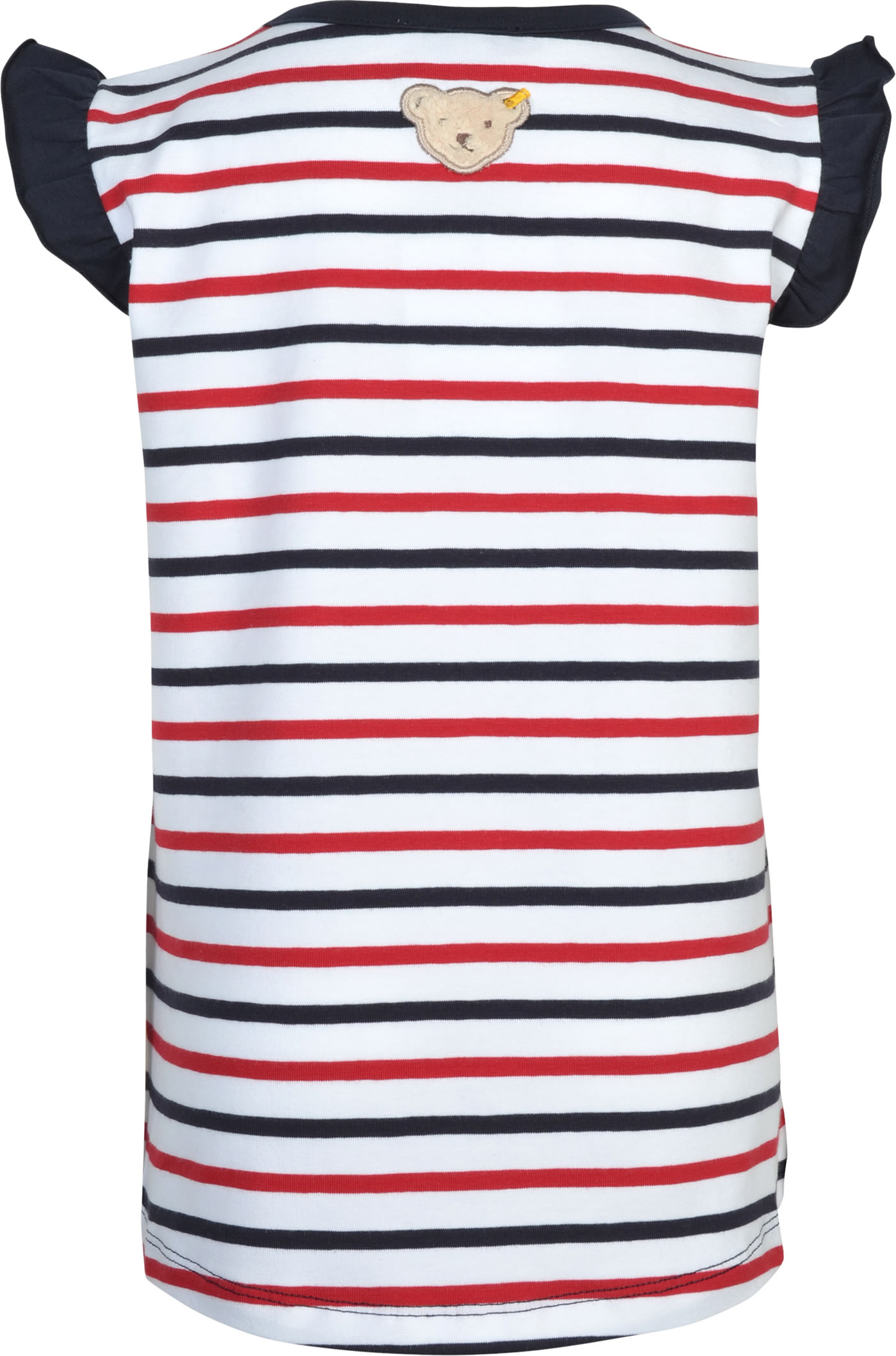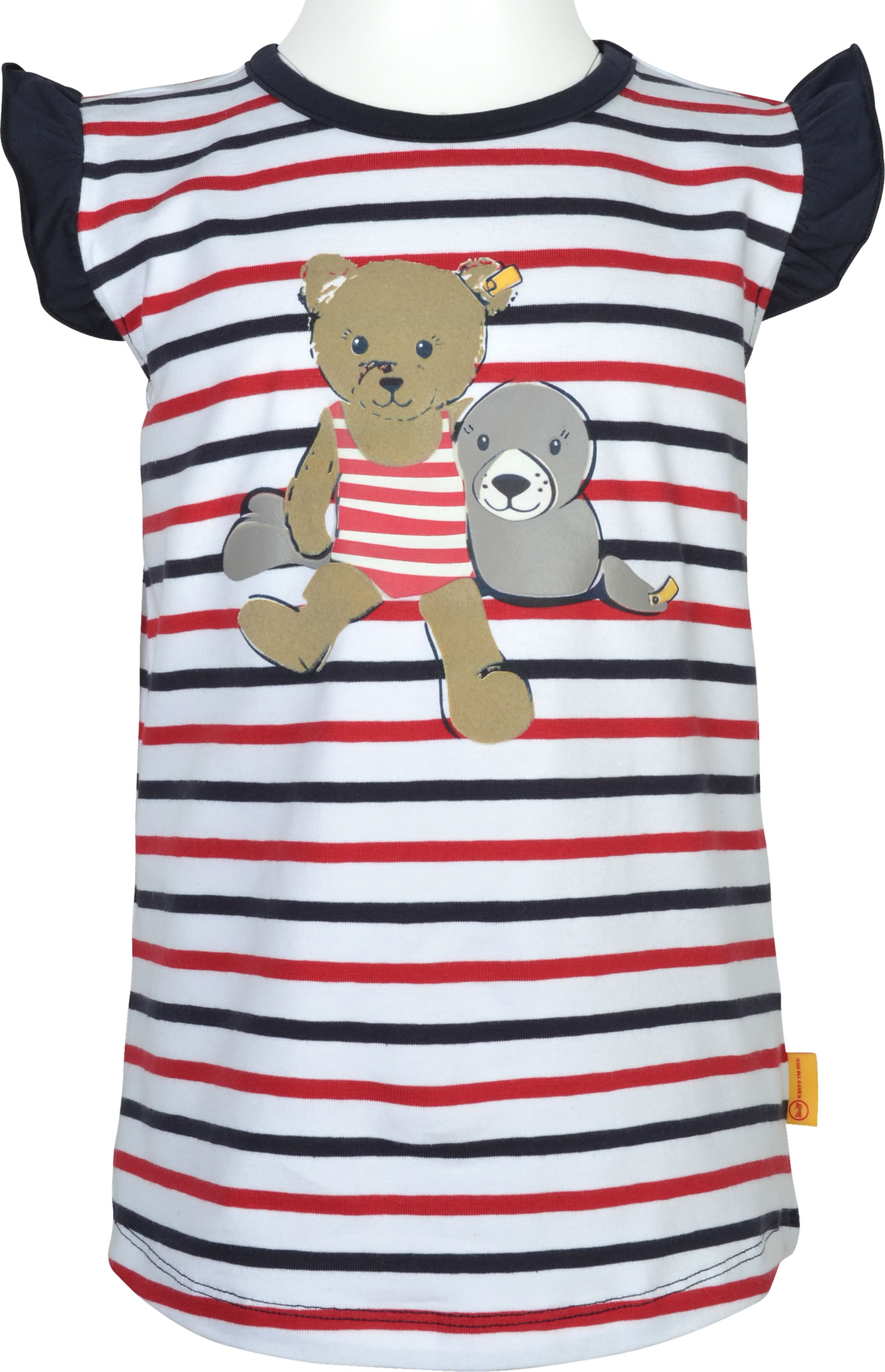Gestreiftes T-Shirt mit Flügelarm für Mädchen aus der Beach Please-Kollektion von STEIFF. Der Print mit STEIFF Bär und kleiner Robbe machen dieses Shirt schnell zu einem Lieblingsstück. Schöne Details sind außerdem die Rüschen an den Ärmeln und der STEIFF Bär aus Plüsch auf der Rückseite.