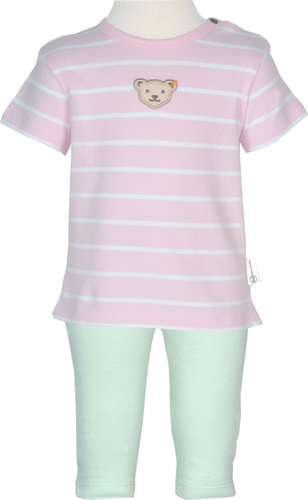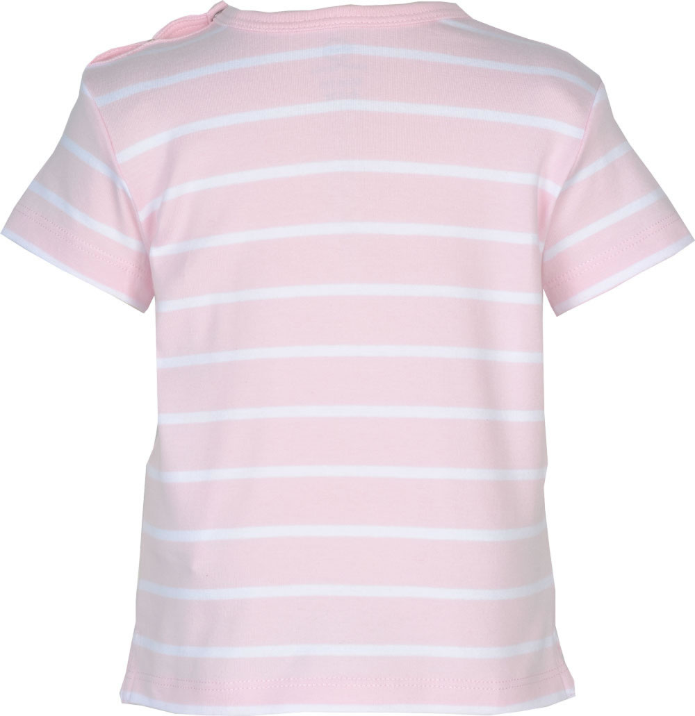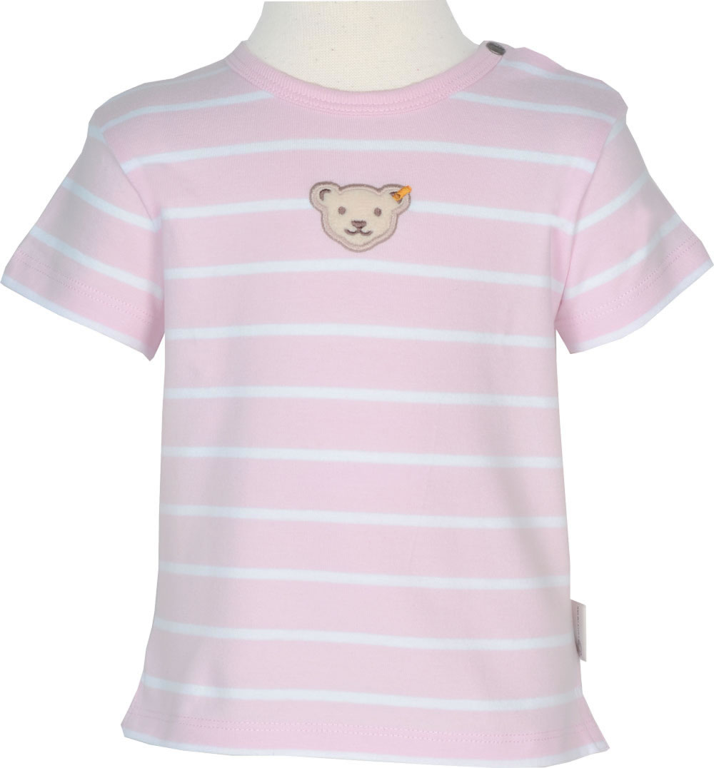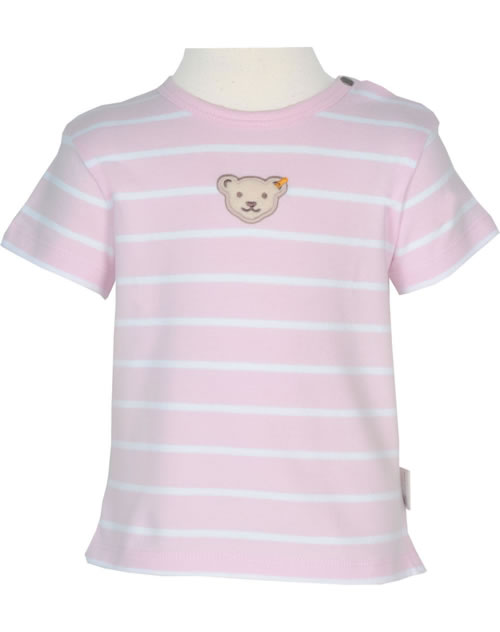 Hübsches T-Shirt aus der aktuellen-Kollektion für Mädchen von STEIFF. Das rosa kurzarm T-Shirt ist mit weißen Streifen versehen und die Brust ziert der kuschelige Steiff-Bärenkopf. Das STEIFF-Logo-Fähnchen befindet sich in an der linken Seitennaht. Zwei Druckknöpfe am Halsausschnitt helfen bei An-und Ausziehen.