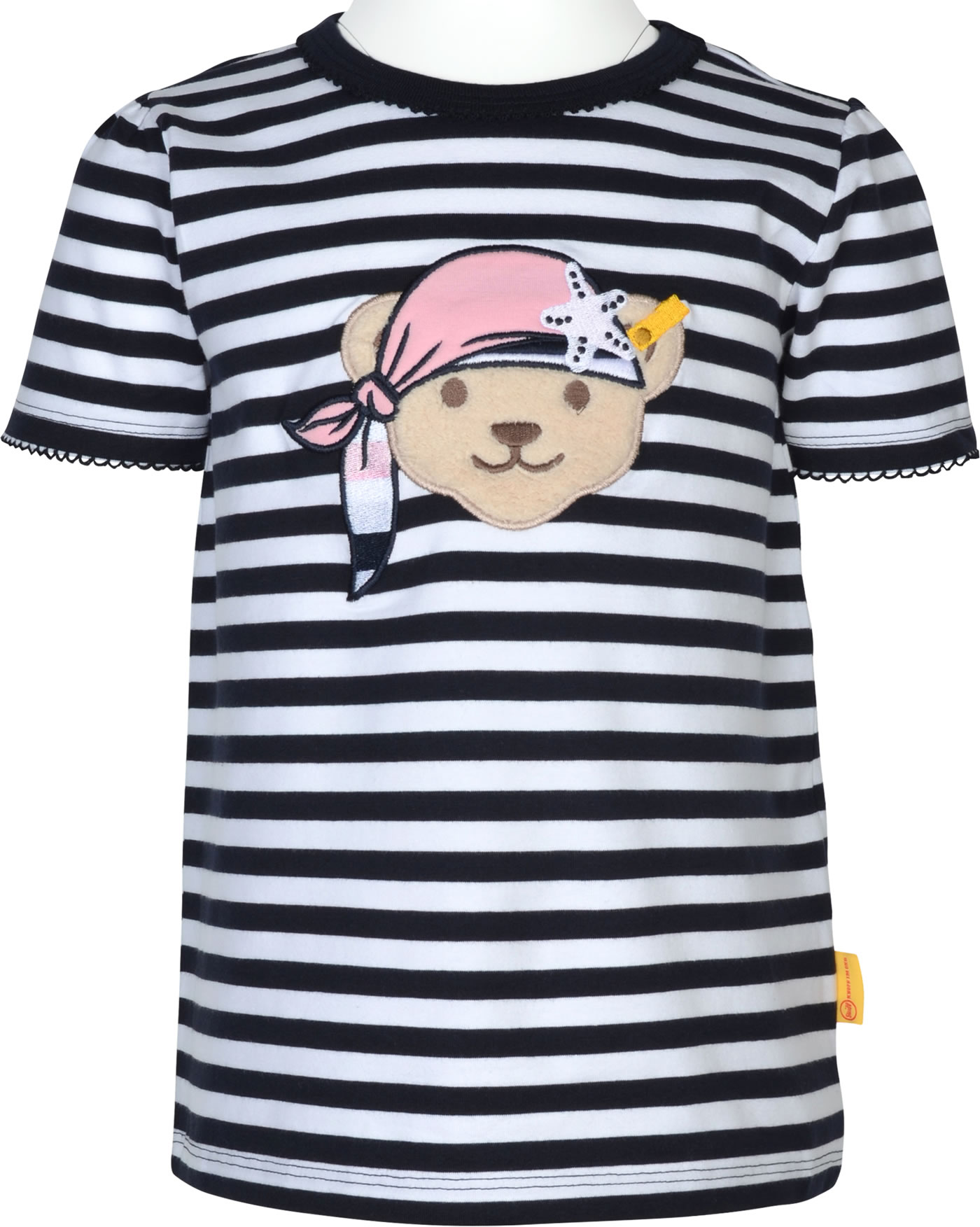 Kurzarmshirt für Mädchen aus der Beach Please Kollektion von STEIFF. Schöne Details sind die gerafften Ärmel, die Mäusezähnchenkanten und der STEIFF Bär mit Piratenkopftuch und Seestern auf der Vorderseite.