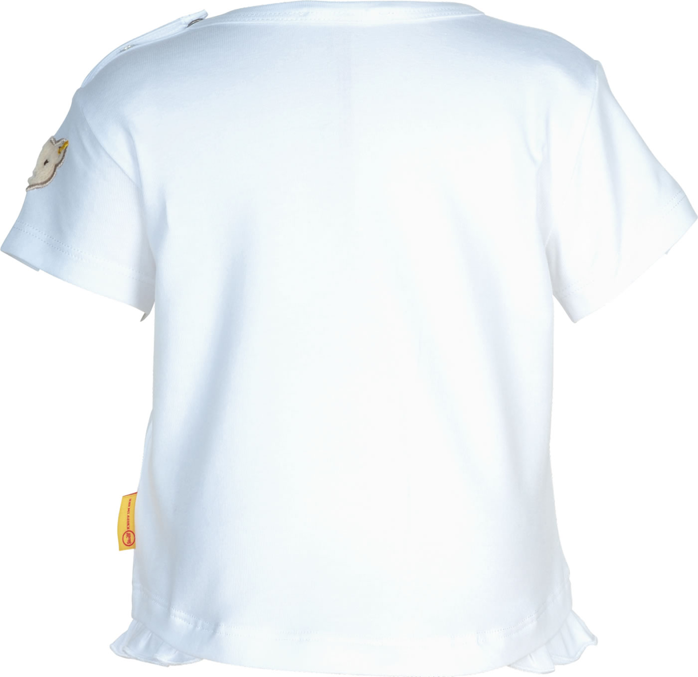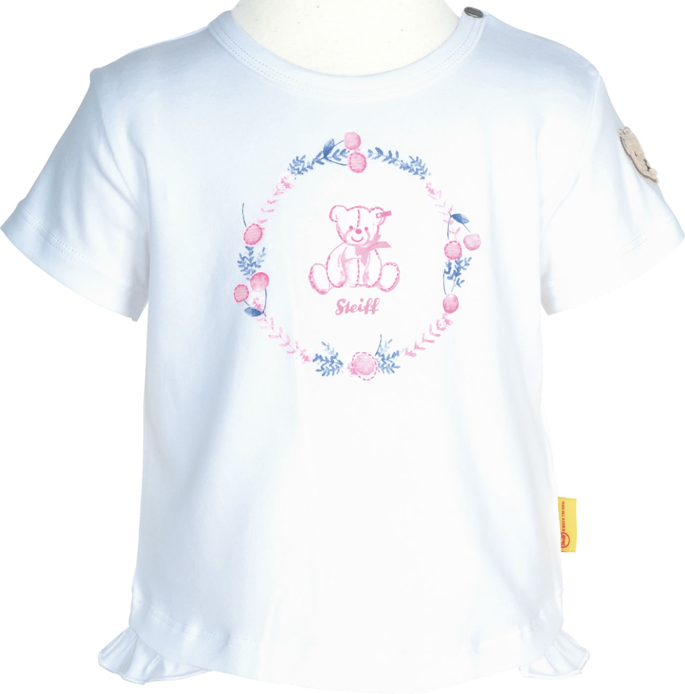 Kurzarmshirt für Mädchen aus der Bear and Cherry Kollektion von STEIFF. Der STEIFF Bär befindet sich auf dem linken Ärmel und als hübscher Print auf der Brust. Ein schönes Detail sind die seitlichen Rüschen am Saum. Drucknöpfe auf der Schulter erleichtern das An- und Ausziehen.