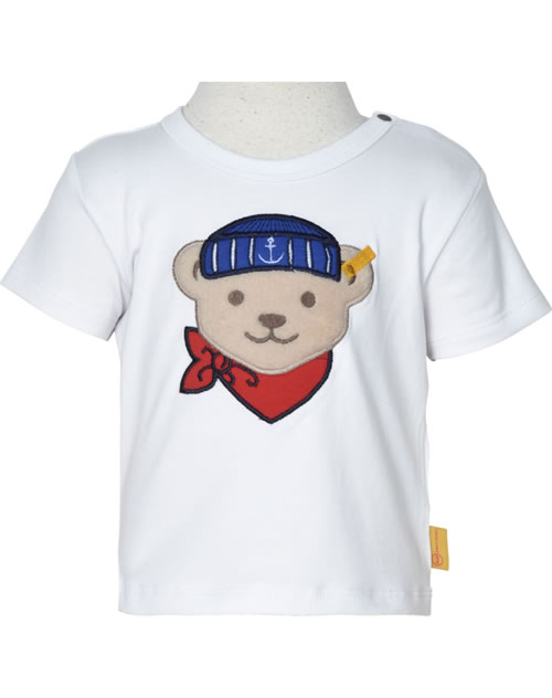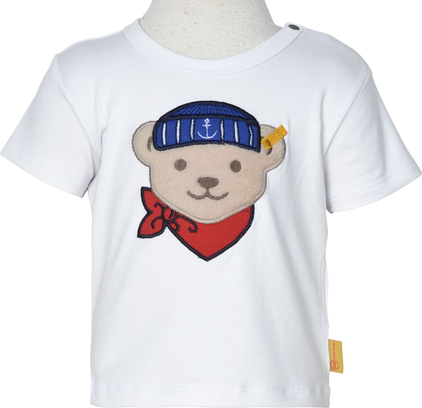 Kurzarm-Shirt für Jungen aus der Fish & Ship-Kollektion von STEIFF. Ein toller Hingucker ist der STEIFF Bär mit Matrosenmütze auf der Vorderseite. Druckknöpfe auf der Schulter erleichtern das An- und Ausziehen.